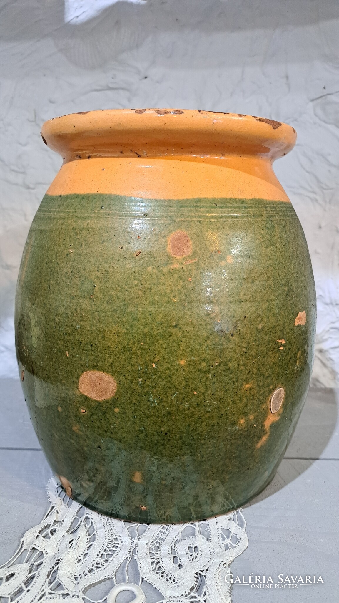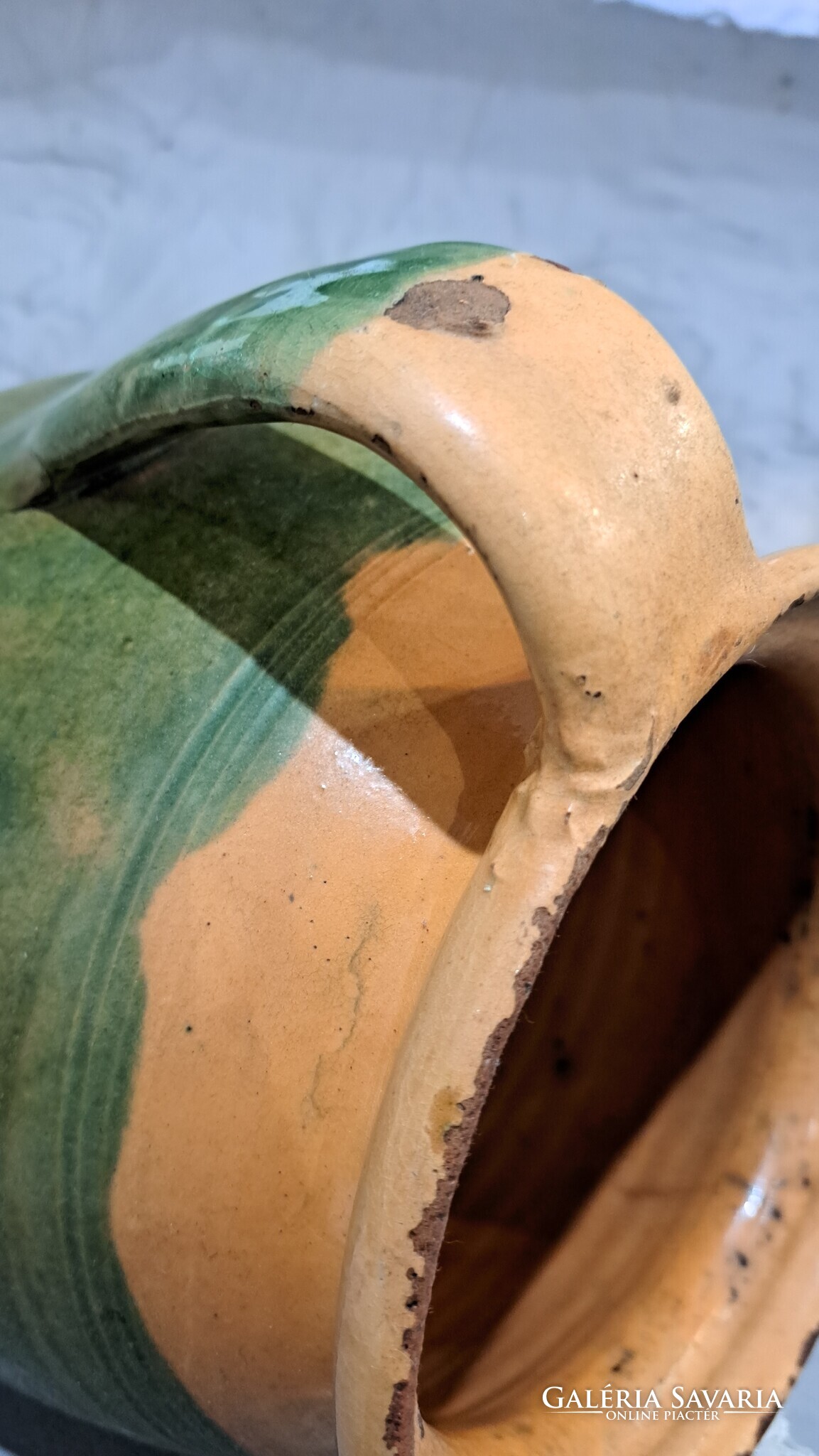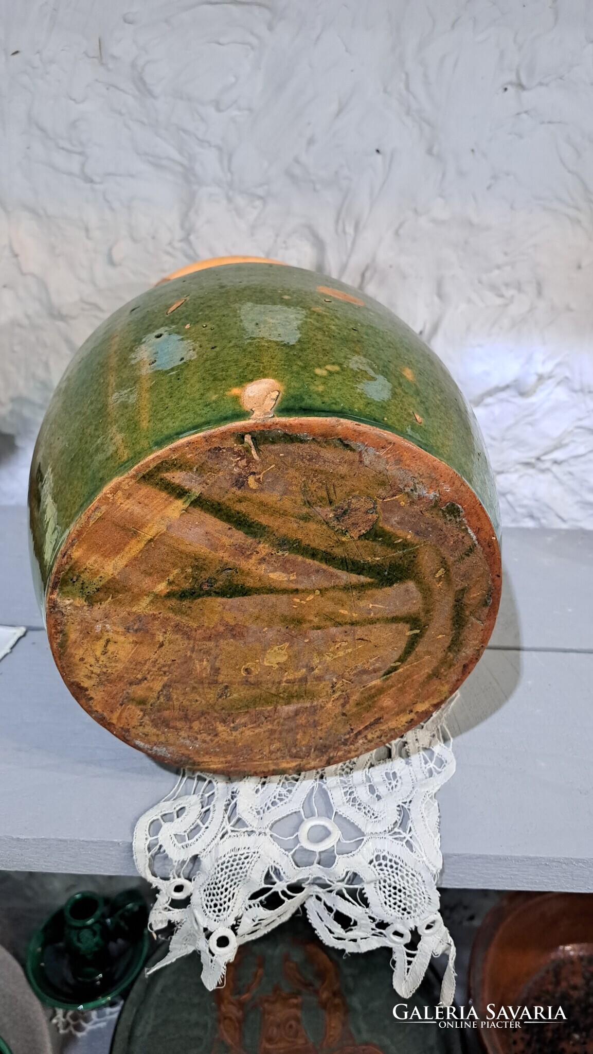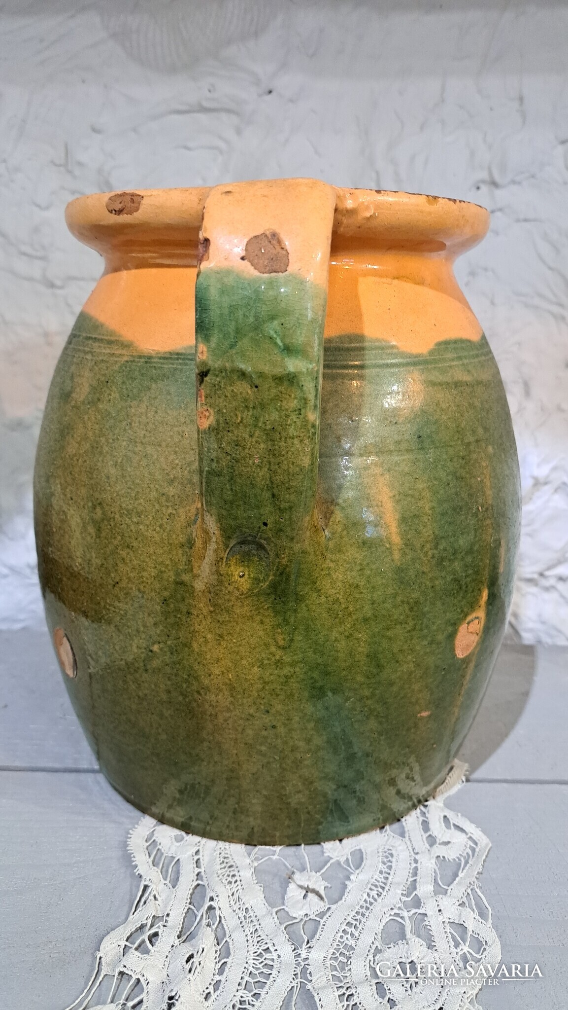 Nagyméretű zöld mázas köcsög, kerámia edény, apróbb lepattogzásokkal
