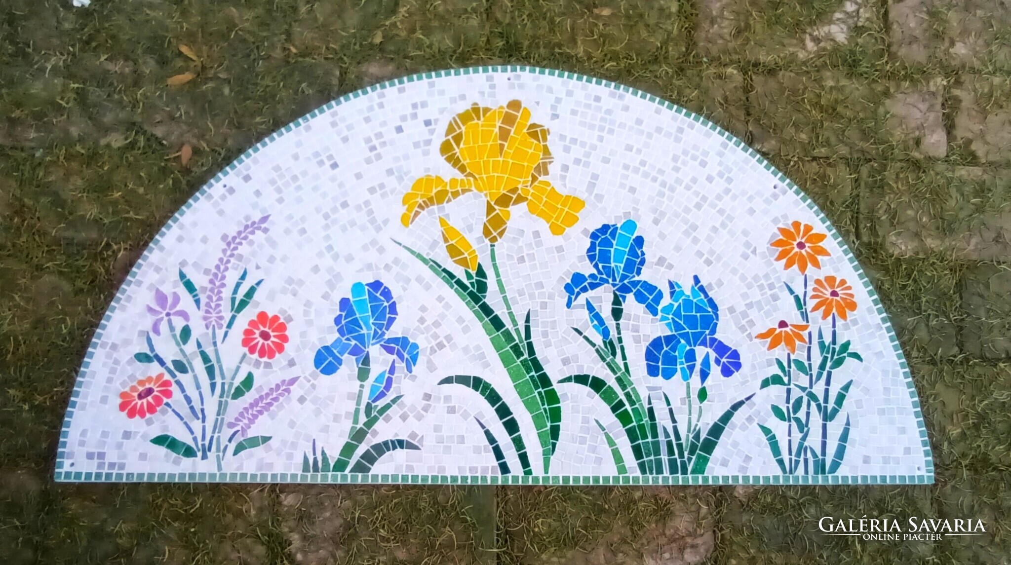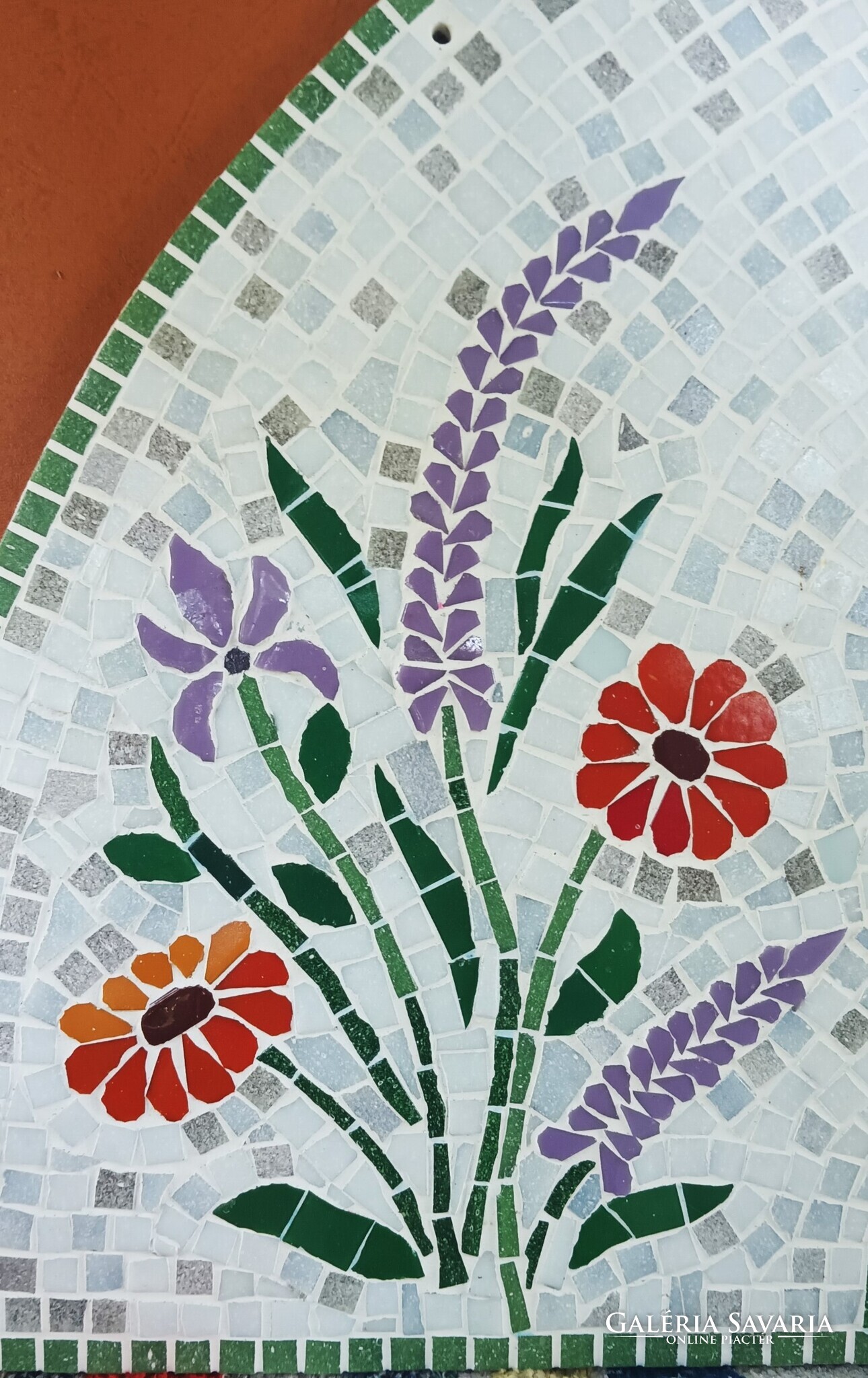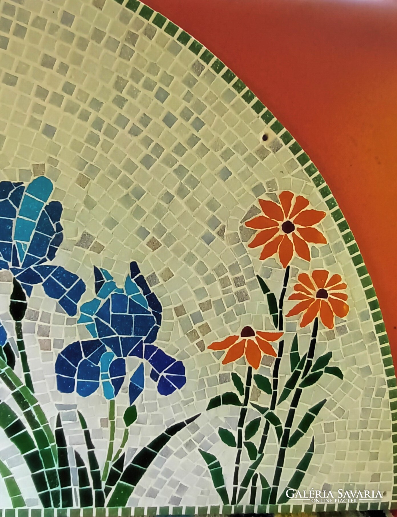 Egyedi, kézzel készült, félkör alakú mozaikos falikép, virágmintával