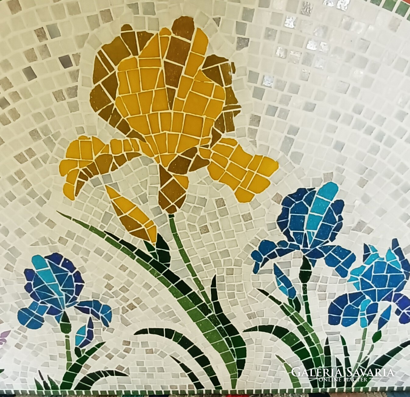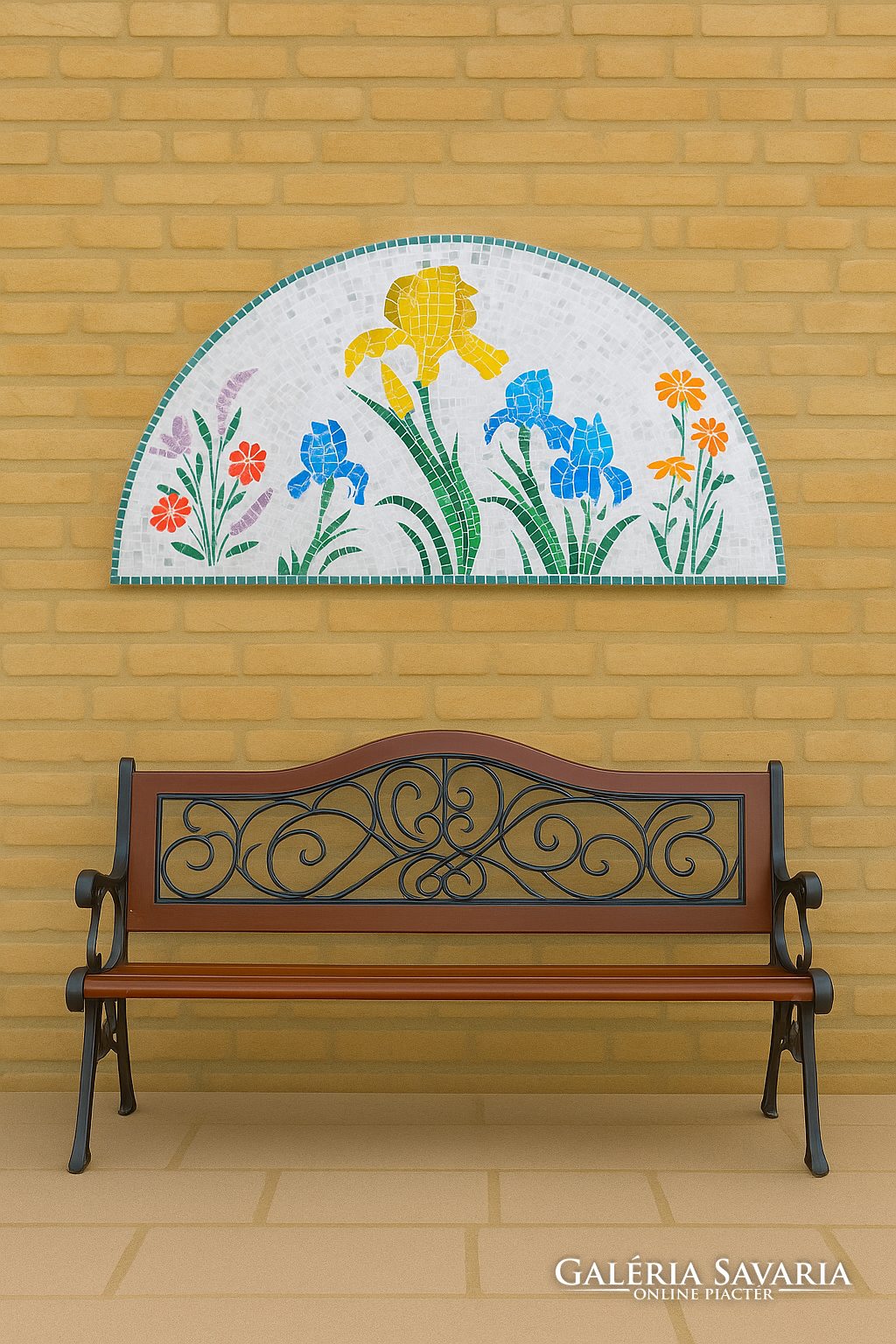 Egyedi, kézzel készült mozaikos falikép. A virágokból álló motívum modern és klasszikus környezetben is harmonikusan mutat. Különösen ajénljuk kertekbe vagy közösségi terekbe.