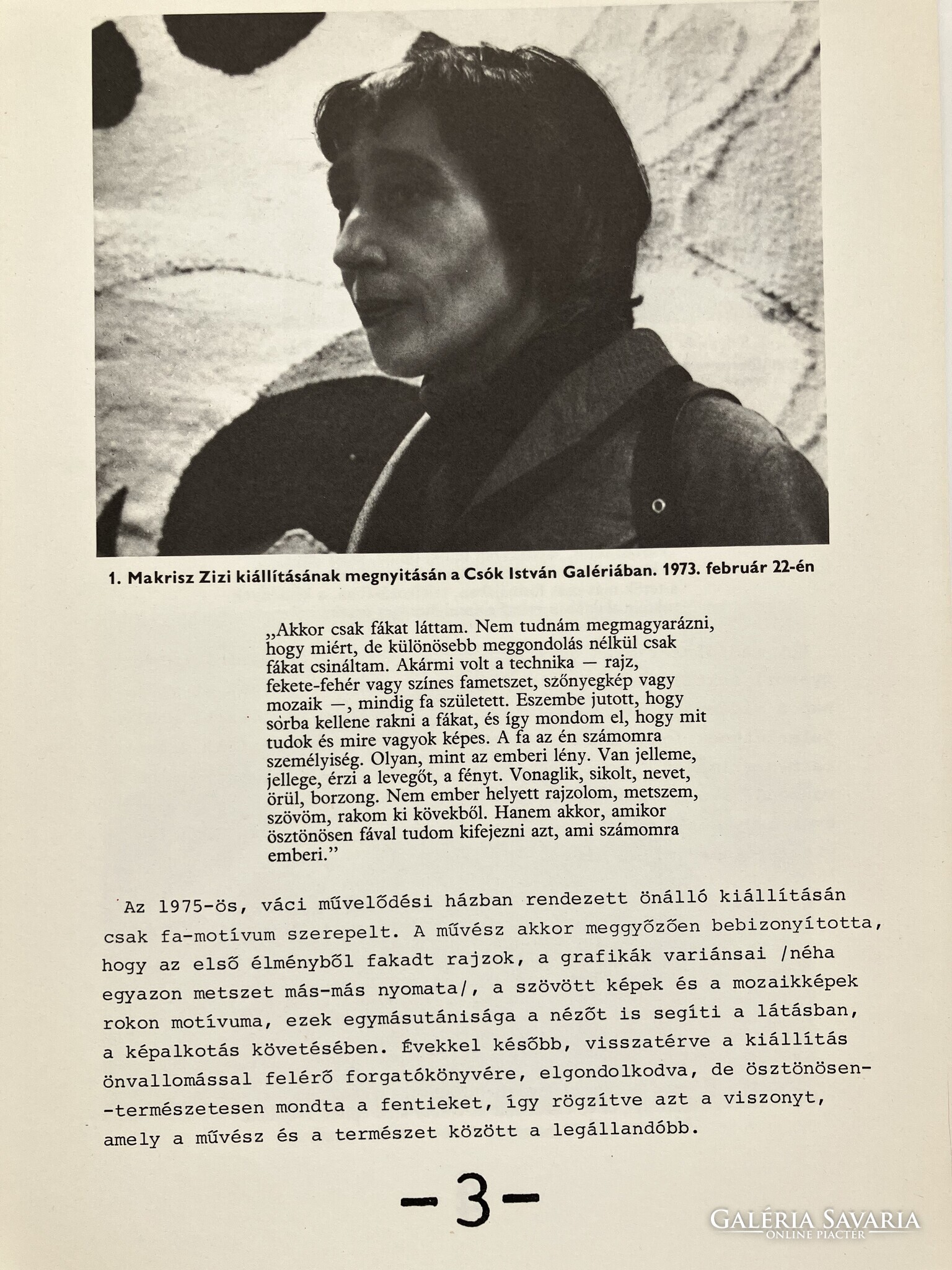 Makrisz Zizi (1924-2014) munkásságába kaphatunk kis betekintést ezen a kiadványon keresztül. Grafikusként kezdett, majd hatalmas méretű mozaikképeket készített. Munkácsy díjas érdemes magyar művész. Értékes és benyomást keltő munkáin színes illusztrációk vezetik végig az olvasót. Kifejezte azt a viszonyt, ami a művész és a természet között a legállandóbb.