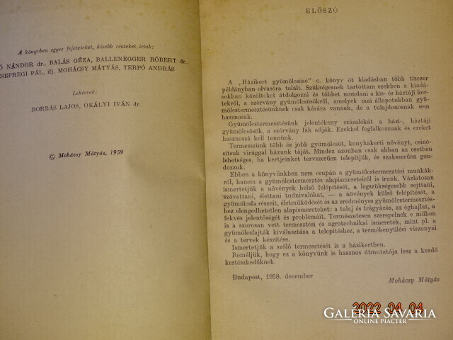 MOHÁCSY MÁTYÁS : GYÜMÖLCSTERMESZTÉS A HÁZI ÉS HÁZTÁJI KERTEKBEN 1959