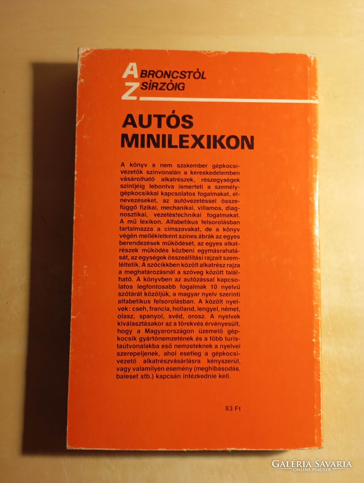 A könyv a nem szakember gépkocsivezetők színvonalán a kereskedelemben vásárolható alkatrészek, részegységek szintjéig lebontva ismerteti a személygépkocsikkal kapcsolatos fogalmakat, elnevezéseket, az autóvezetéssel összefüggő fizikai, mechanikai, villamos, diagnosztikai, vezetéstechnikai fogalmakat. A mű lexikon. Alfabetikus felsorolásban tartalmazza a címszavakat, de a könyv végén mellékletként színes ábrák az egyes berendezések működését, az egyes alkatrészek működés közbeni egymásrahatását, az egységek összeállítási rajzait szemléltetik. A szócikkben közölt alkatrész rajza a meghatározásnál a szöveg között található. A könyvben az autózással kapcsolatos legfontosabb fogalmak 10 nyelvű szótárát közöljük, a magyar nyelv szerinti alfabetikus felsorolásban. A közölt nyelvek: cseh, francia, holland, lengyel, német, olasz, spanyol, svéd, orosz. A nyelvek kiválasztásakor az a törekvés érvényesült, hogy a Magyarországon üzemelő gépkocsik gyártónemzetének és a főbb turistaútvonalakba eső nemzeteknek a nyelvei szerepeljenek, ahol esetleg a gépkocsivezető alkatrészvásárlásra kényszerül, vagy valamilyen esemény (meghibásodás, baleset stb.) kapcsán intézkednie kell.
