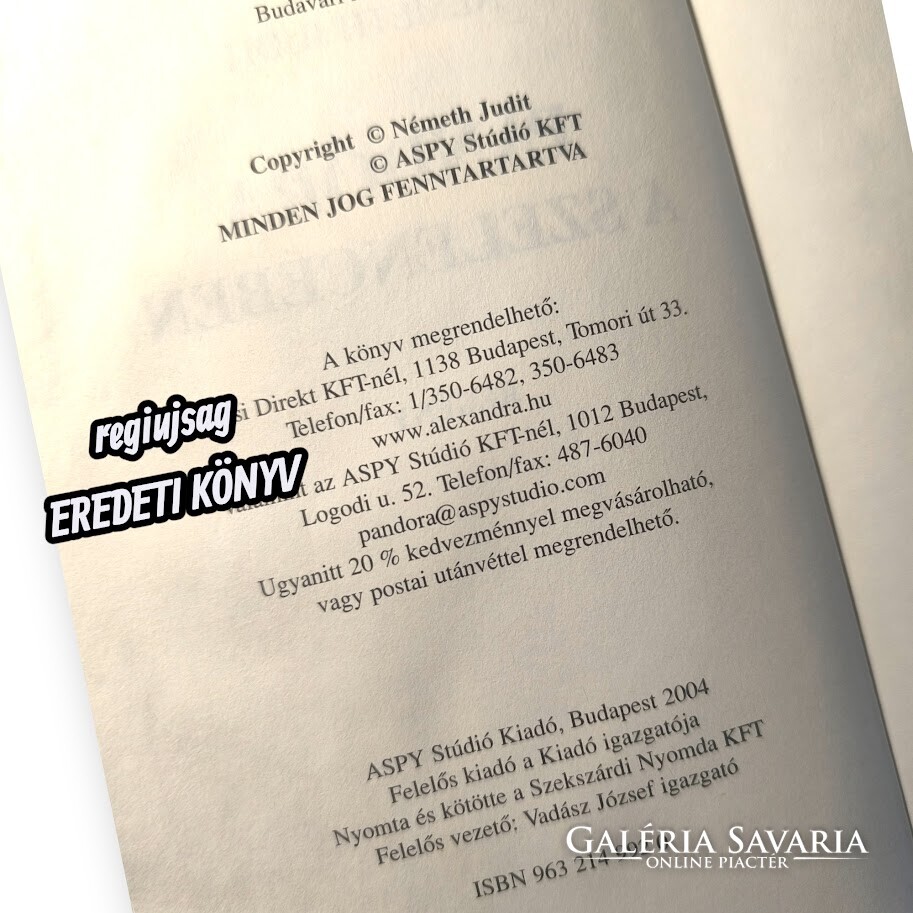 Németh Judit 2004-es kötete az ASPY Stúdió Kiadótól. Jellegzetes korabeli borítóval, megkímélt állapotban. Ritkább, kisebb példányszámú kiadás gyűjtőknek és érdeklődőknek.