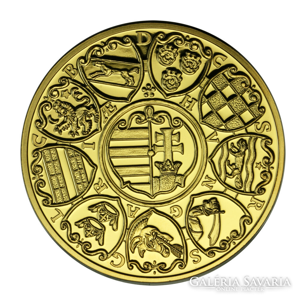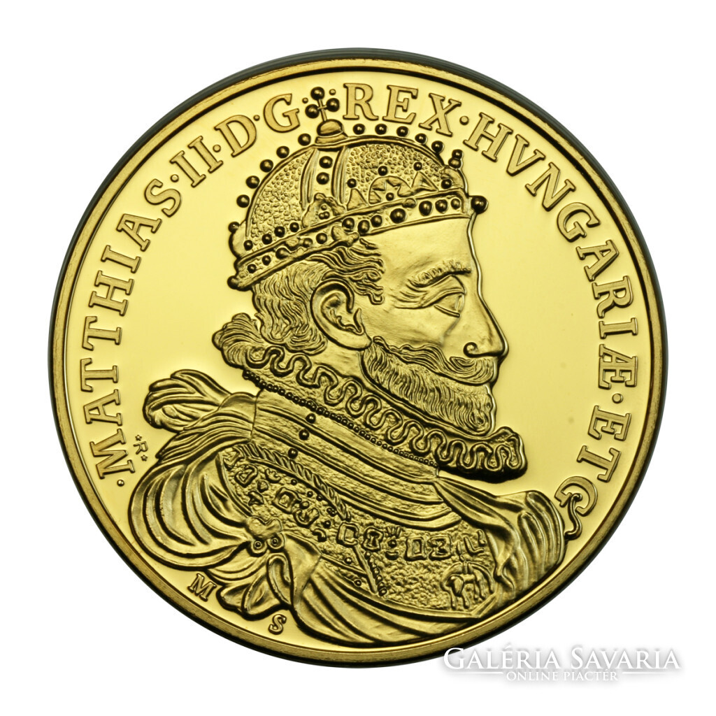 Tartásfok: PP, certifikáttal II. Mátyás 6 Aranydukát, koronázási érem 1608 utánveret Magyar Aranyóriások sorozat Anyag: aranyozott rézötvözet Átmérő: 46 mm Súly: 35 g Magyar Éremművészeti Intézet