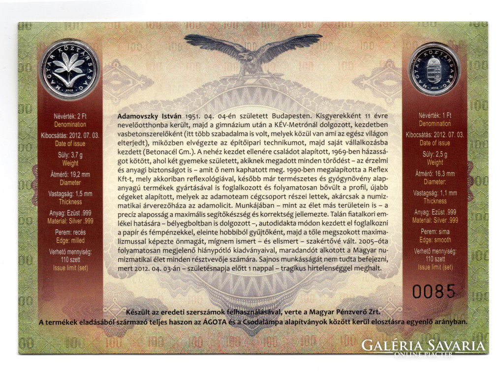 Tartásfok: UNC, oxidfoltos! sorozatszám eltérés lehetséges ezüst 1 és 2 Forint 2012 sorozatszám: Ezüst: 999/1000 Súly: 2,5 g és 3,7 g