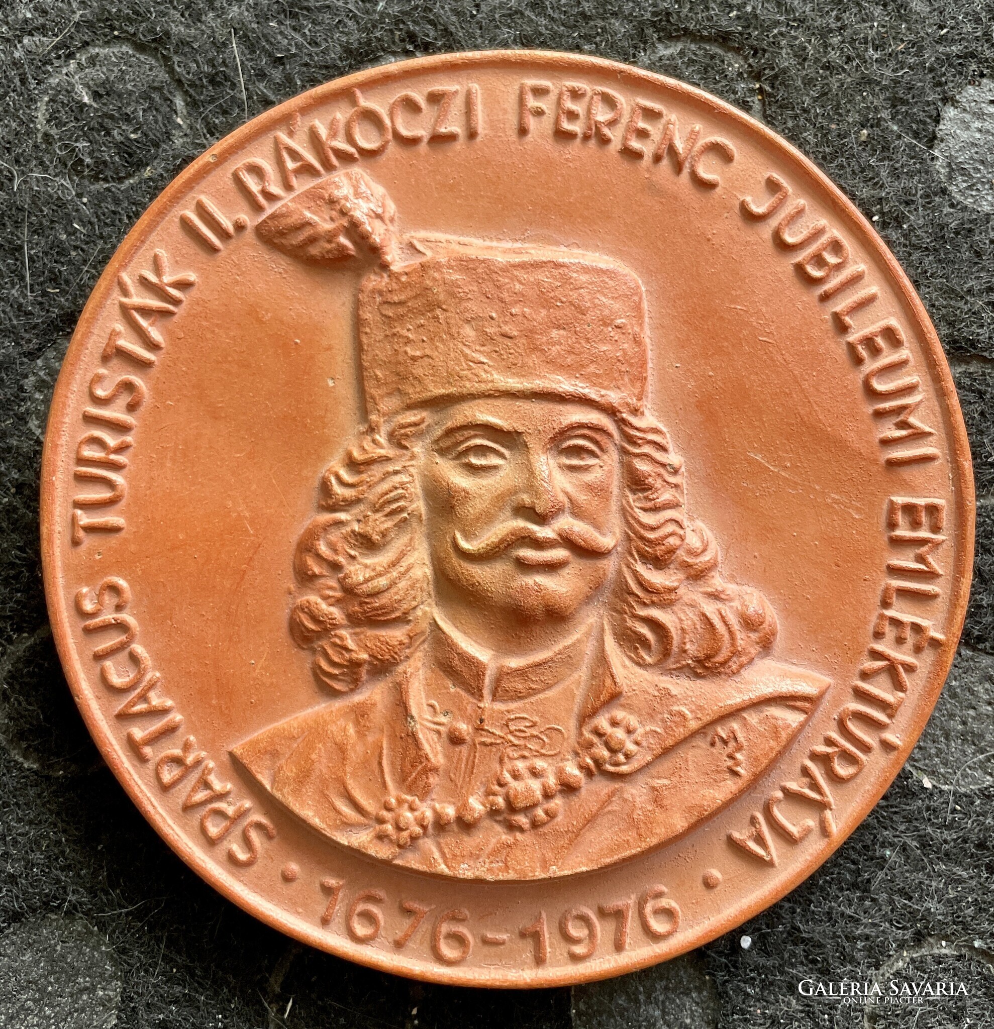 Jelzett cserép plakett, emlékplakett. Akasztási lehetőséggel rendelkezik. Egyik oldalon felirat: SPARTACUS TURISTÁK II. RÁKÓCZI FERENC JUBILEUMI EMLÉKTÚRÁJA 1676 - 1976 Jelzés: ME (Molnár Elek)