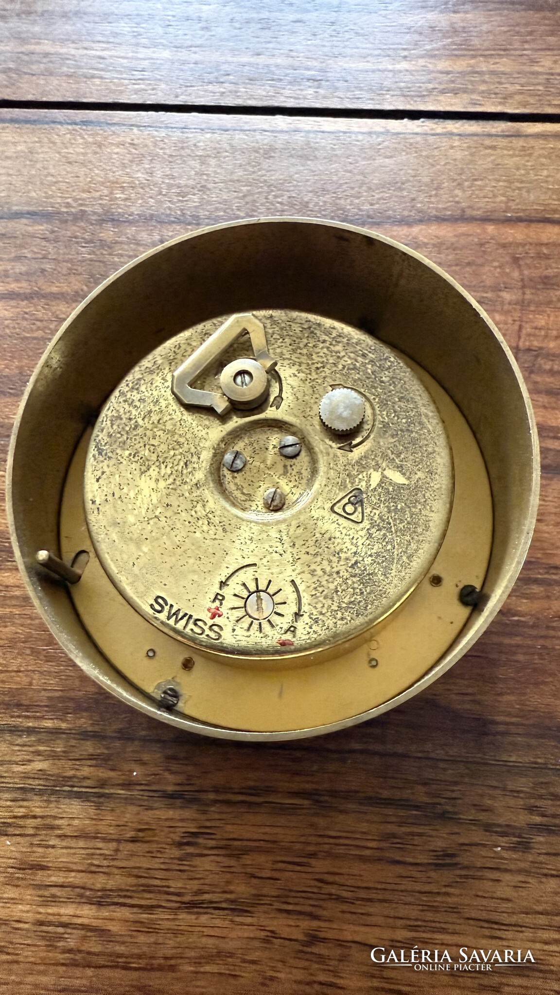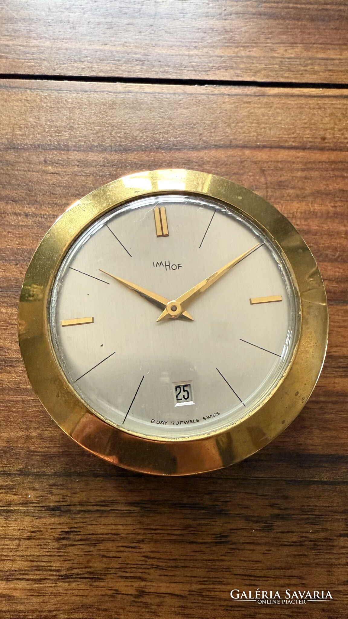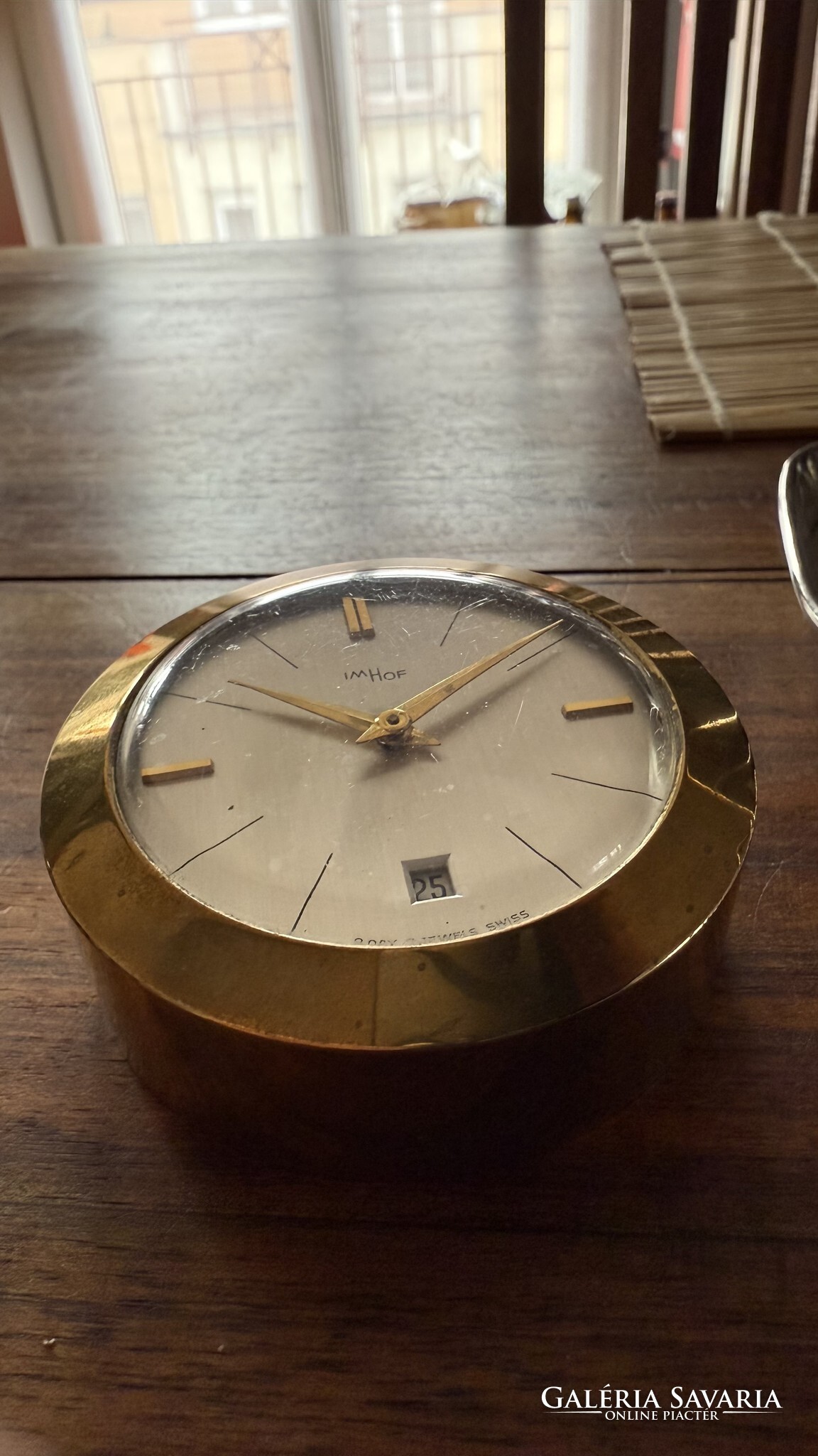 Imhof, ritka formájú, 8 napos fekvő asztali óra, működő. Átmérője 7cm, magassága 2,-3,5 cm ( döntött )