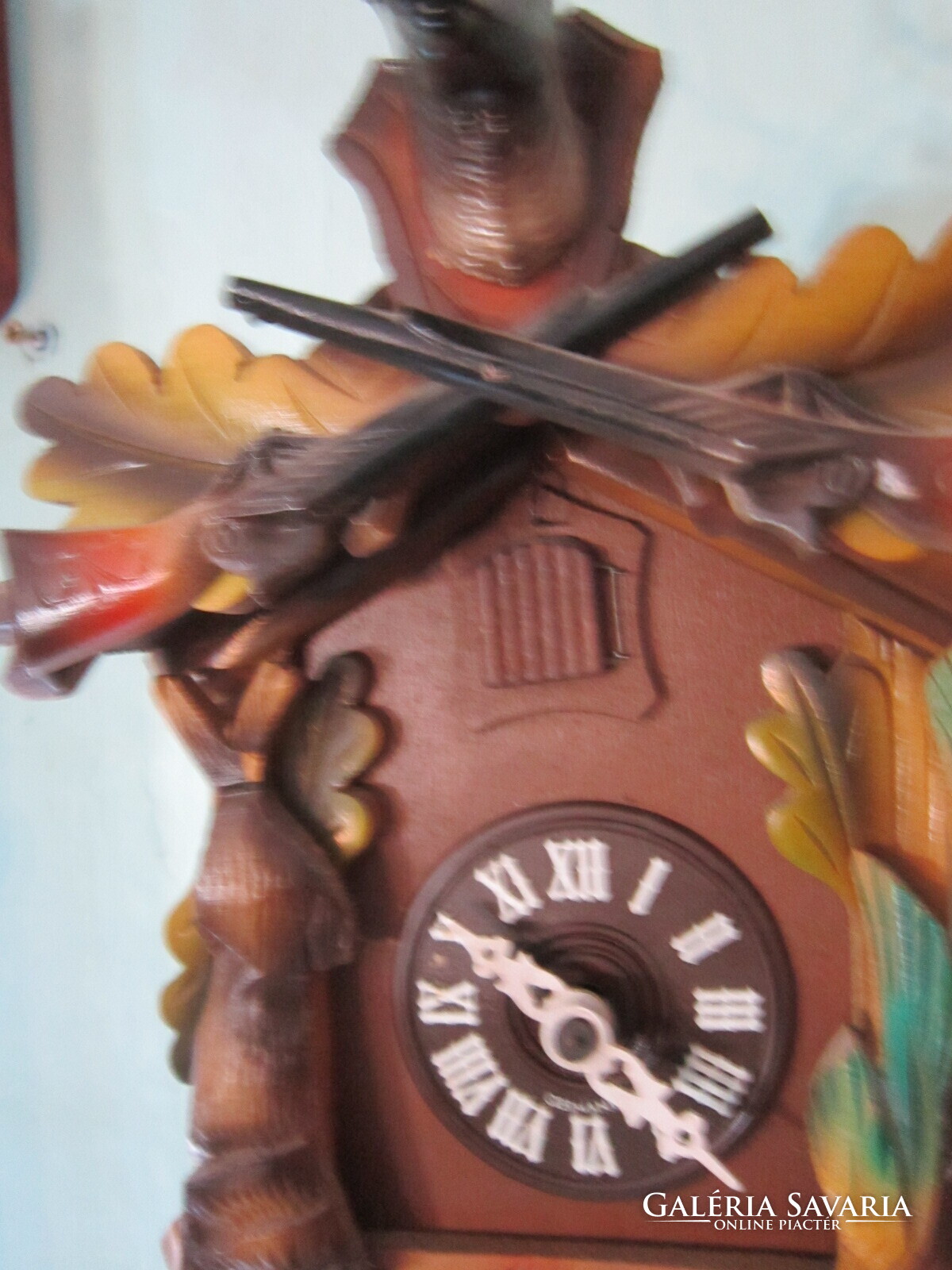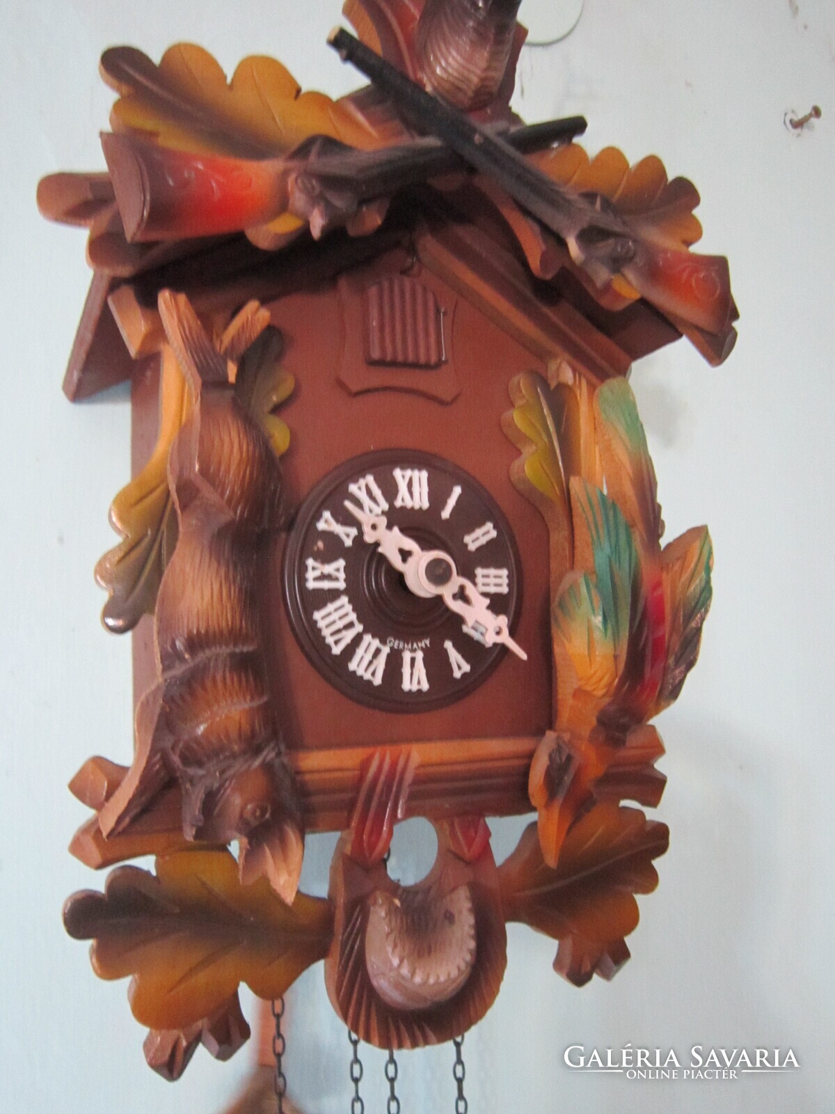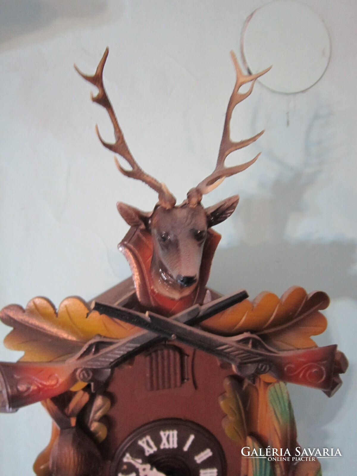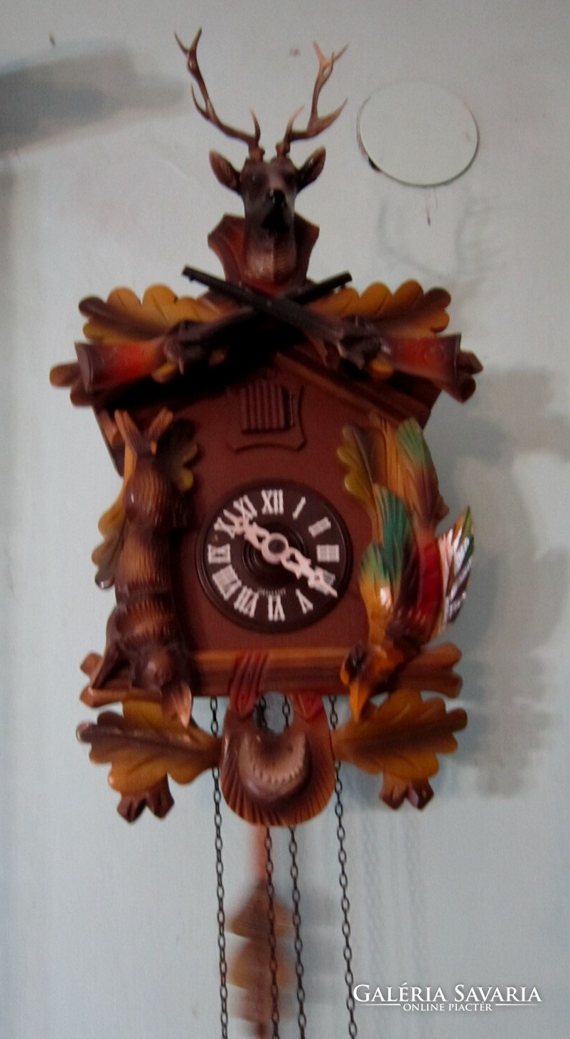 Fekete erdei kakukkosóra . Felül szép szarvas trófea egészíti ki. alatta keresztbe tett fegyverek, oldalt a " zsákmány". Az ingája levél formájú, a súlyai fenyőtobozt formáznak. A kakukk ajtaja egész órakor kinyílik és a madárka elkakukkolja az aktuális órák számát. Félkor egyet. Jó állapotban.