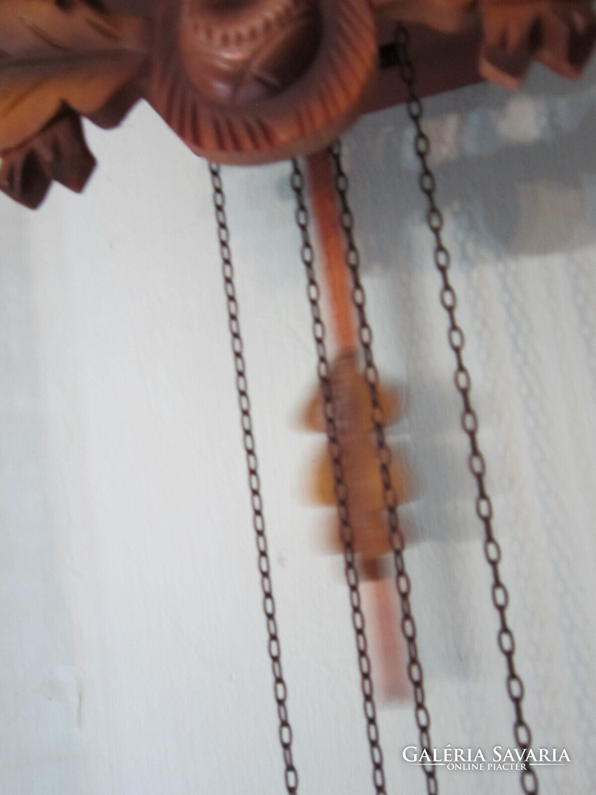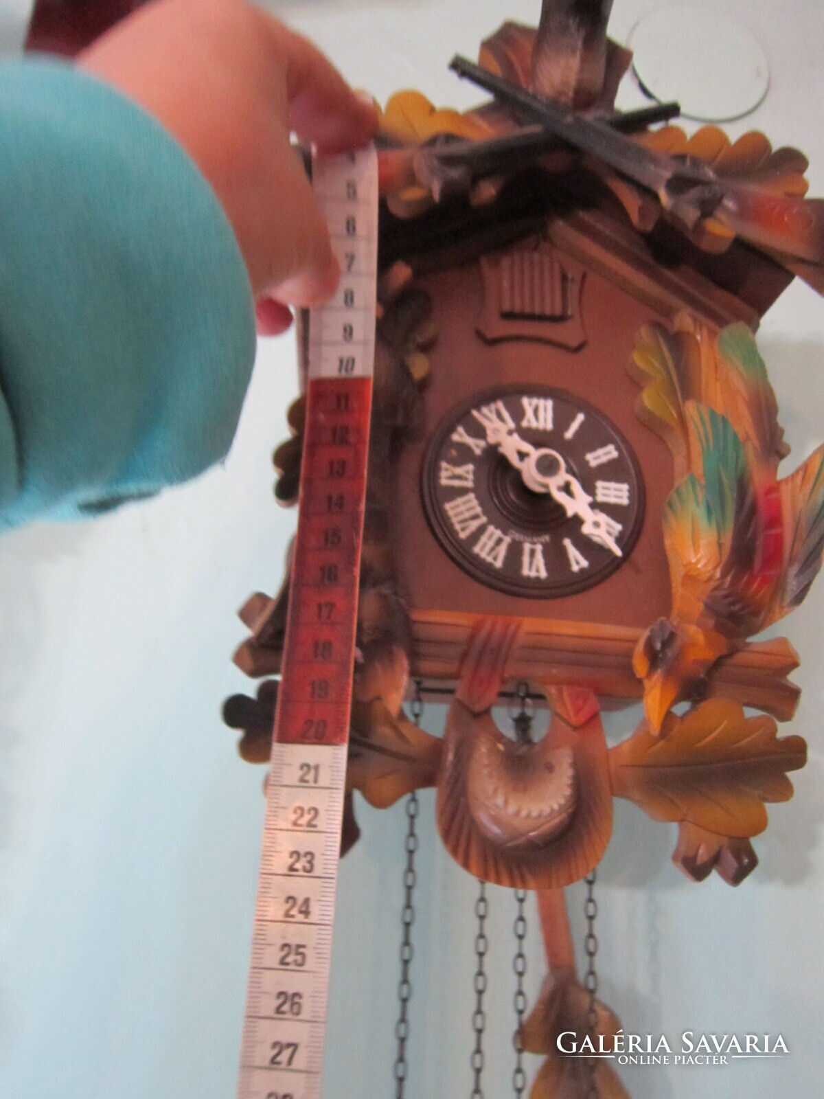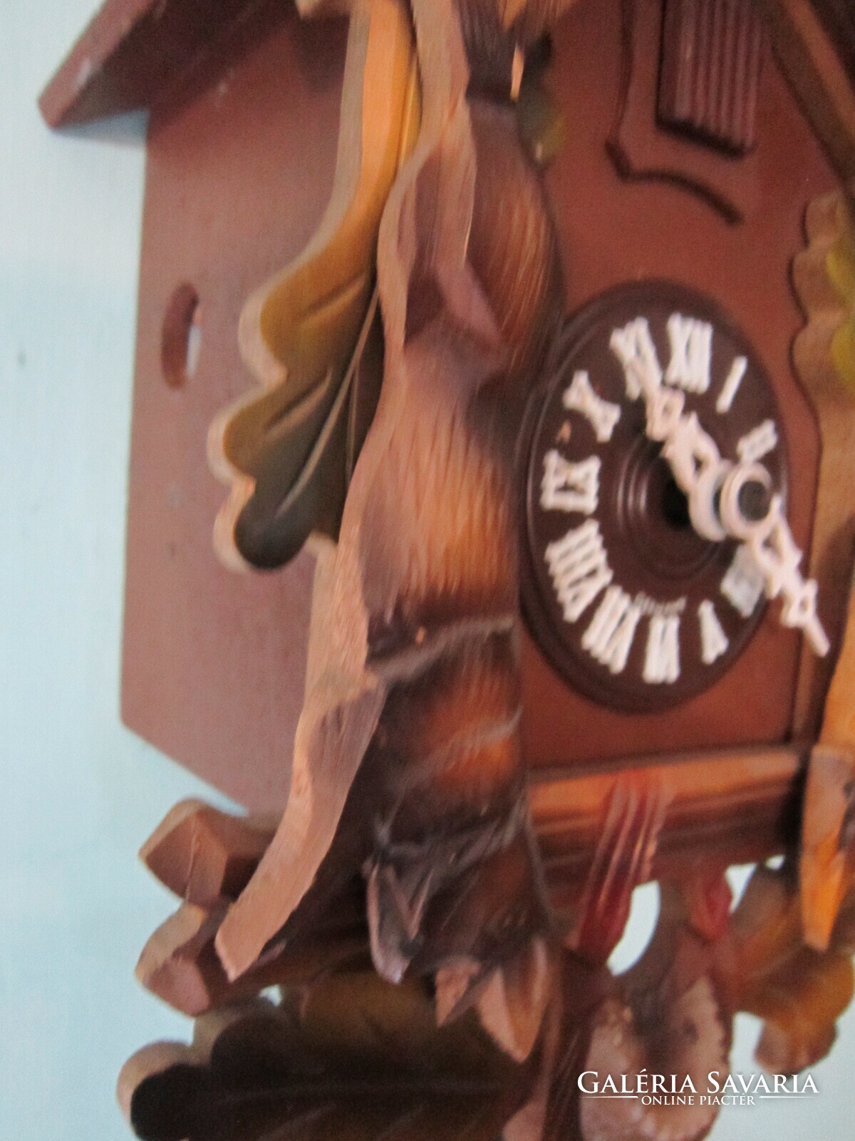 Fekete erdei kakukkosóra . Felül szép szarvas trófea egészíti ki. alatta keresztbe tett fegyverek, oldalt a " zsákmány". Az ingája levél formájú, a súlyai fenyőtobozt formáznak. A kakukk ajtaja egész órakor kinyílik és a madárka elkakukkolja az aktuális órák számát. Félkor egyet. Jó állapotban.