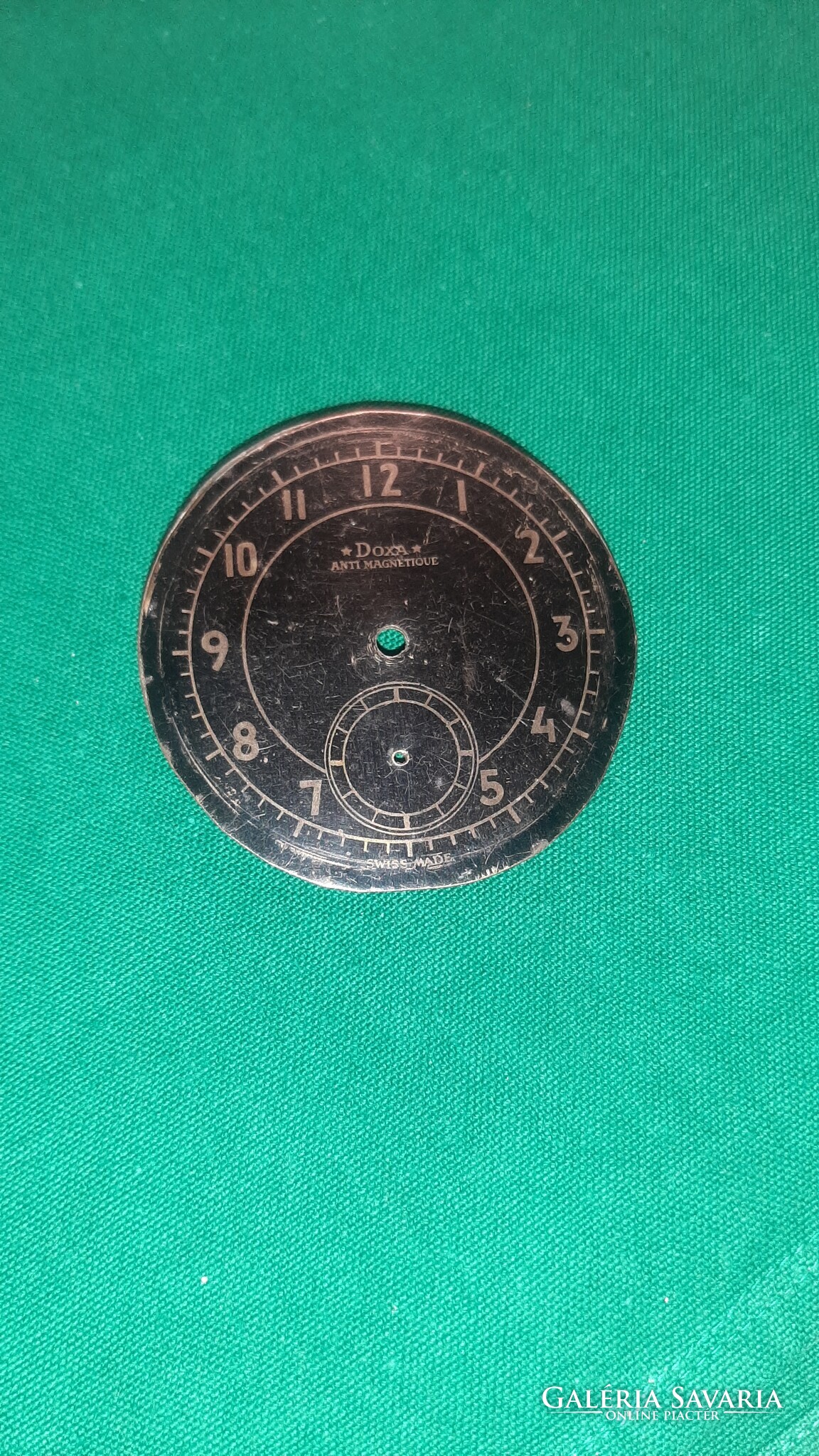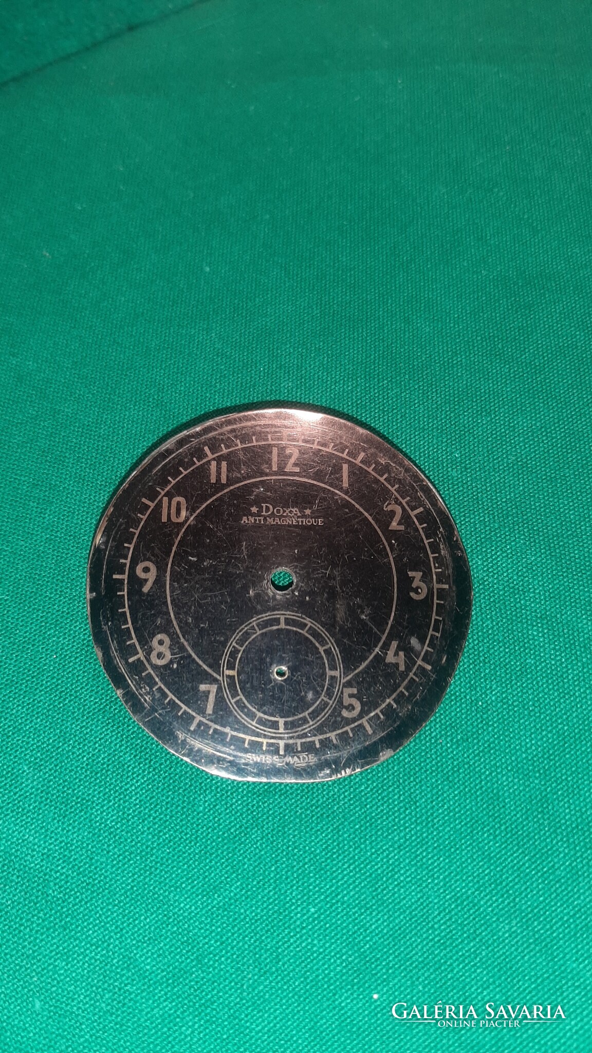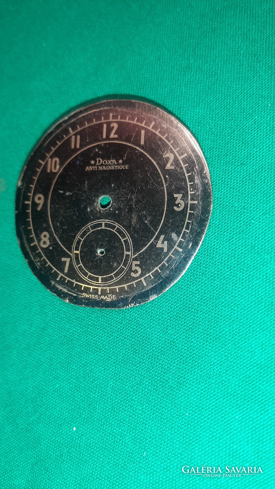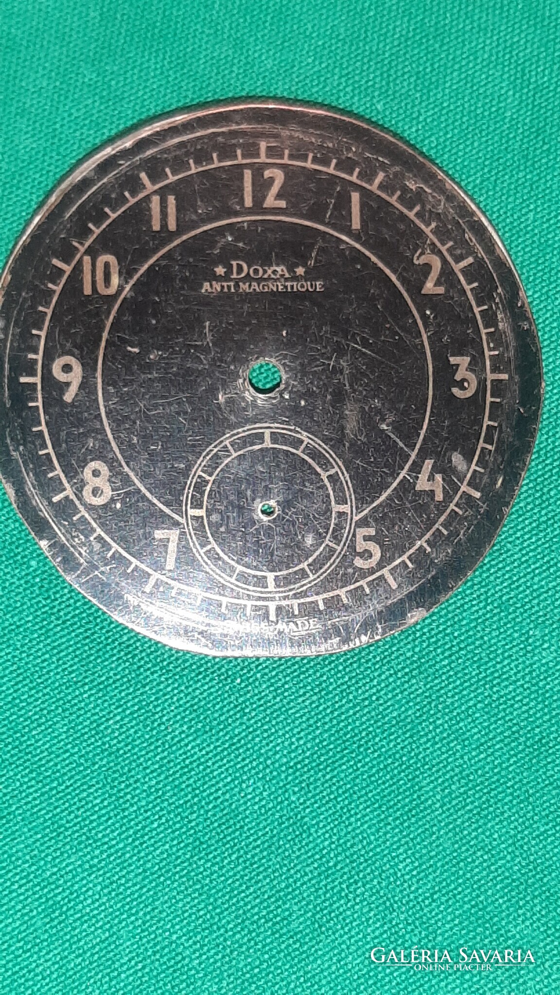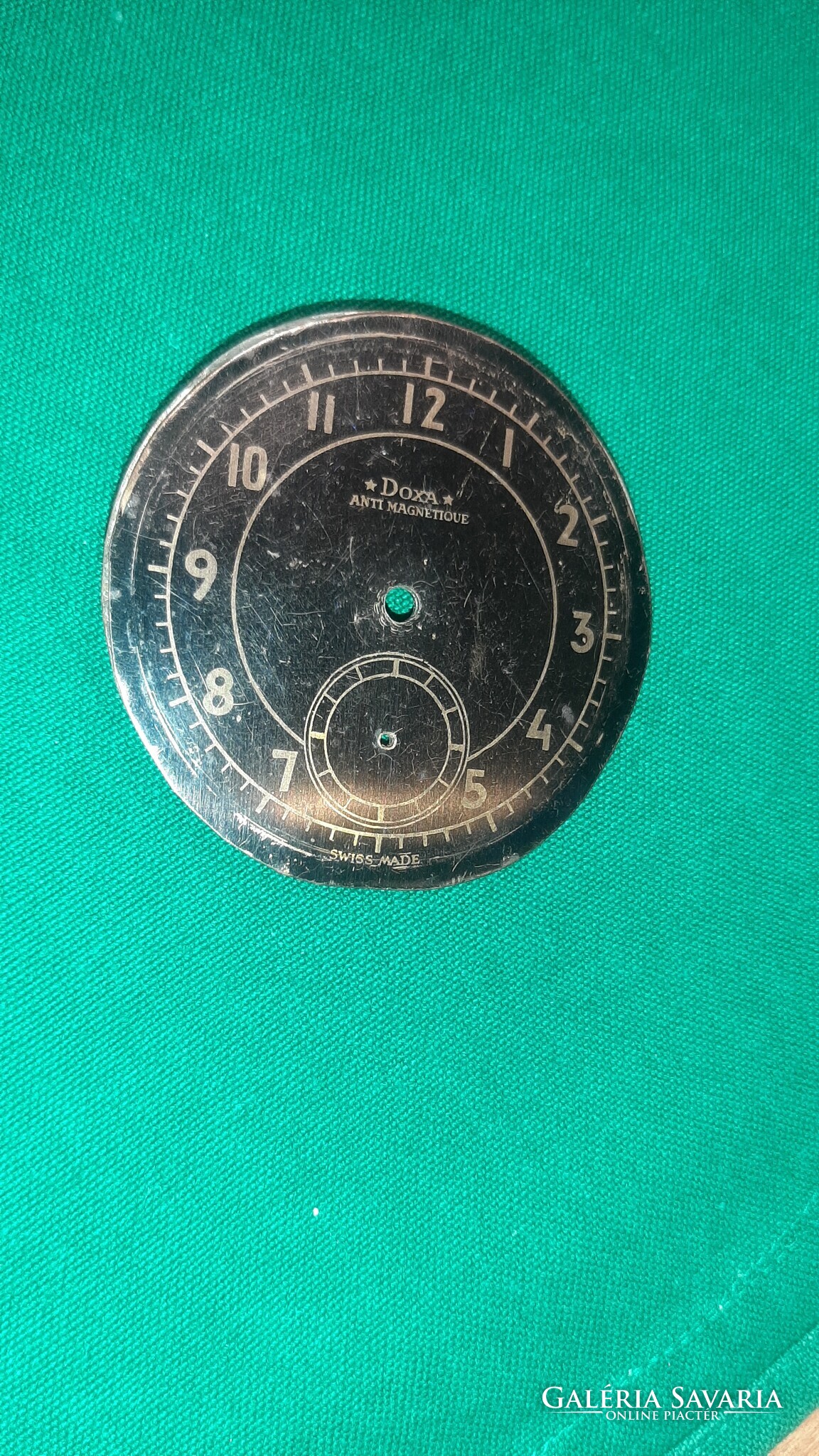 Eladó a képeken látható nagyméretű Doxa számlap. Átmérője 59 mm, lyukak közötti távolság 14 mm. Állapota a képekkel megegyező. A számlap rá van egy másik fém számlapra ragasztva így 1mm vastag.
