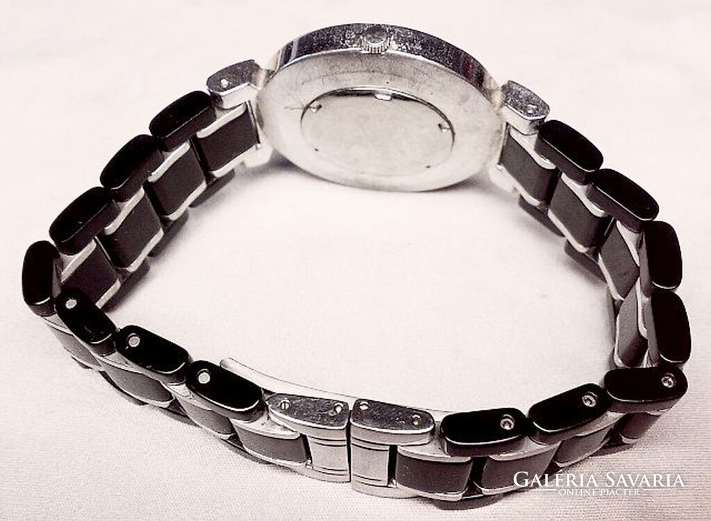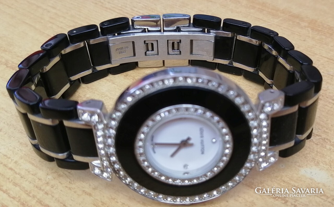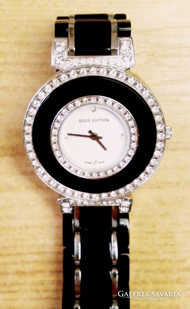 Szép divatos karóra, alkalmi viselethez.Különösen szép állapotban lévő, egyedi, és divatos női ékszeróra.Az óra tok fekete kerámia betétes felületén, és a füleken rengeteg apró, briliáns csiszolású cirkónia kővel díszítve. A számlapján a 3, 6, 9, 12, indexeket is apró kövek jelölik, másodperc mutató nélküli kivitel, Sviss Made gyártói jelölés, minőségi svájci szerkezet.A hátlapon Louis Vuitton logó, és márkajelzés, valamint Swiss Made 5287-2 sorozatszám. Fekete kerámia sávos fix méretű biztonsági csattal. A szíj mérete a szemek kivételével csökkenthető.Alkalmi, ünnepi viselethez ajánlom, amikor a megjelenés kiemelt tényező.