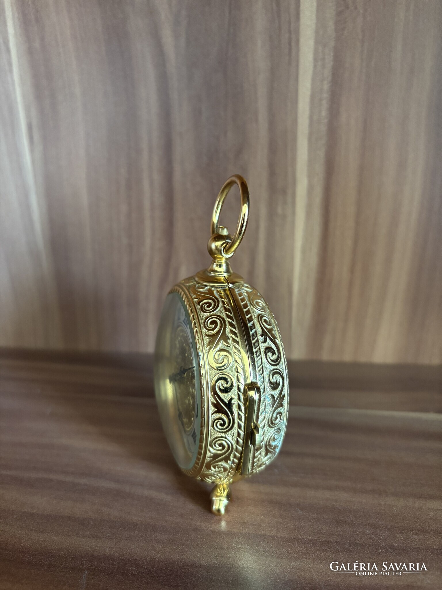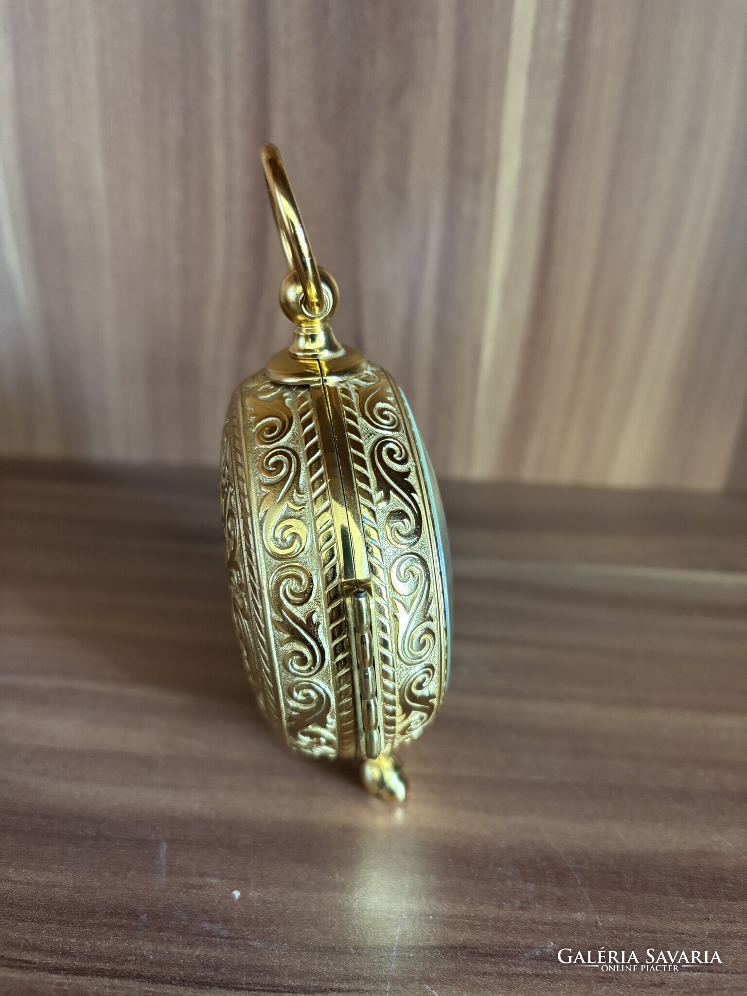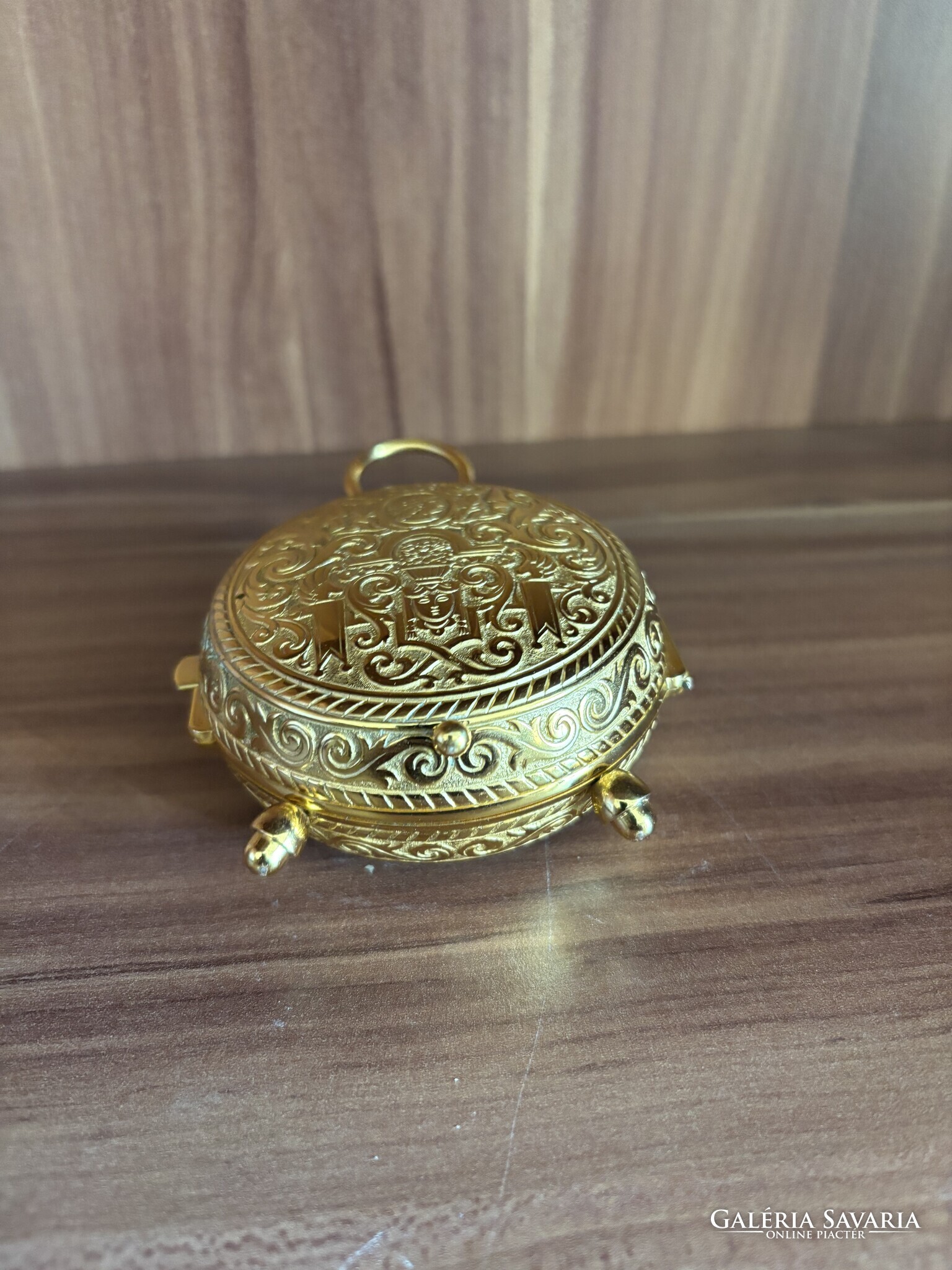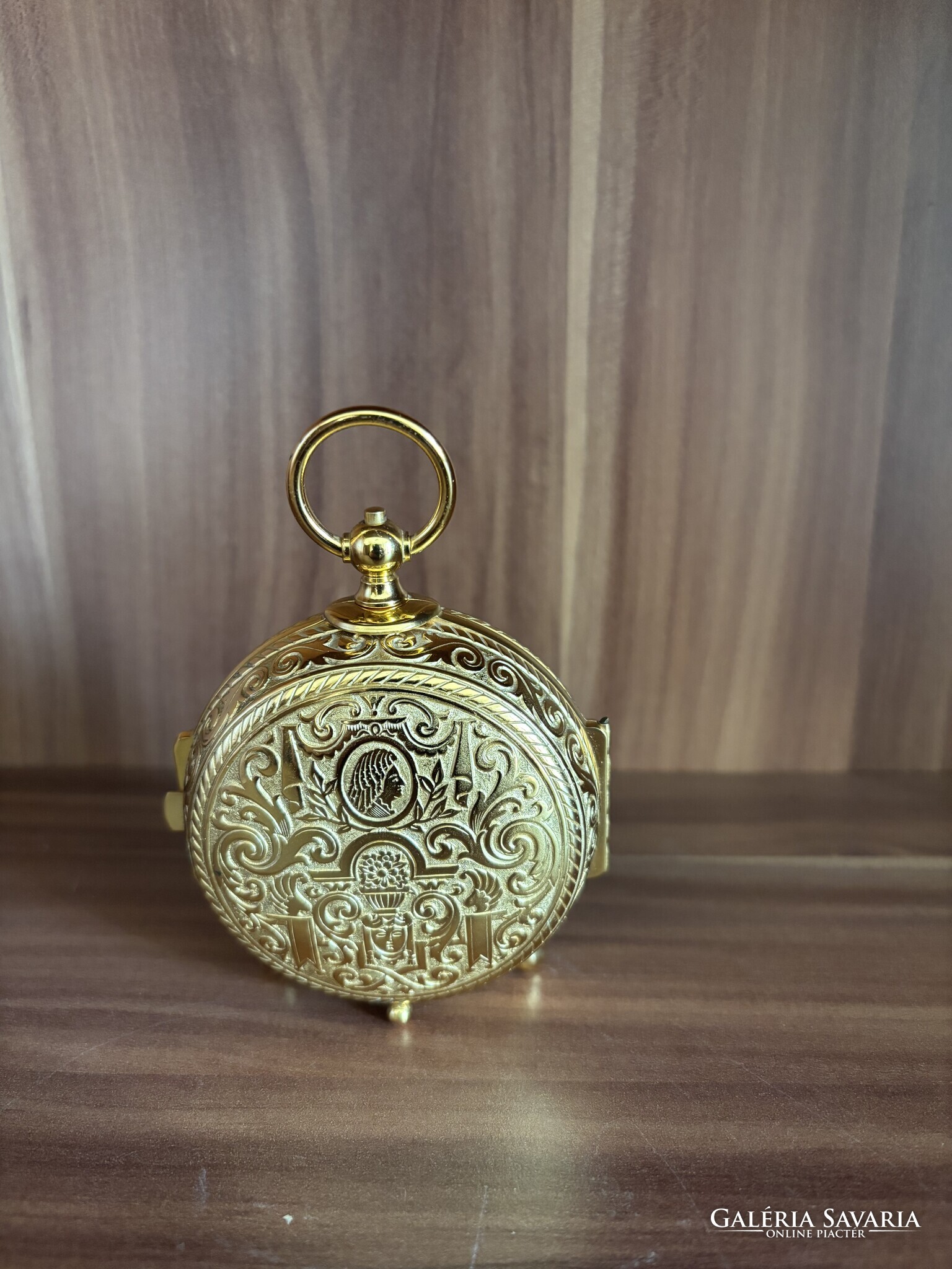 Aranyszínű tok, lábakon álló kivitel, felül akasztógyűrűvel.