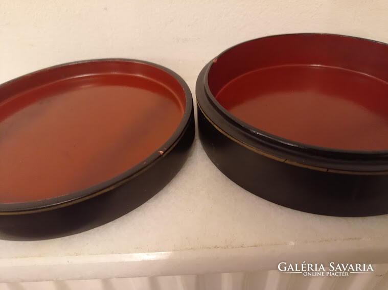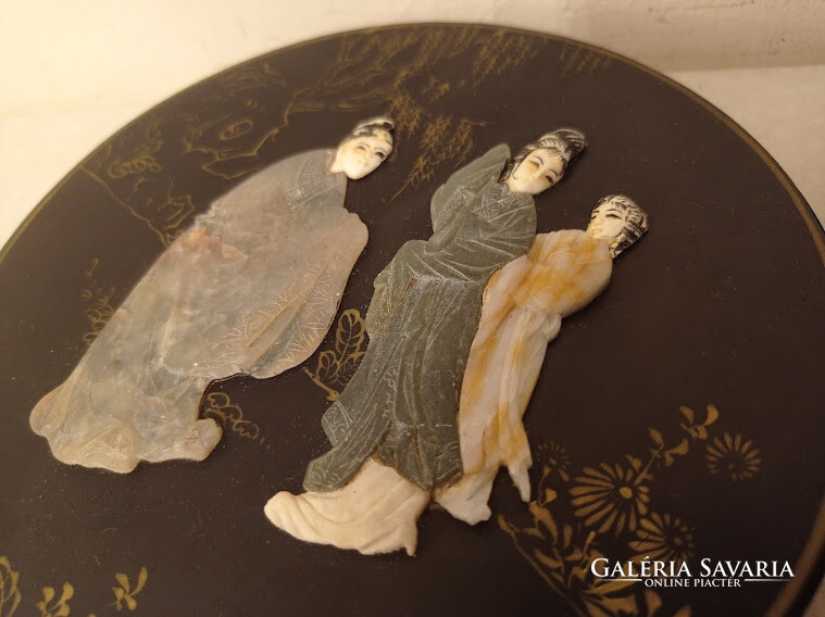 Antik kis kör alakú ázsiai kínai fekete lakk dobozka zsírkő gésa massza berakás