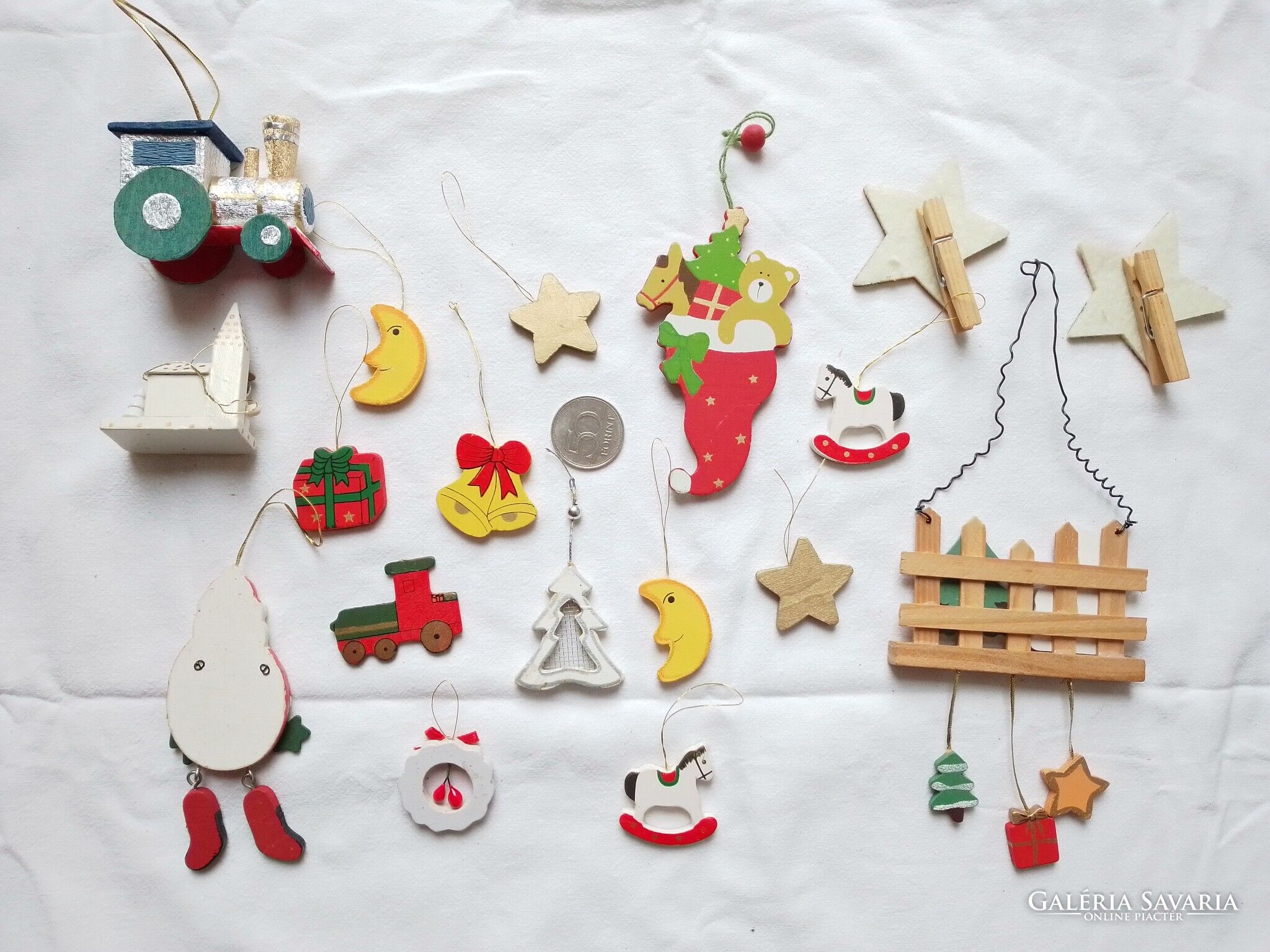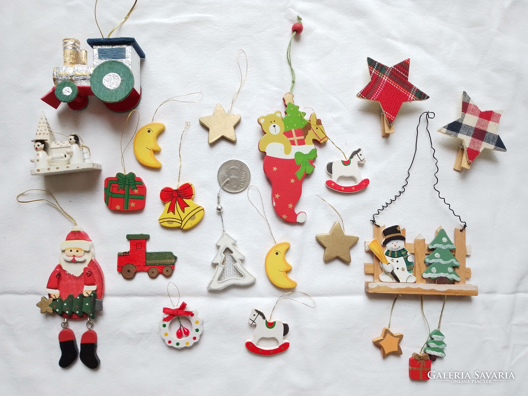 18 darab mini fa figura karácsonyfadísz, dekoráció: csillag hold hintaló Mikulás harang mozdony angyal koszorú fenyőfa, a képek szerinti állapotban. Az ár az egész csomagra értendő.