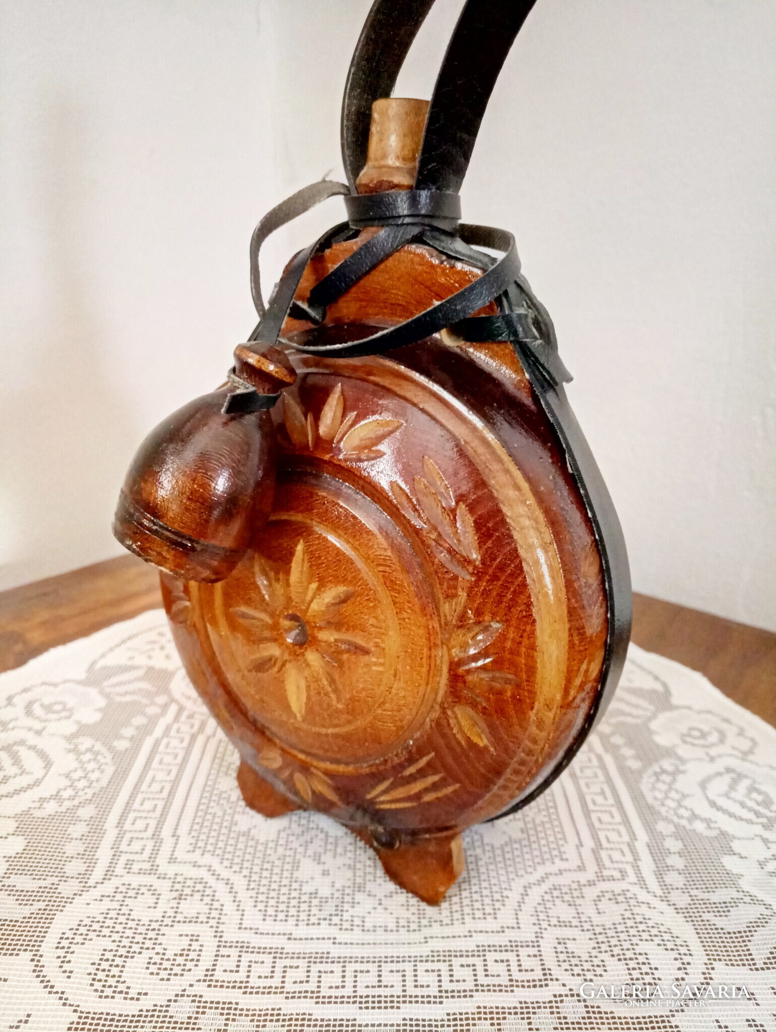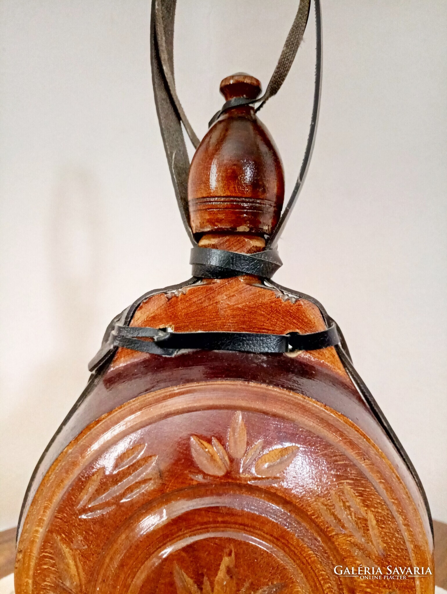 Vintage faragott kulacs, flaska, butykos. Körülbelül vagy legalább 30 éves. Inkább szuvenírnek készülhetett, mint valódi használatra, de hozzá illő környezetben mutatós dekoráció lehet. Állapota kitűnő. Mérete 22x13 cm.