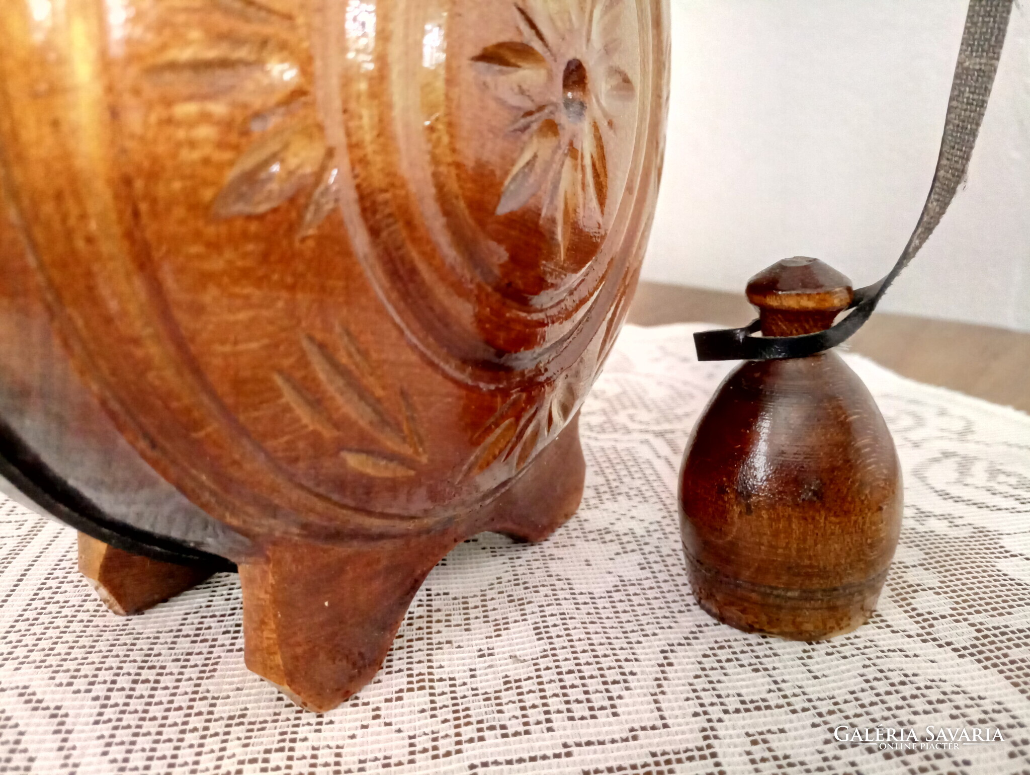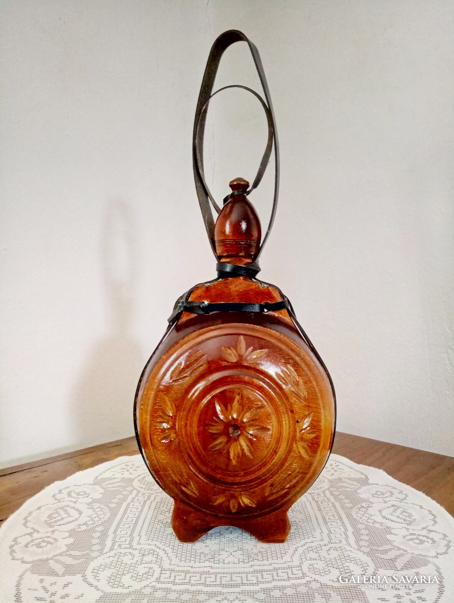 Régi faragott lakkozott fa kulacs, butykos, butella
