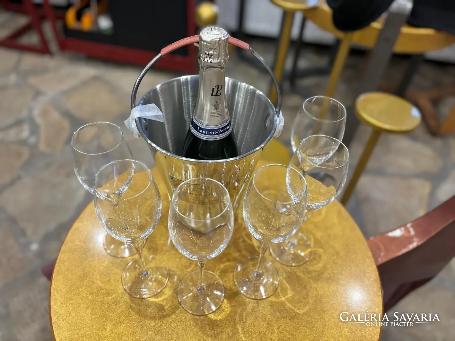 Laurent-Perrier pezsgőhűtő ajándékszett 6 kristálypohárral – bőrdíszítéses nemesacél veder, exkluzív