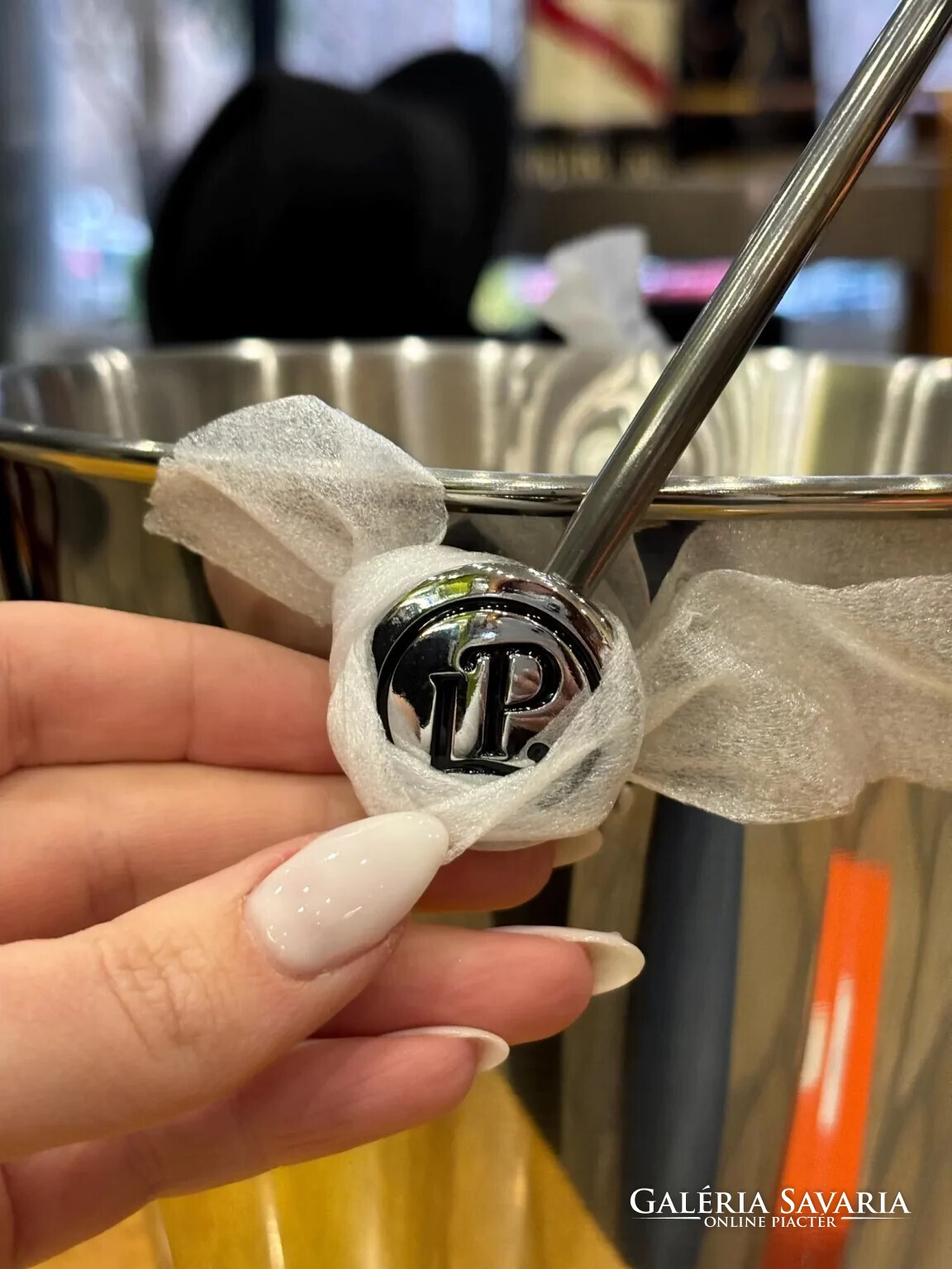 A veder részletgazdag kidolgozású, minden eleme minőségi anyagból készült. A bőrborítású fogantyún a "Laurent-Perrier" felirat, a fém gombokon az "LP" monogram látható.
