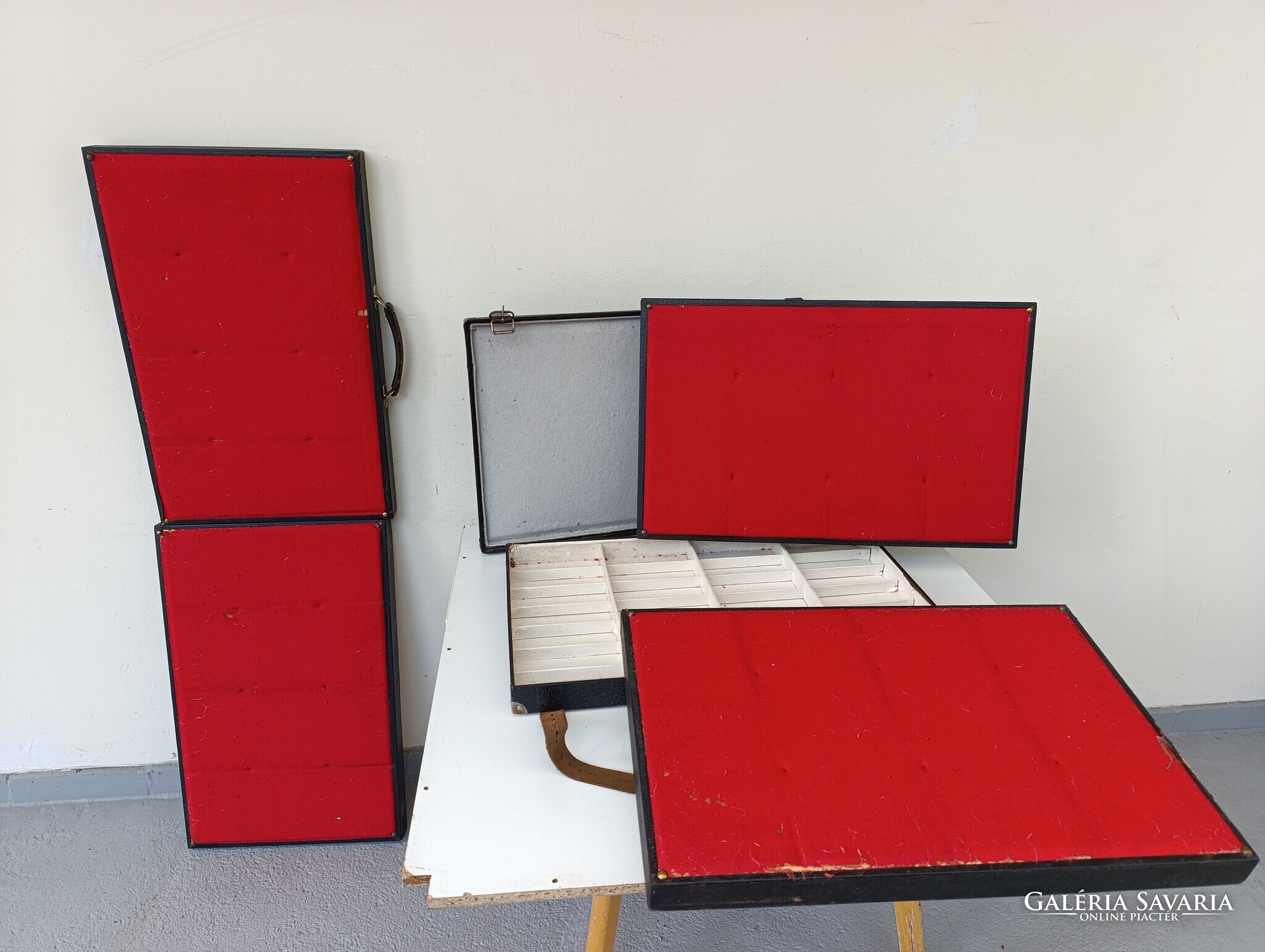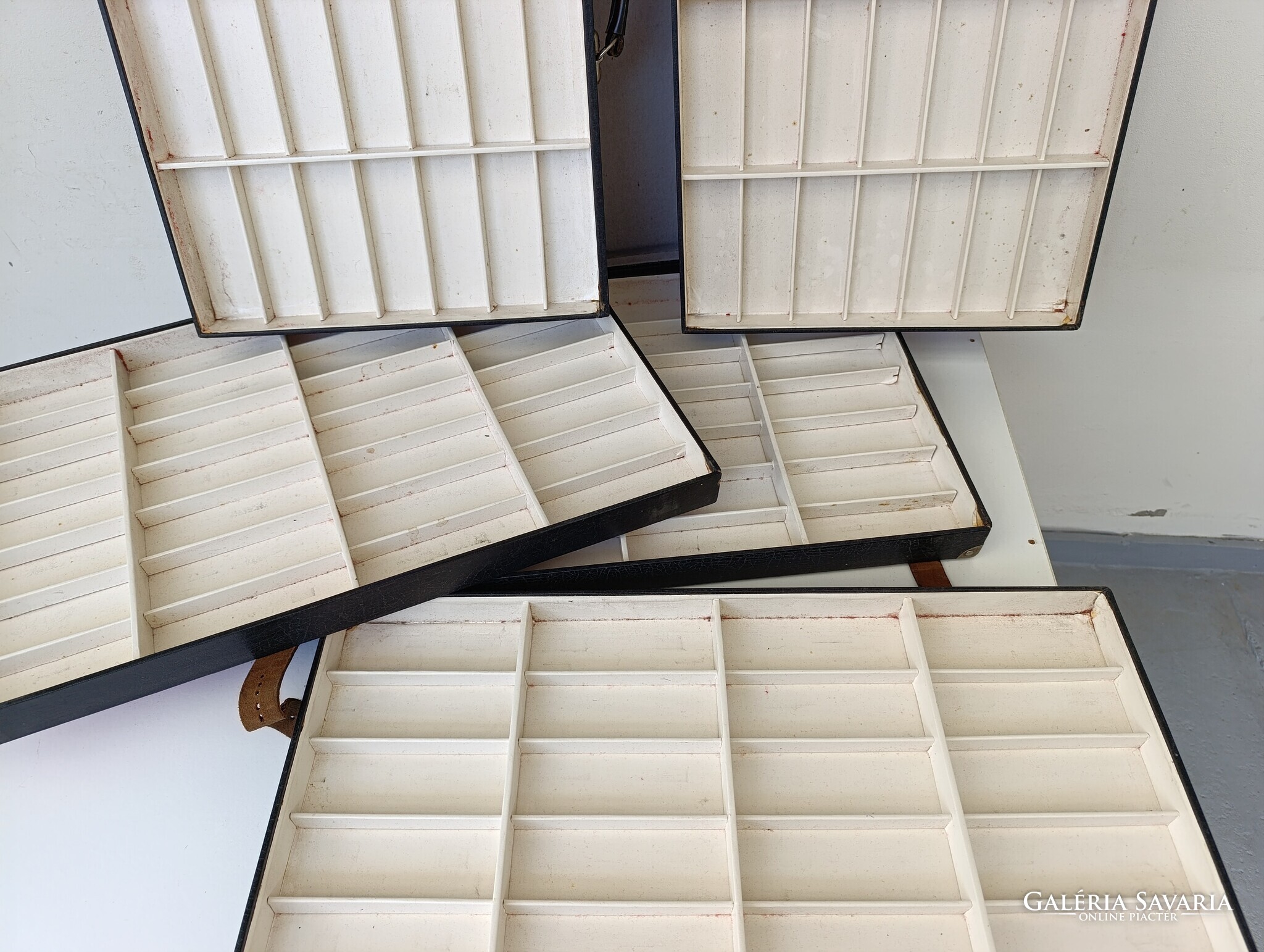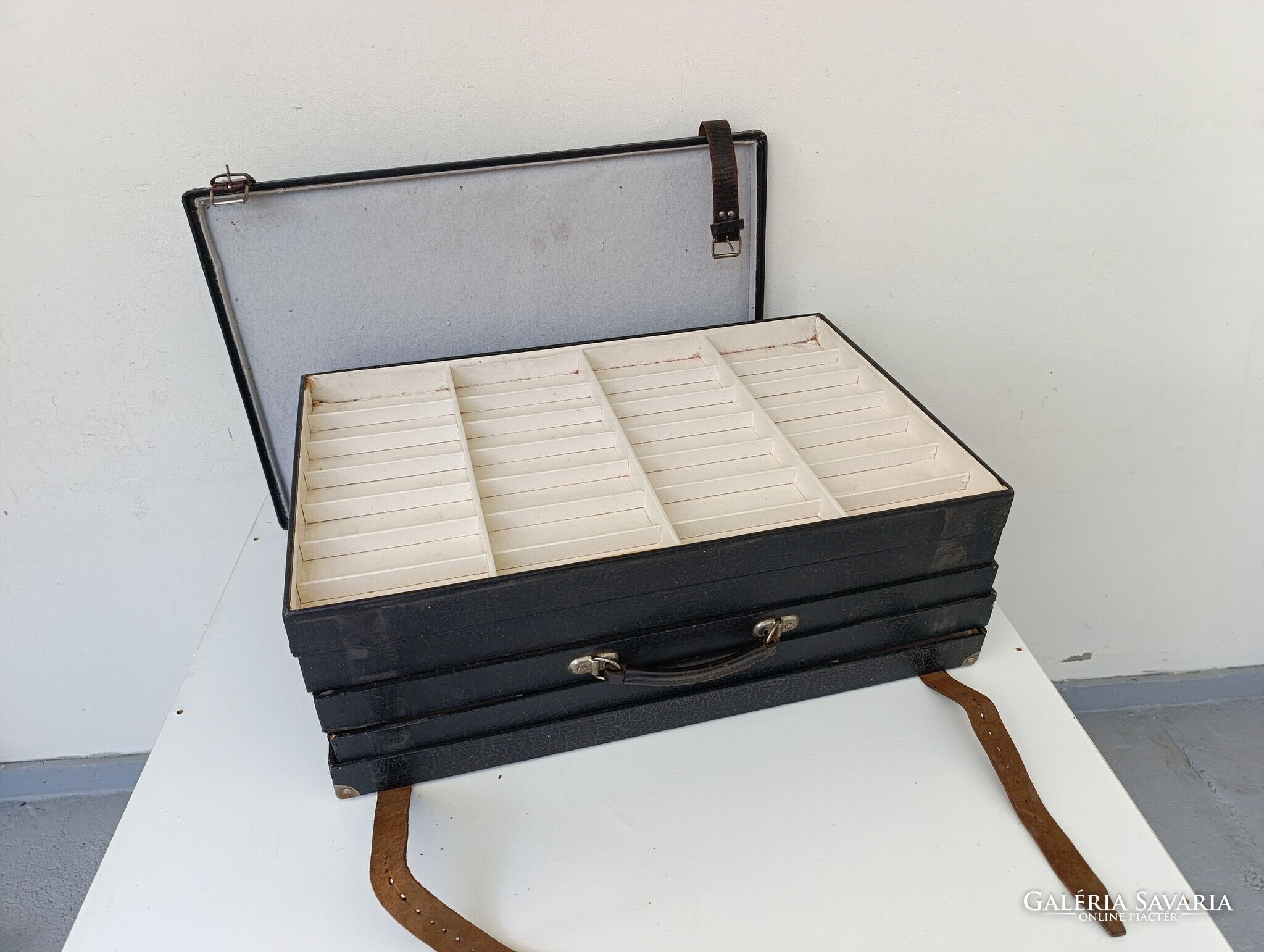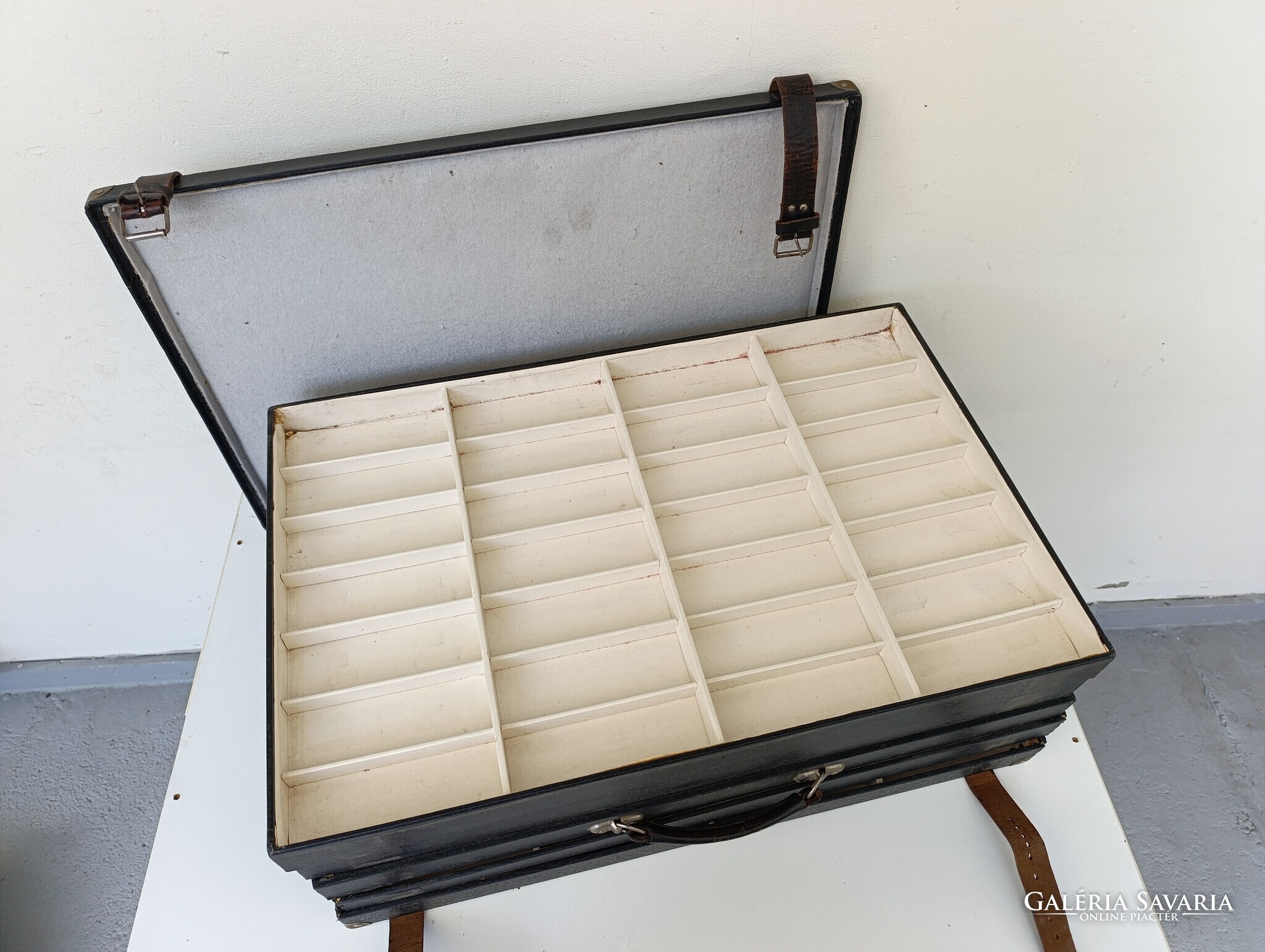 Utazó szemüveg, karóra ügynök szállító tálcás bőröndje praktikusan kialakított belső térrel.