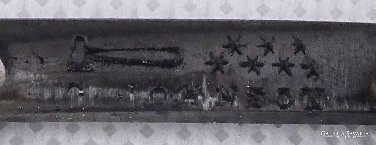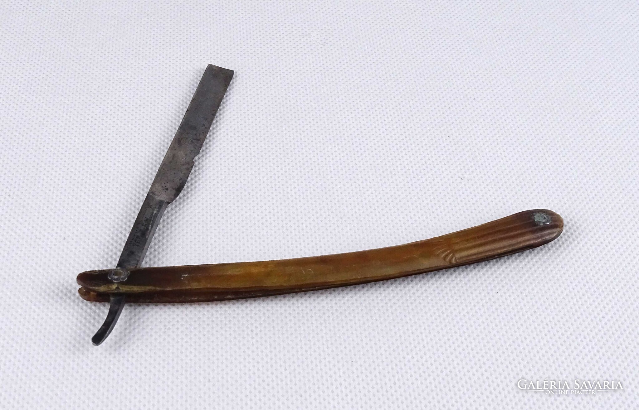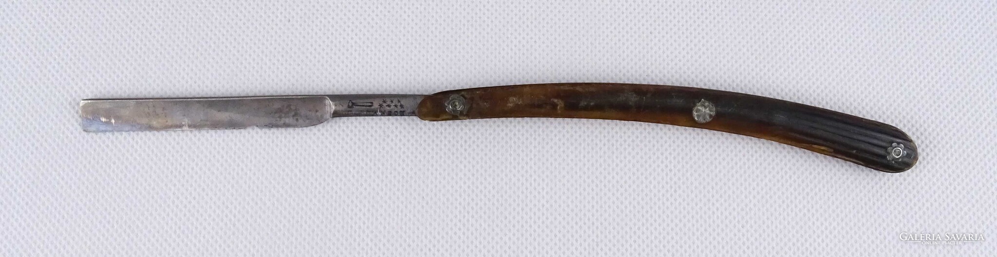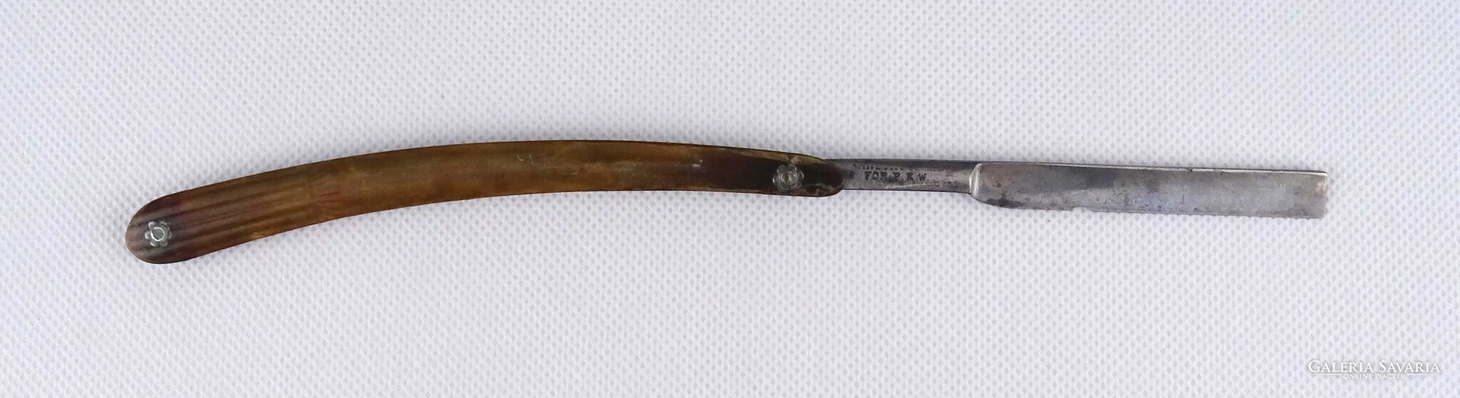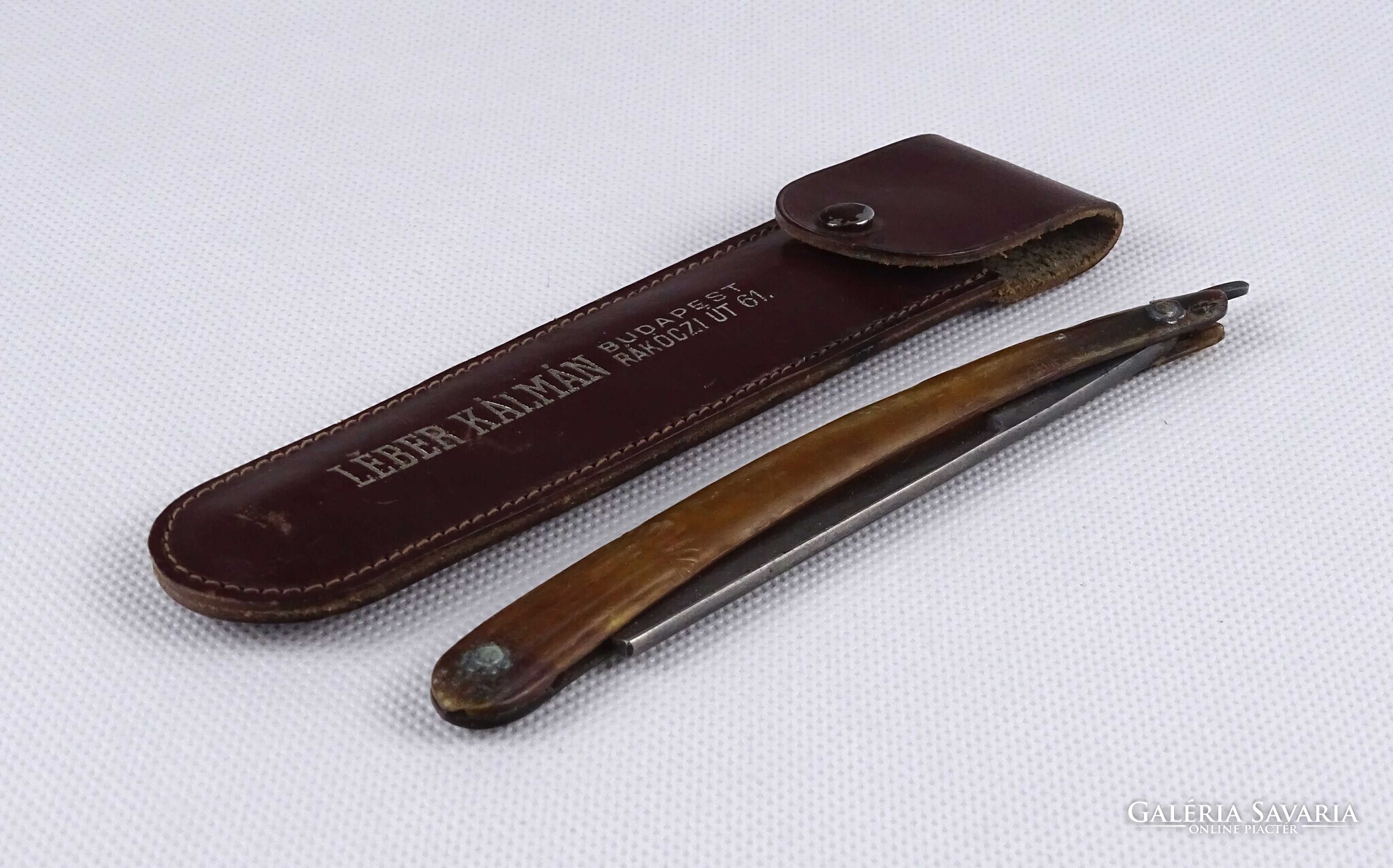 Antik, szaru markolatú, kinyitható borotva. Pengéje jelzett, szép állapotú, kis hibával. Bőr tokban. A penge mindkét oldalán jelzett: G. JOHNSON ... FOR P.K.W. A bőr tokon felirat: LÉBER KÁLMÁN BUDAPEST RÁKÓCZI ÚT 61.