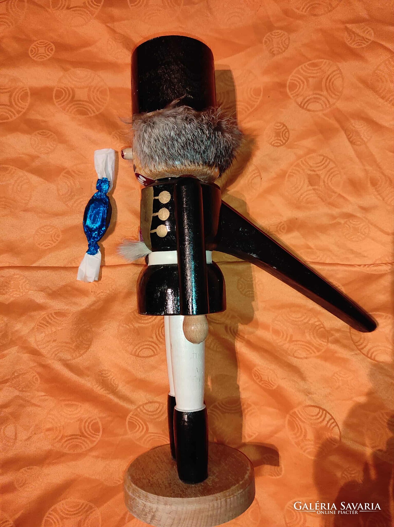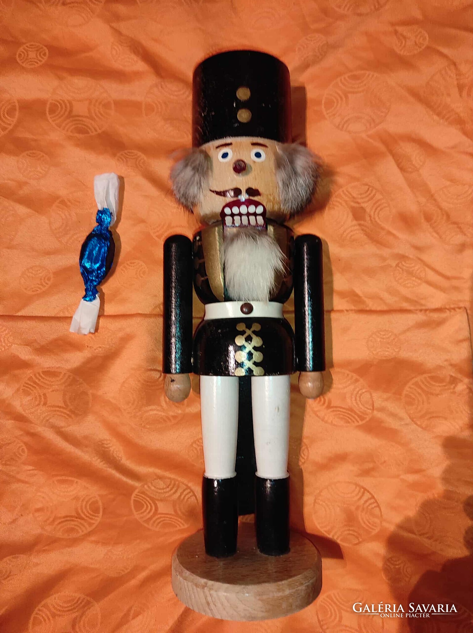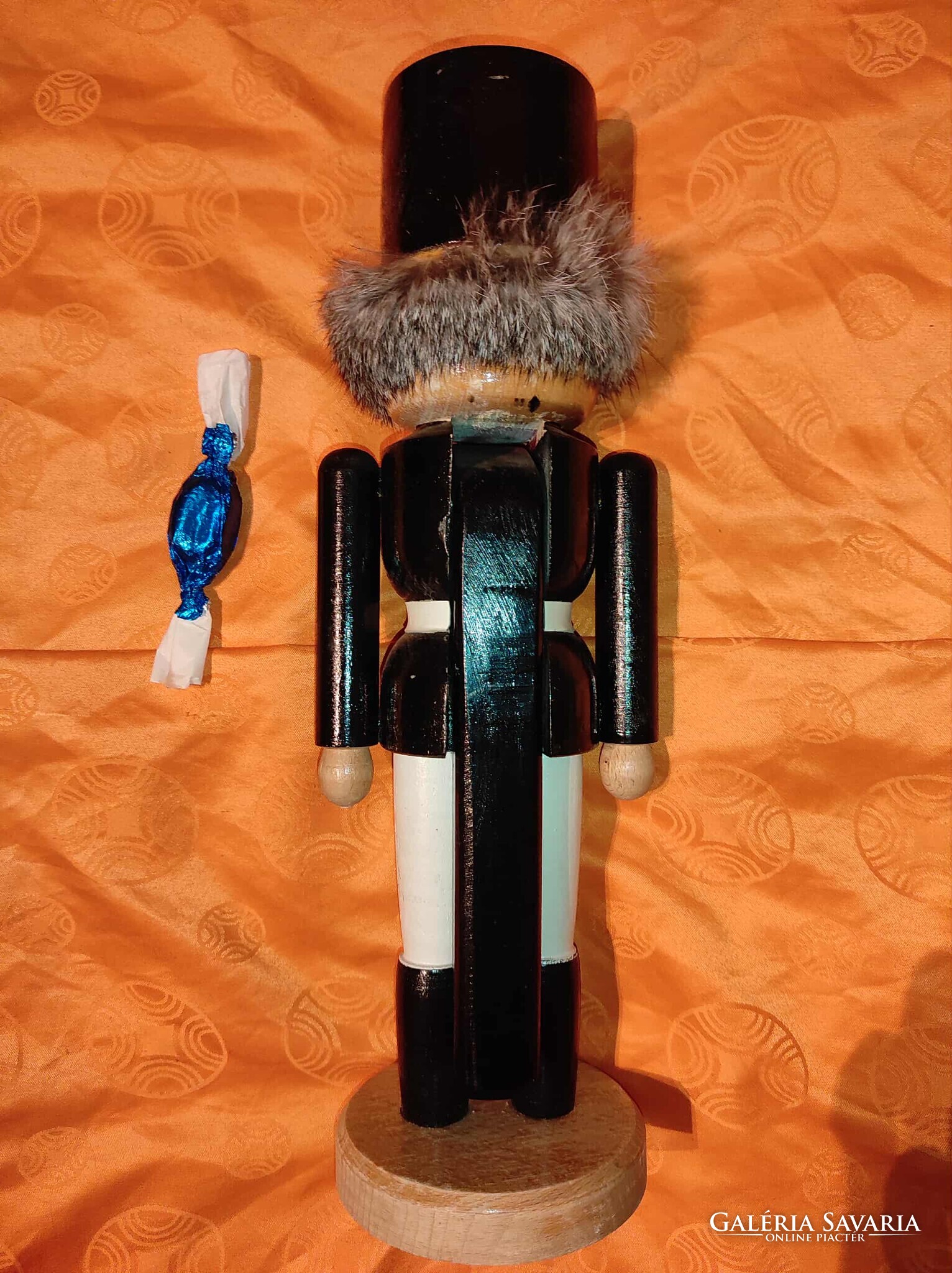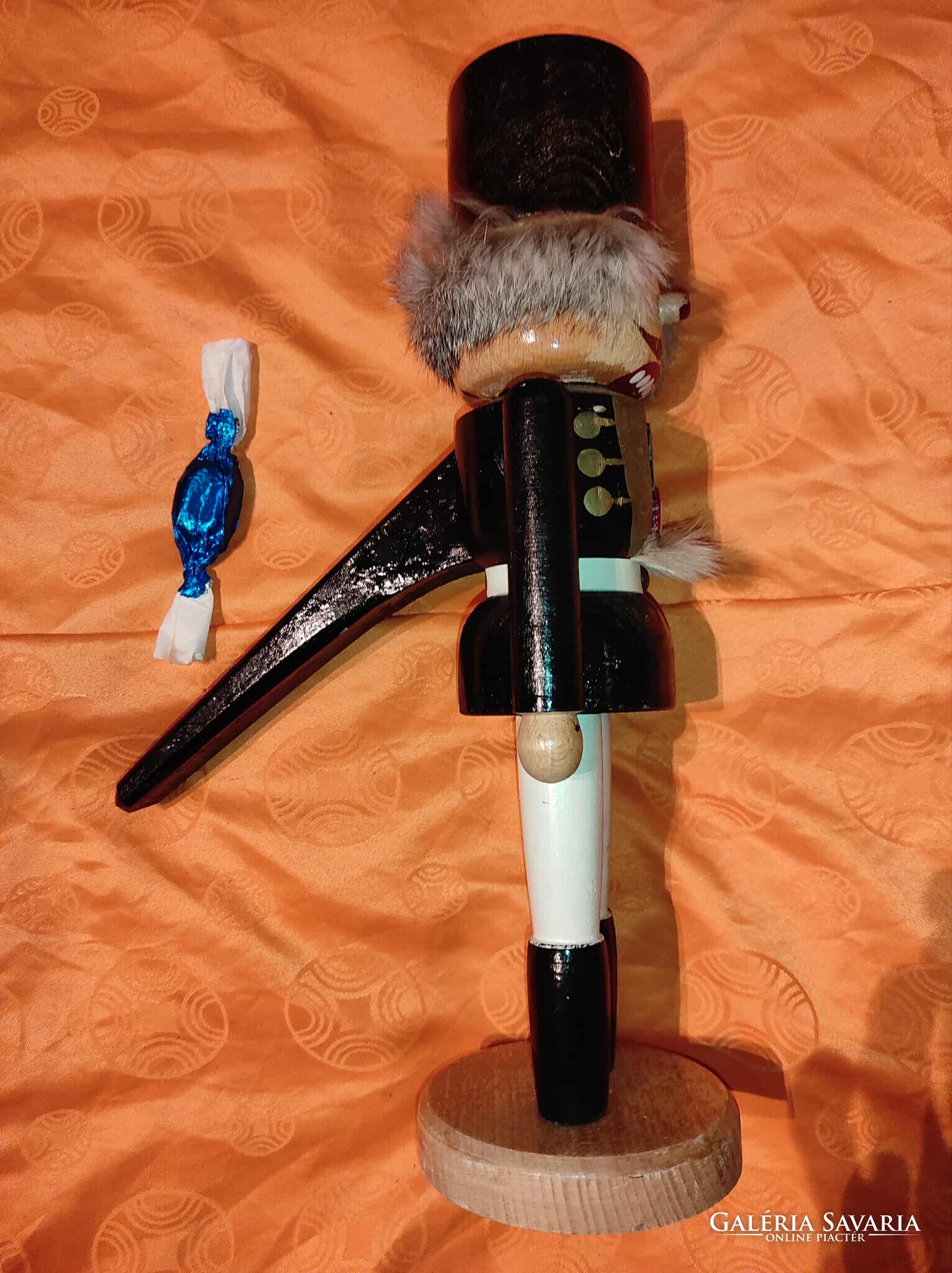 A dísz fából készült, korának megfelelő állapotban, festése kopottas. Fellelt állapotban. A különleges "Diótörő" mese figura átmérője a vállainál: 12 cm, magassága 40 cm.