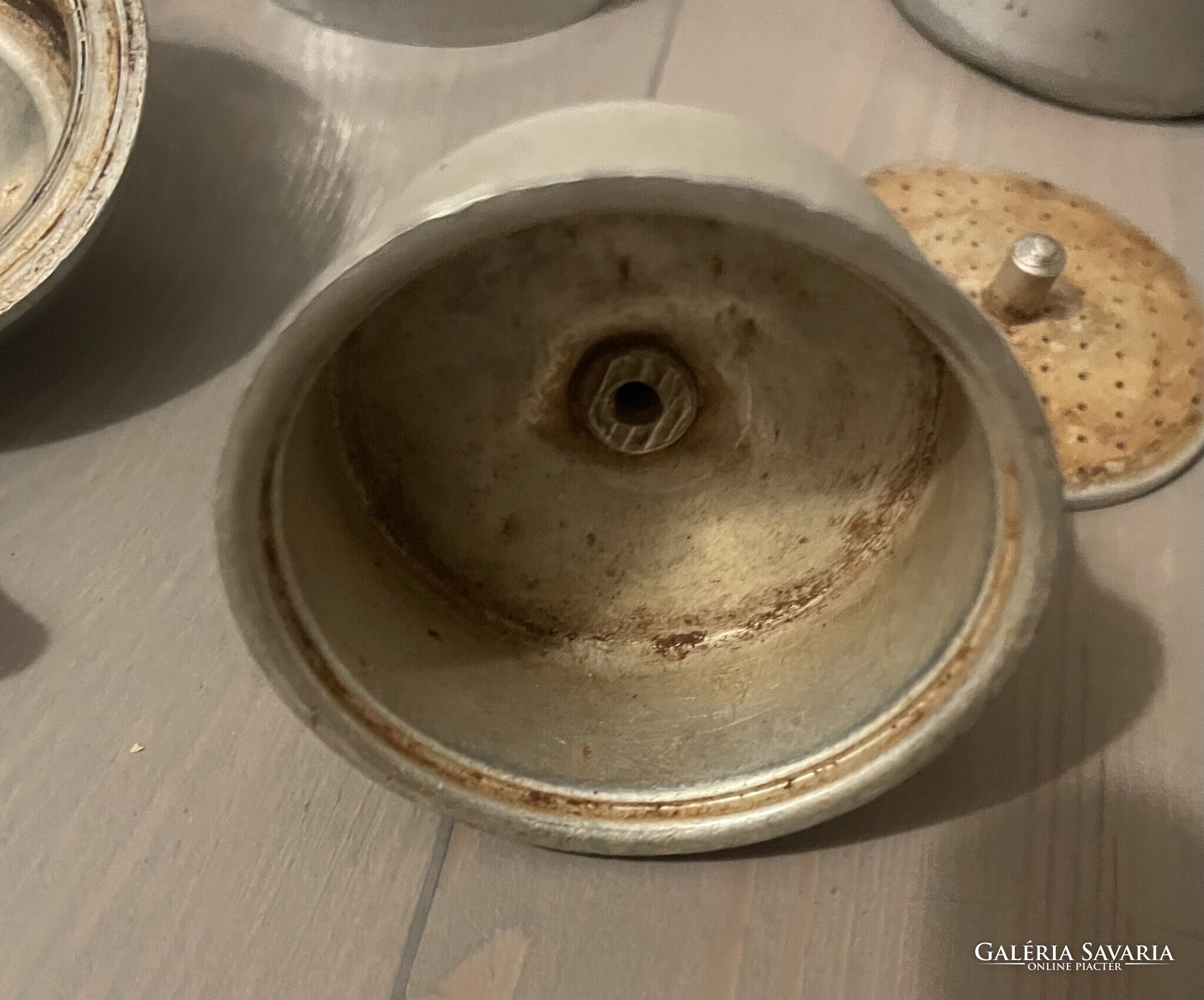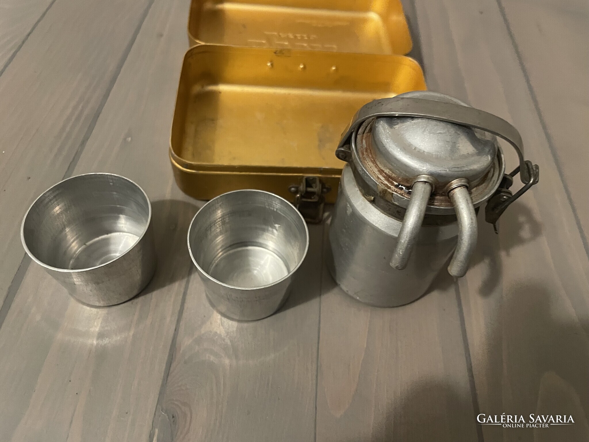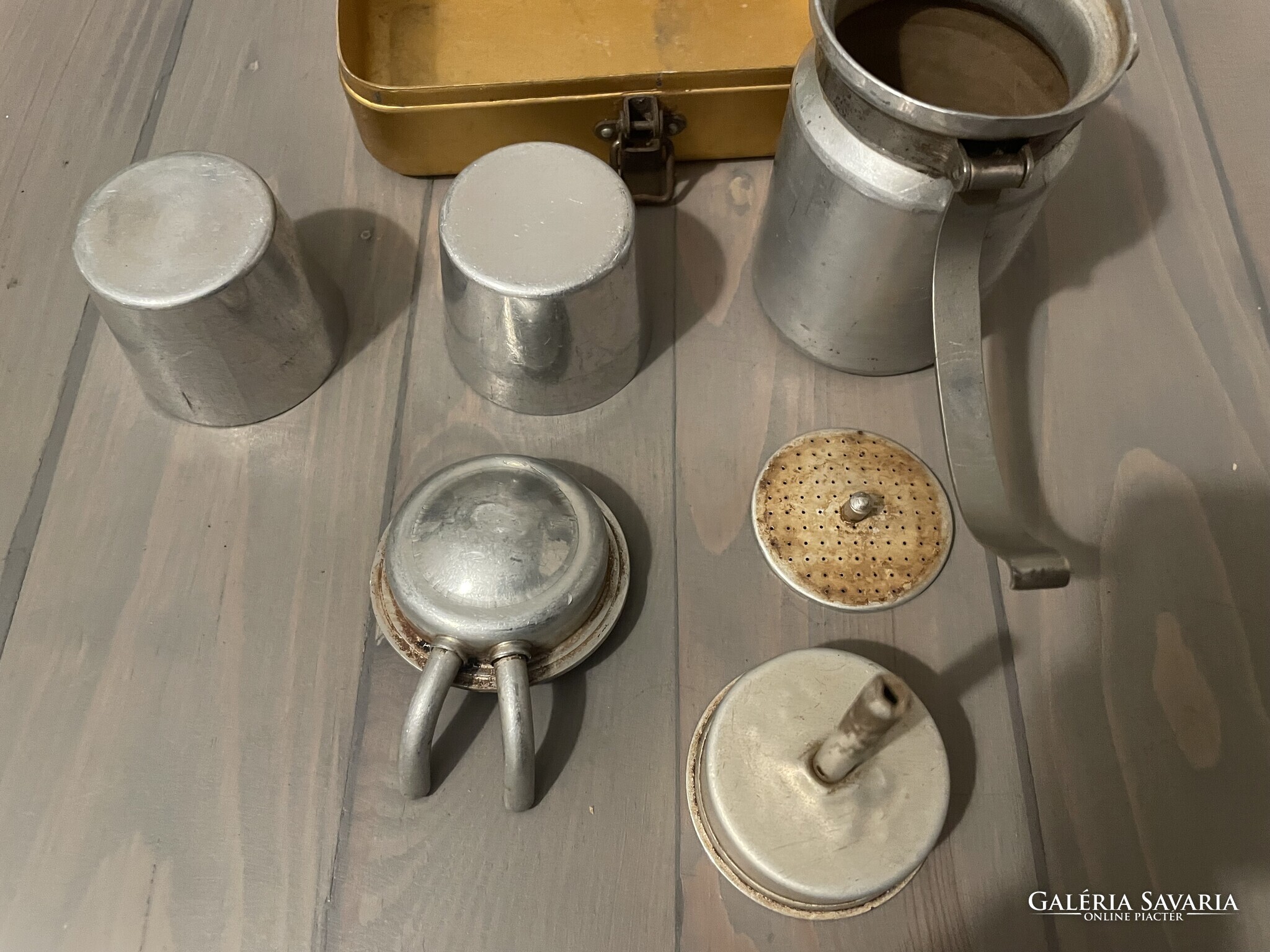 Két személyes Sport Presso kemping kávés készlet képek szerinti hiányos állapotban. A kávéfőzőből hiányzik a tömítés és sz alsó szűrő, egy alapos tisztítás ráfér. A tartozékokból csak a két pohár van meg. Doboz mérete: 14 x 9 x 6 cm.