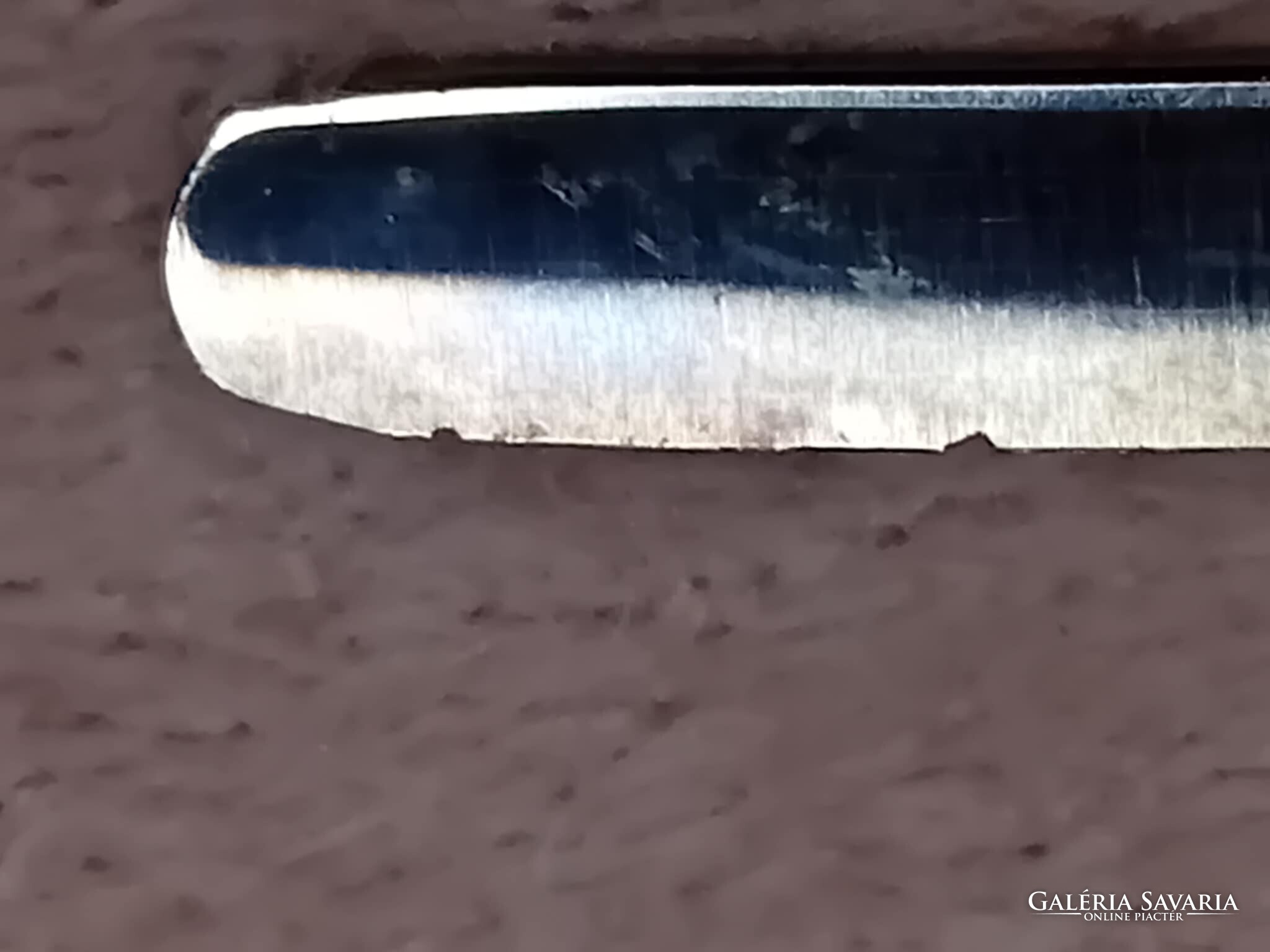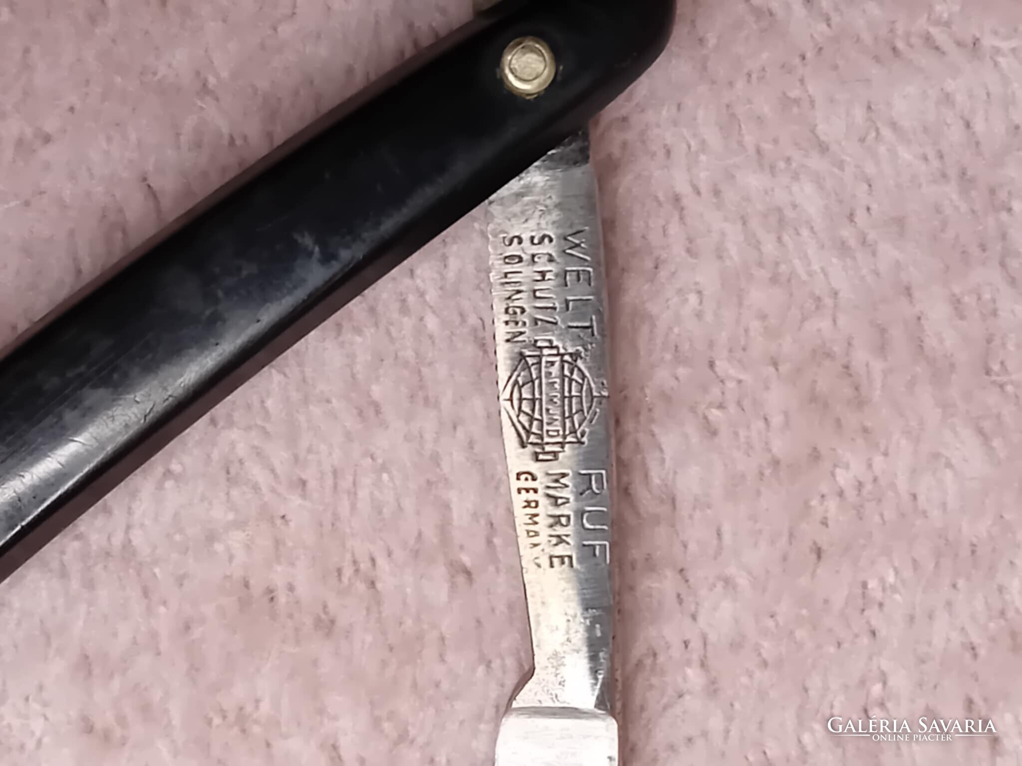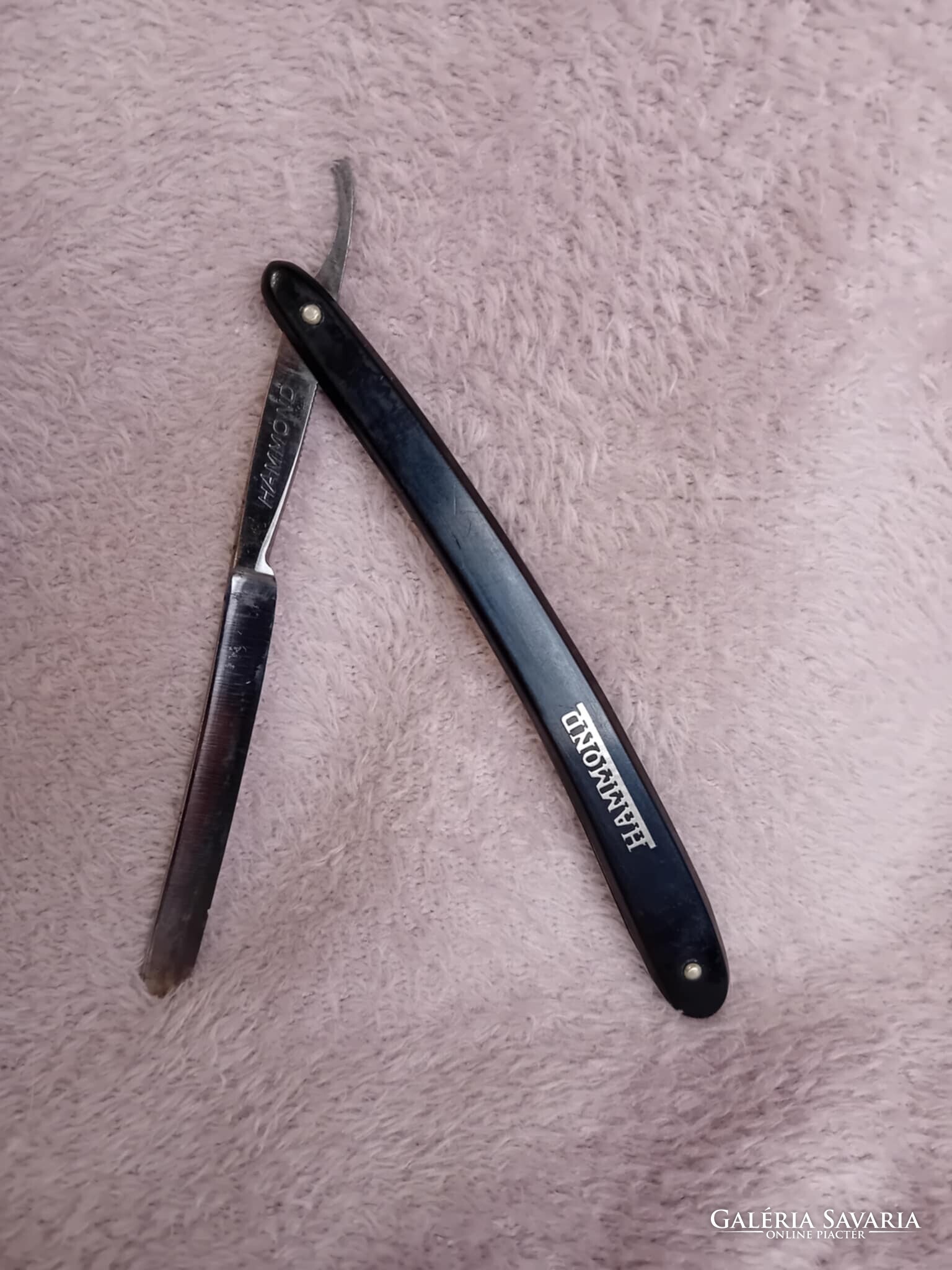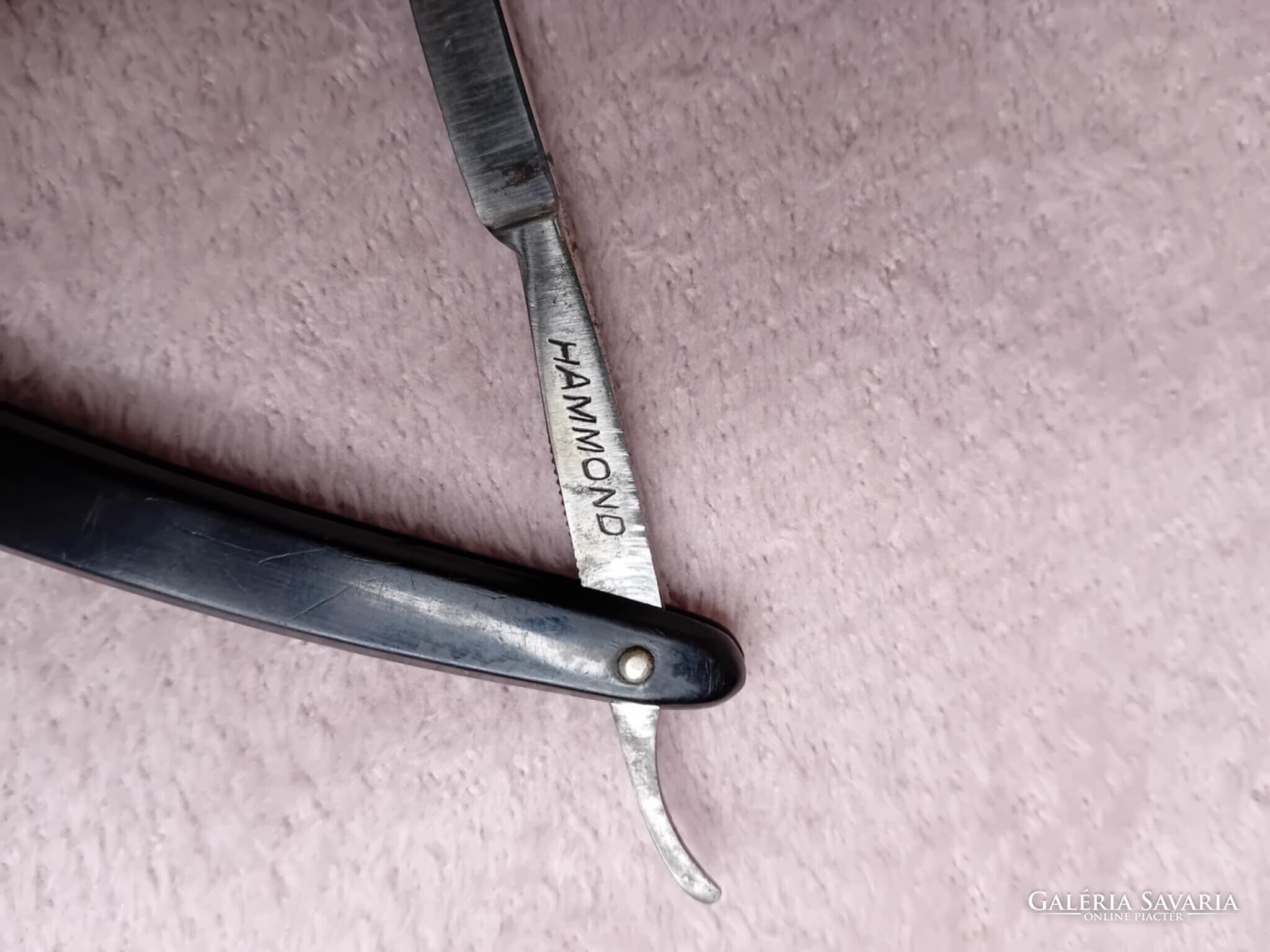 Eladó ez az 1920-as évekből származó német Hammond Solingen borotva a képeken látható, korának megfelelő állapotban. A pengén van két pici hiba, melyeket ötszörös nagyítással tudtam lefotózni. Ezt leszámítva nagyon szép állapotban van. Nyél hossza: 13 cm, penge hossza: 7 cm.