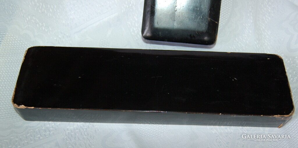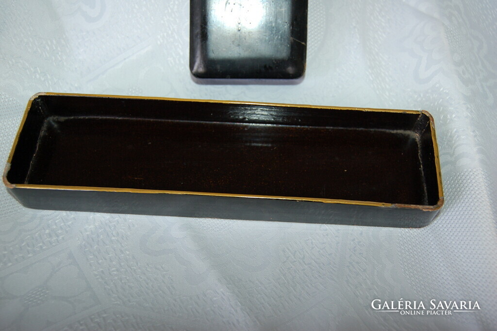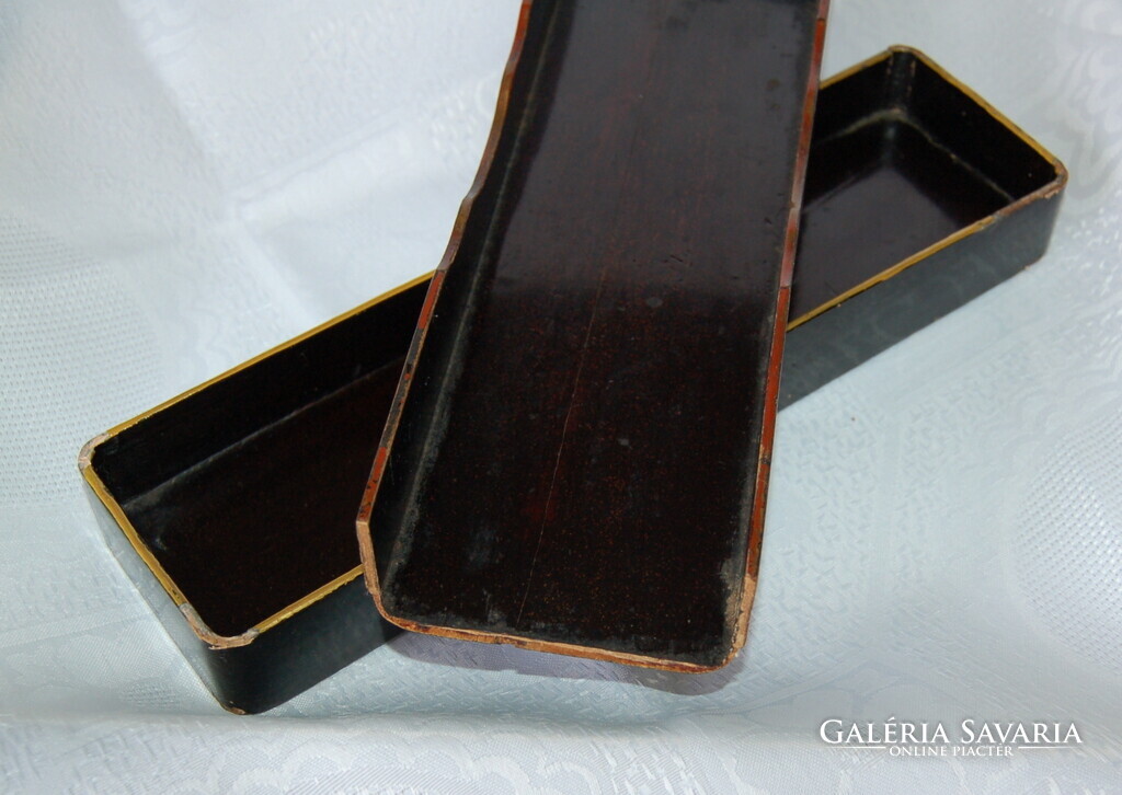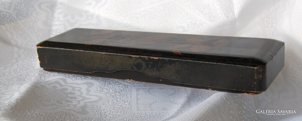 Állapot: A doboz sajnos sérült: a fedél egyik rövid vége hiányzik, valamint a lakkfelületen több helyen lepattanások és kopások láthatóak az élek mentén. A belső rész és az alja korának megfelelő állapotú.
