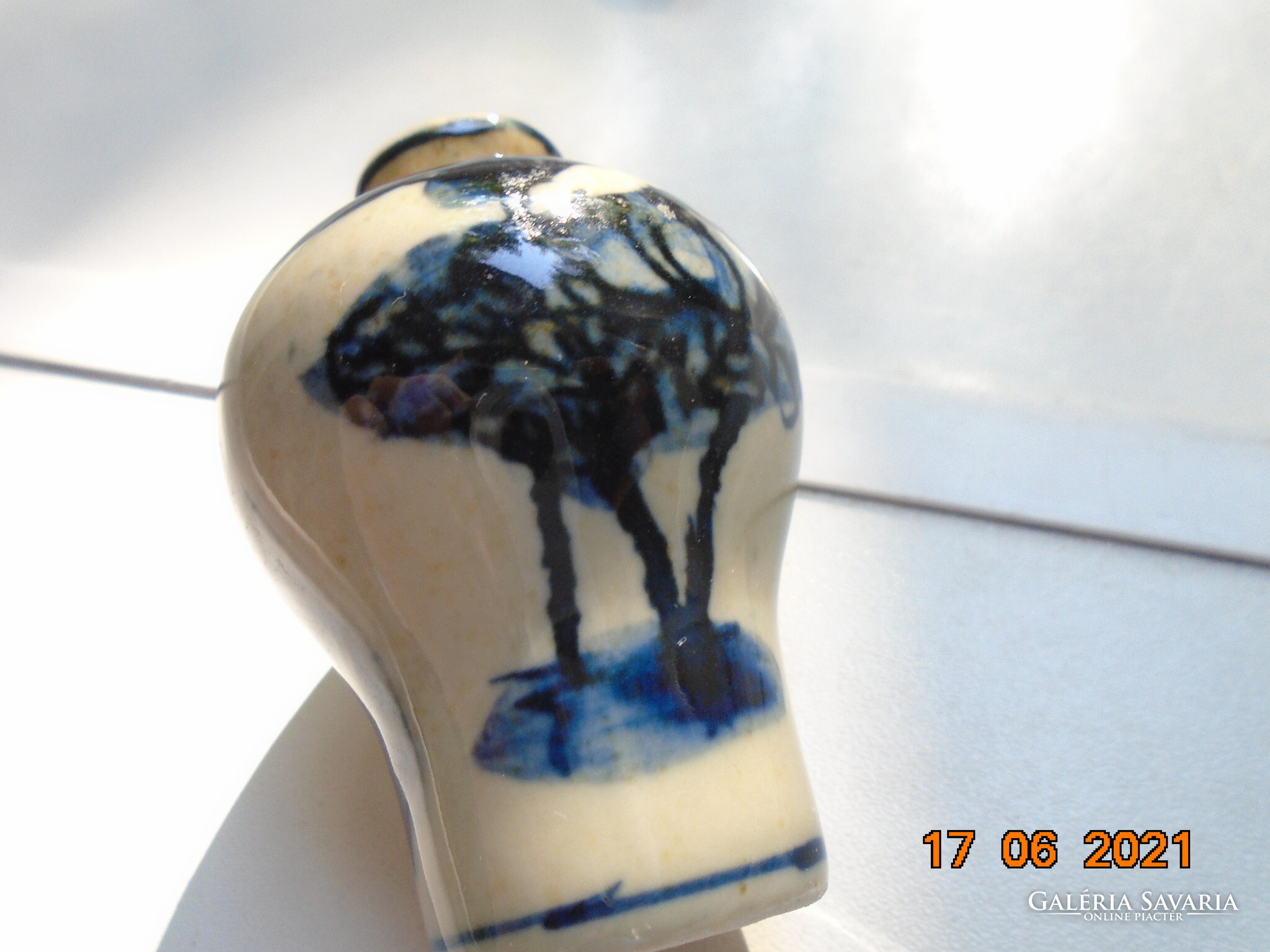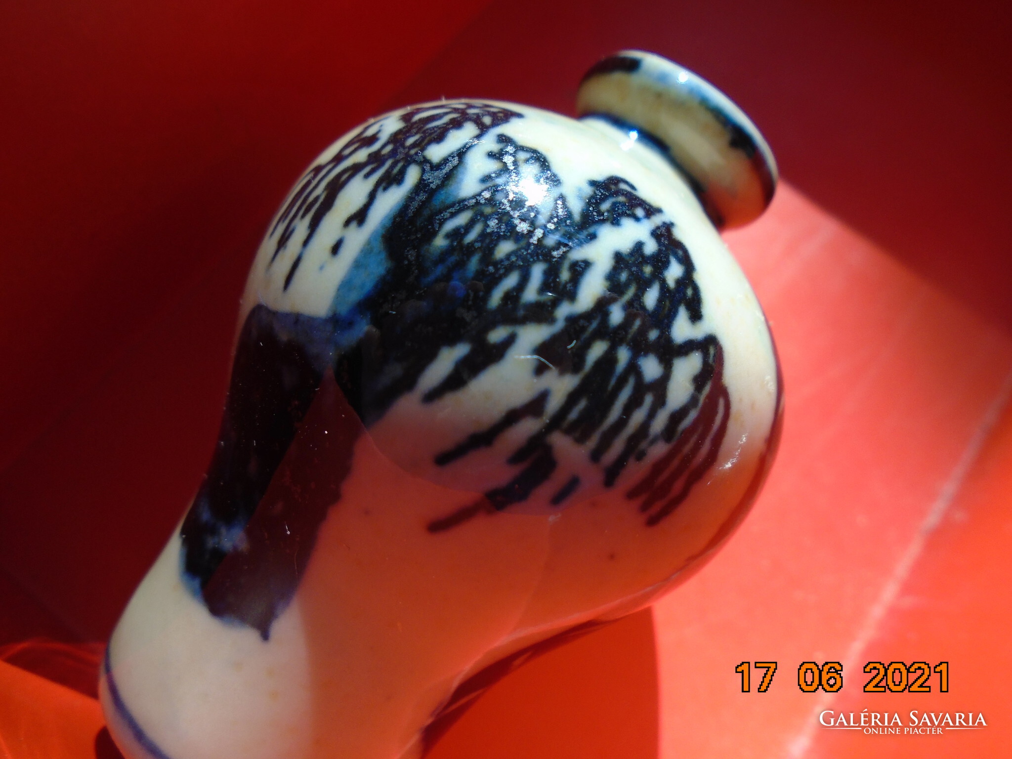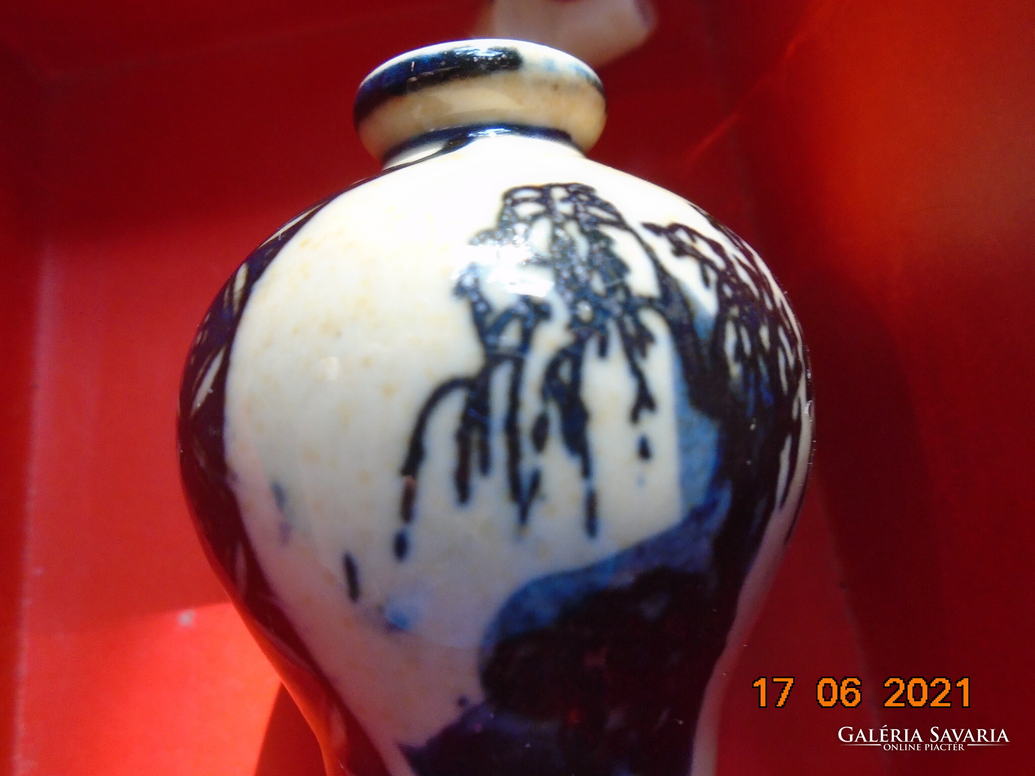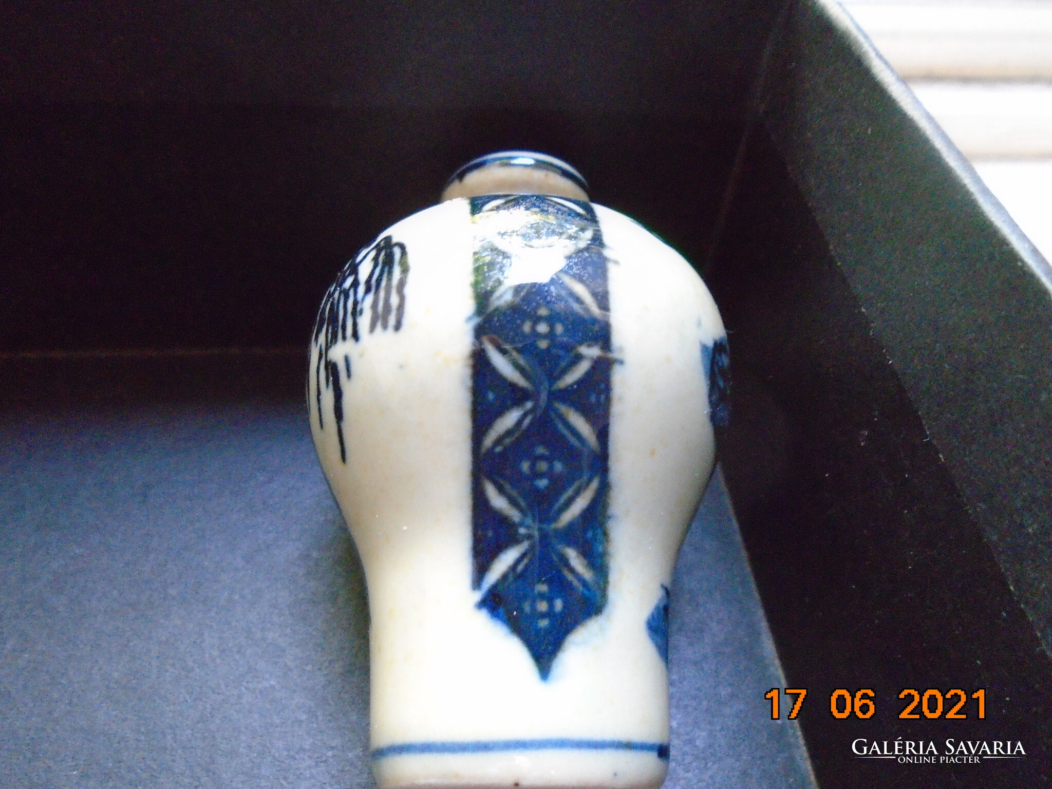 Kobaltkékkel kézzel festett kínai tubákos palack. Kétoldalán két különböző fa van festve. A fa mintákat két díszítő sáv választja el mely nyakától indul.
