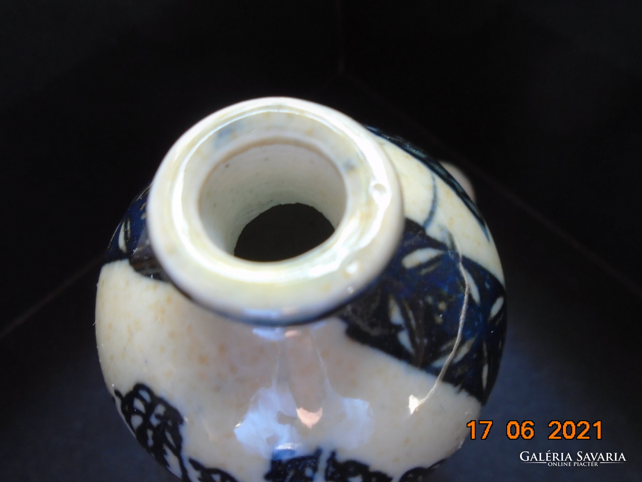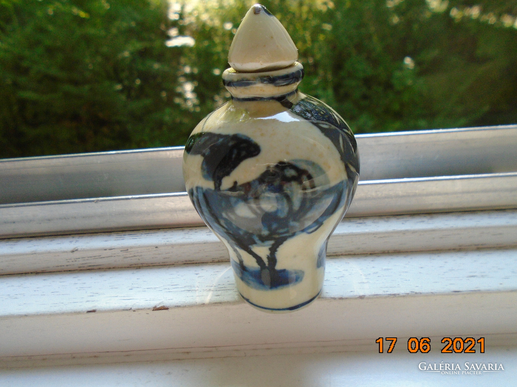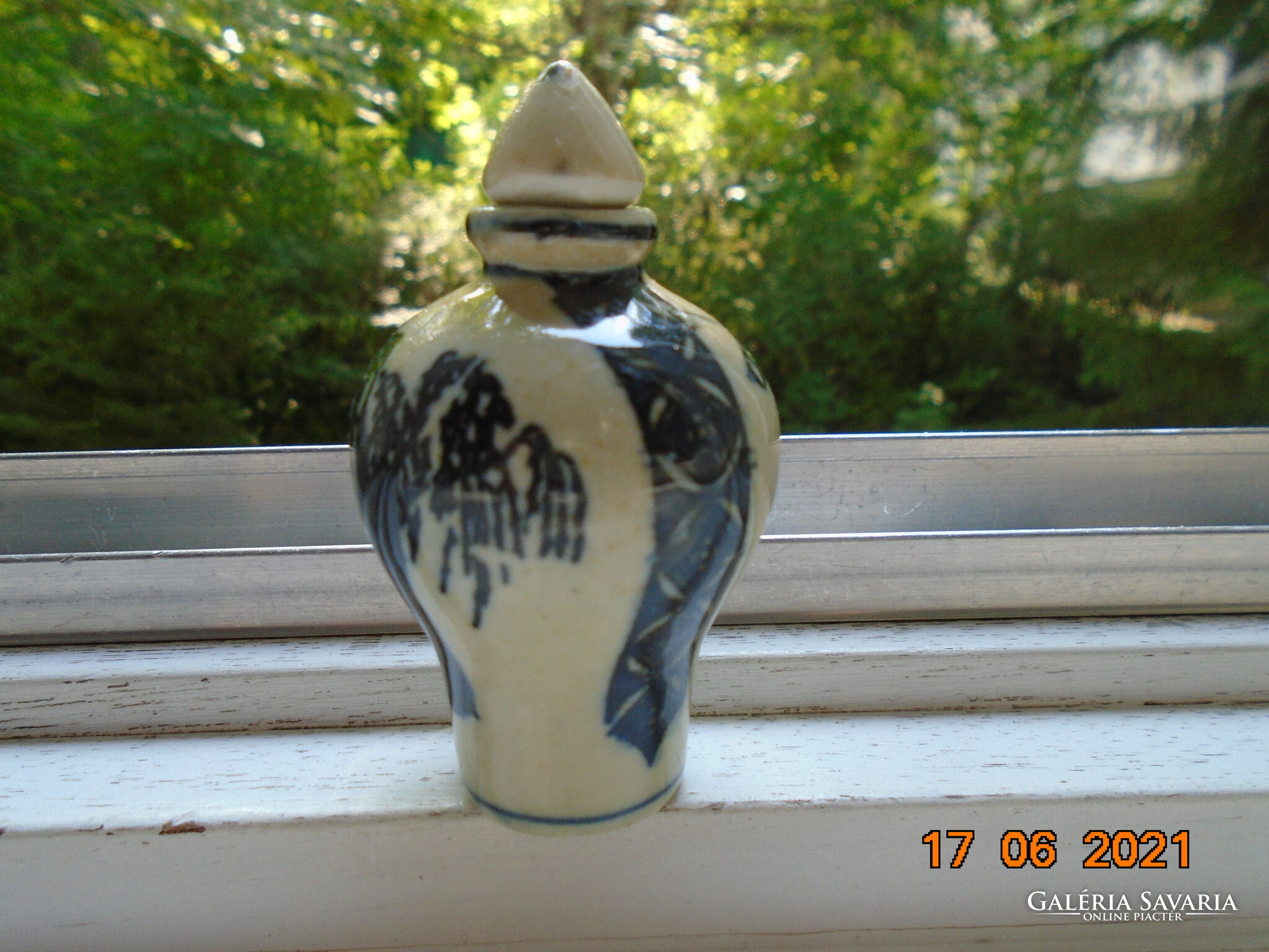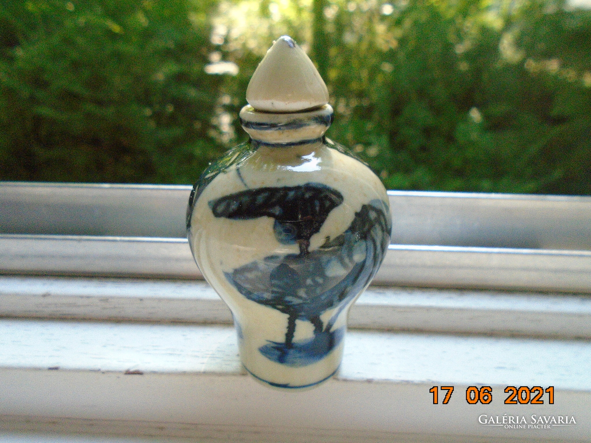 Kobaltkékkel kézzel festett kínai tubákos palack. Kétoldalán két különböző fa van festve. A fa mintákat két díszítő sáv választja el mely nyakától indul.