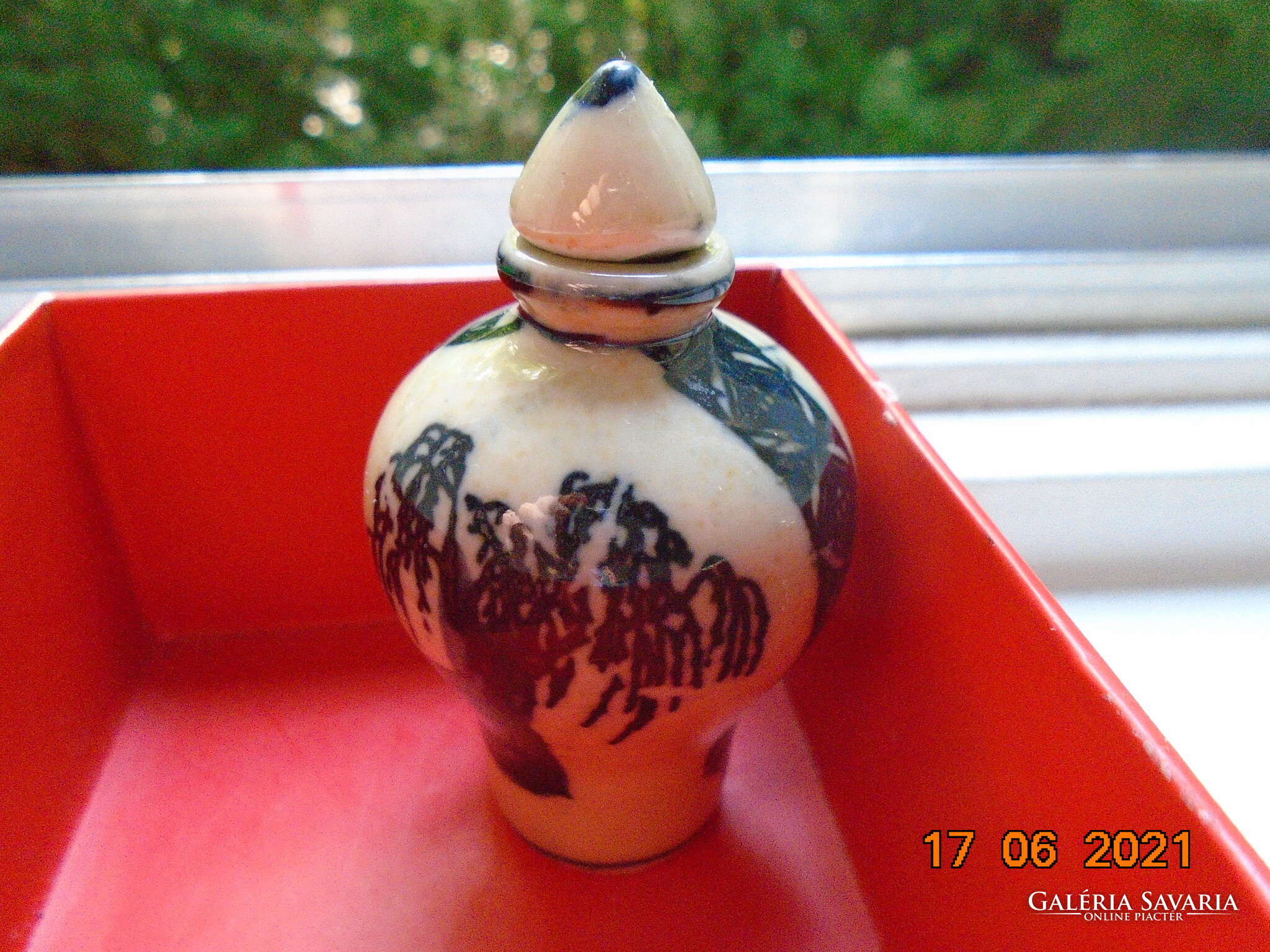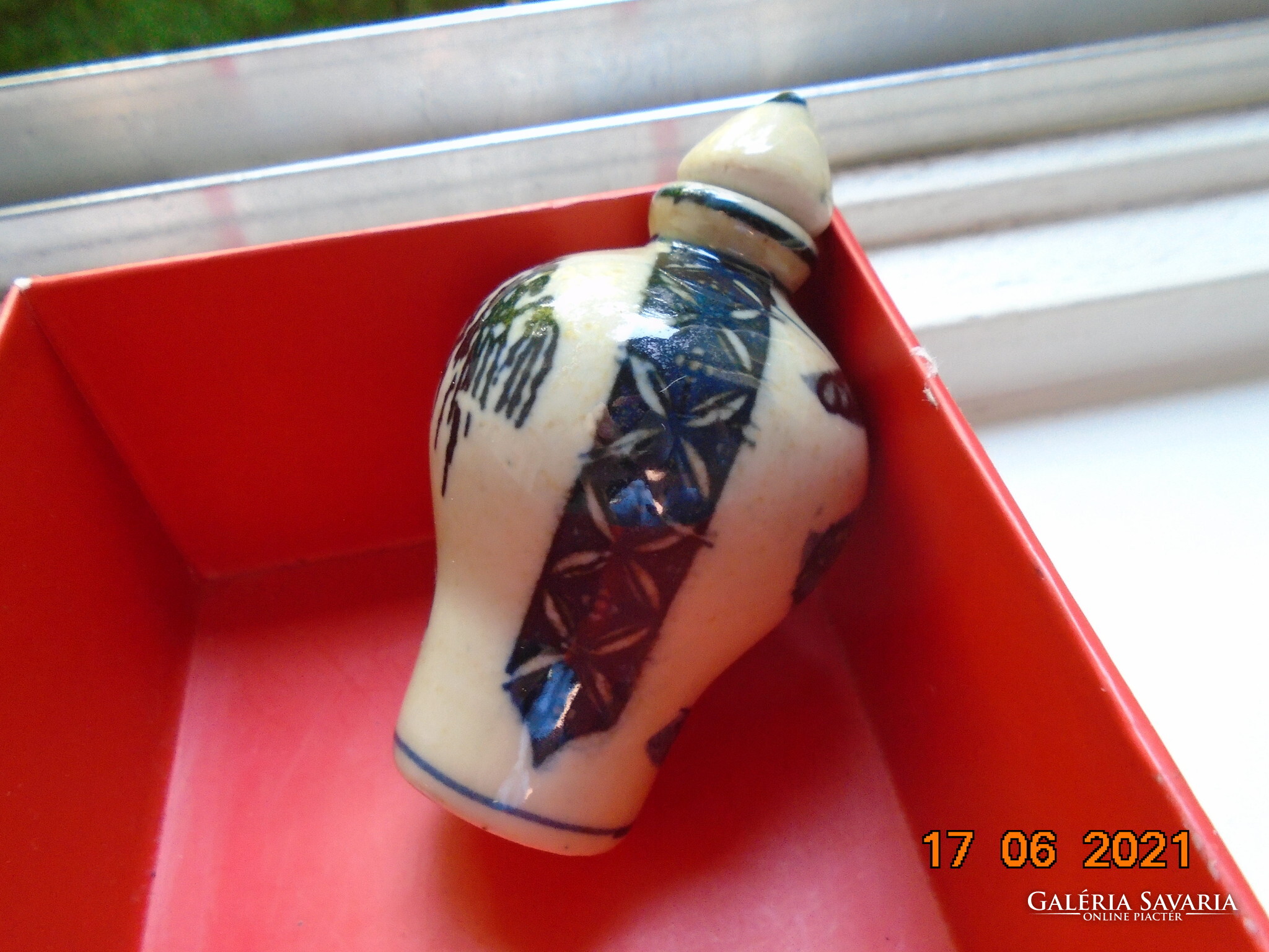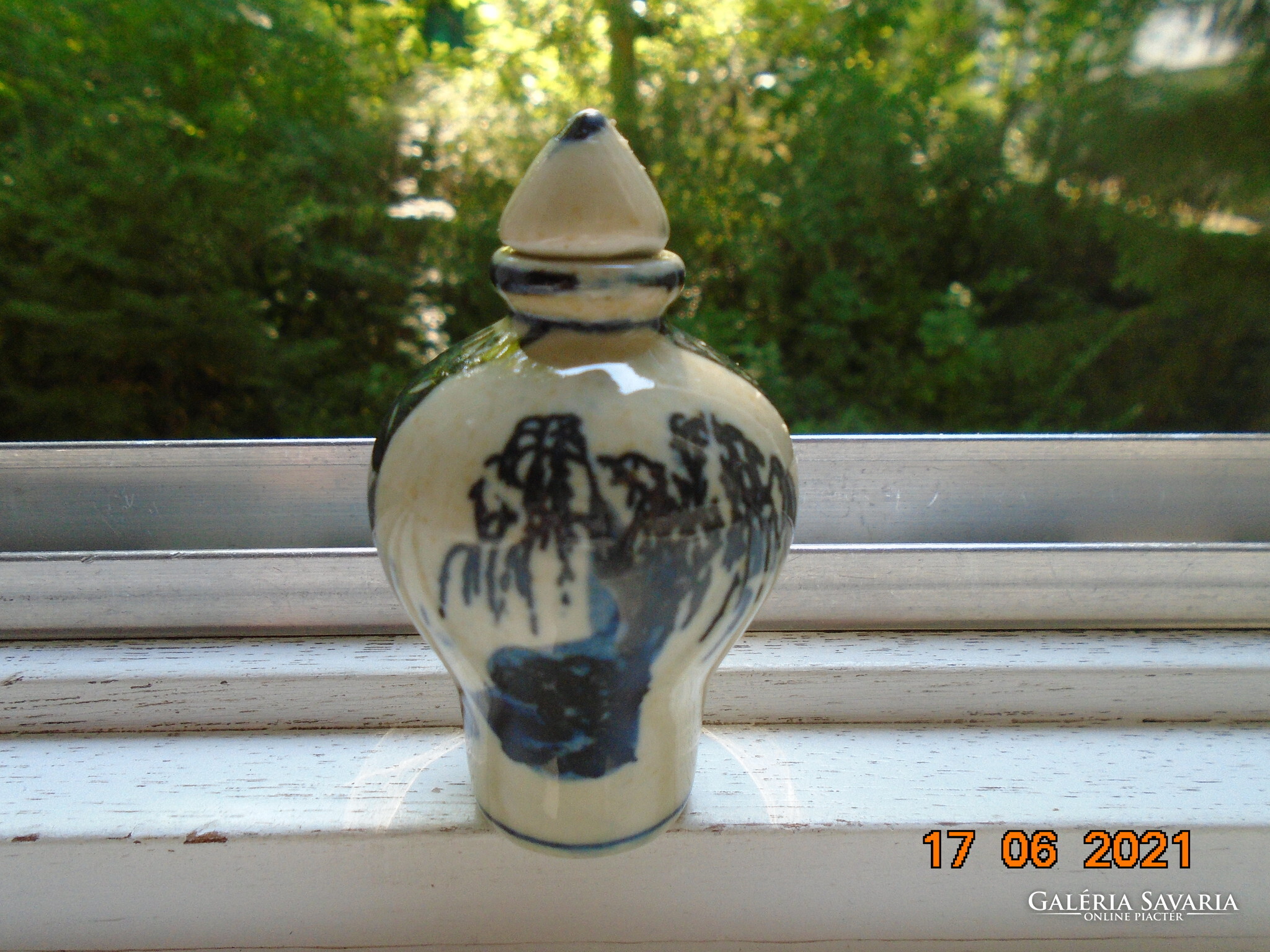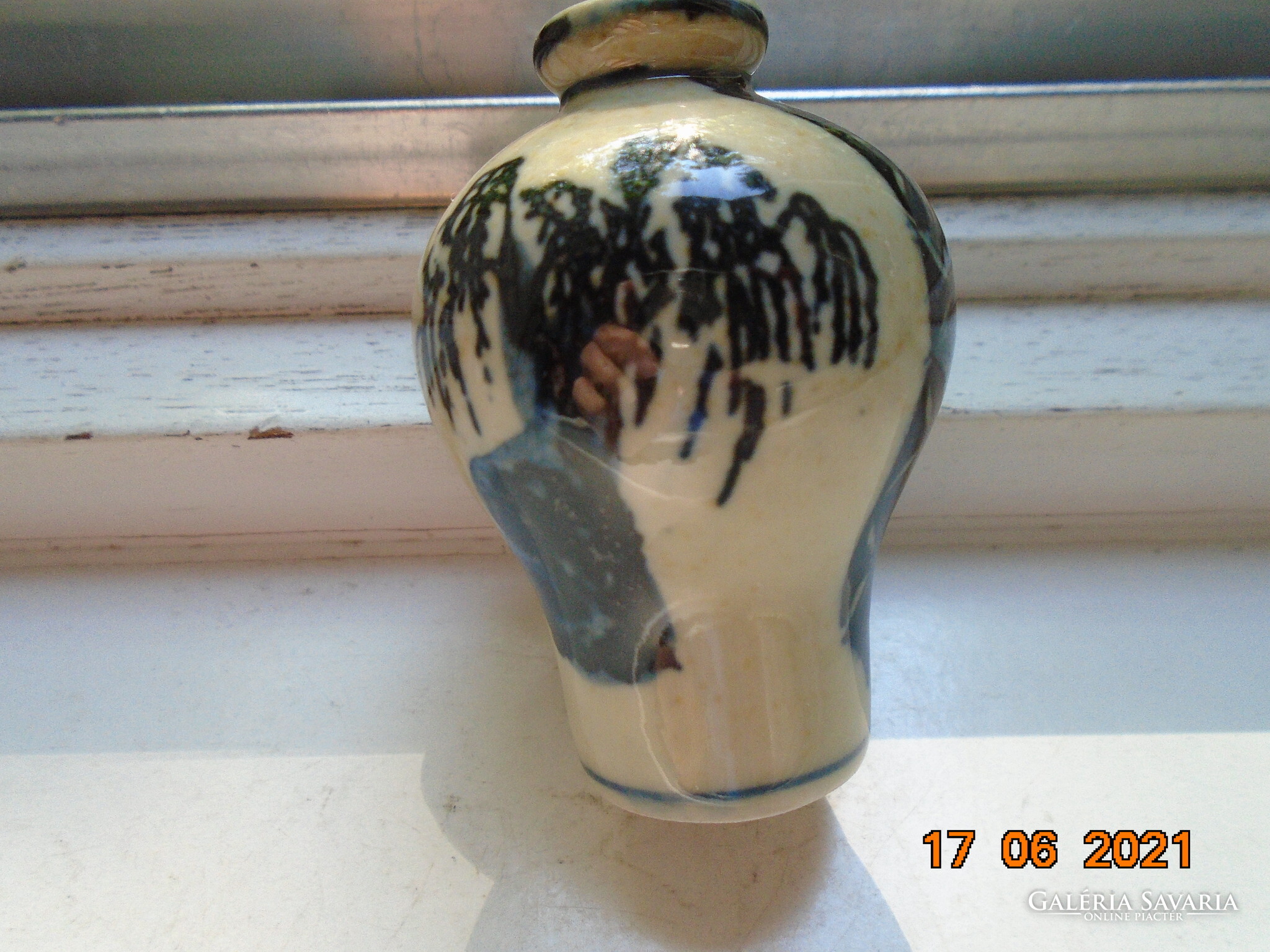 Kobaltkékkel kézzel festett kínai tubákos palack. Kétoldalán két különböző fa van festve. A fa mintákat két díszítő sáv választja el mely nyakától indul.