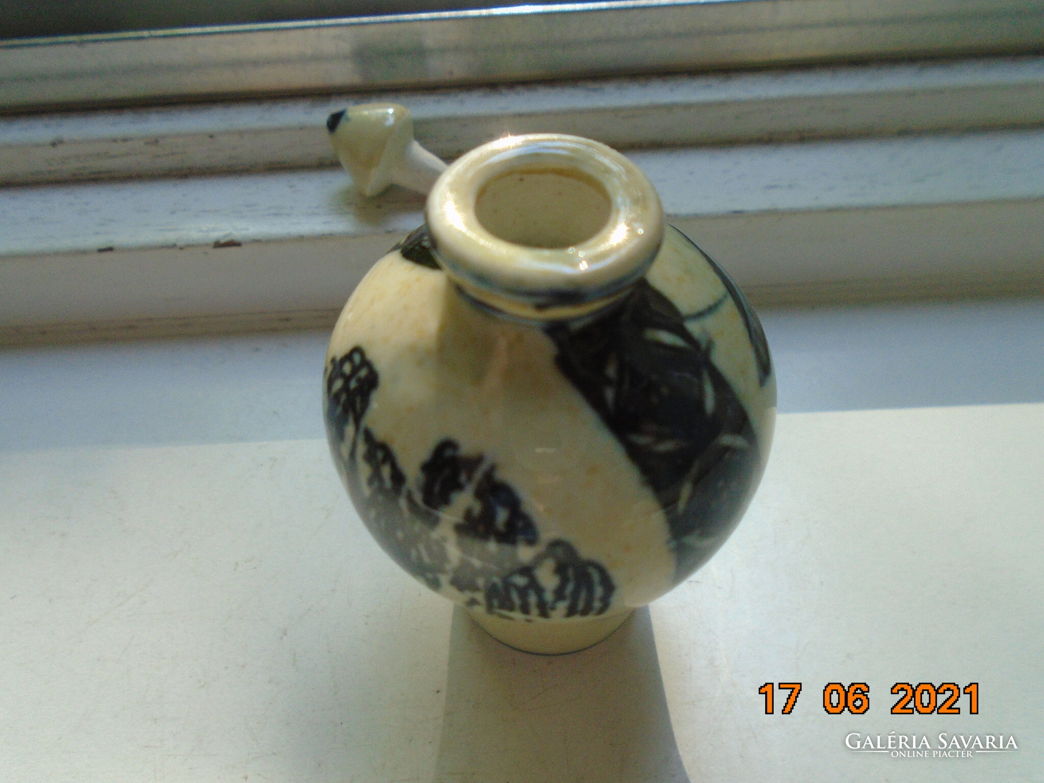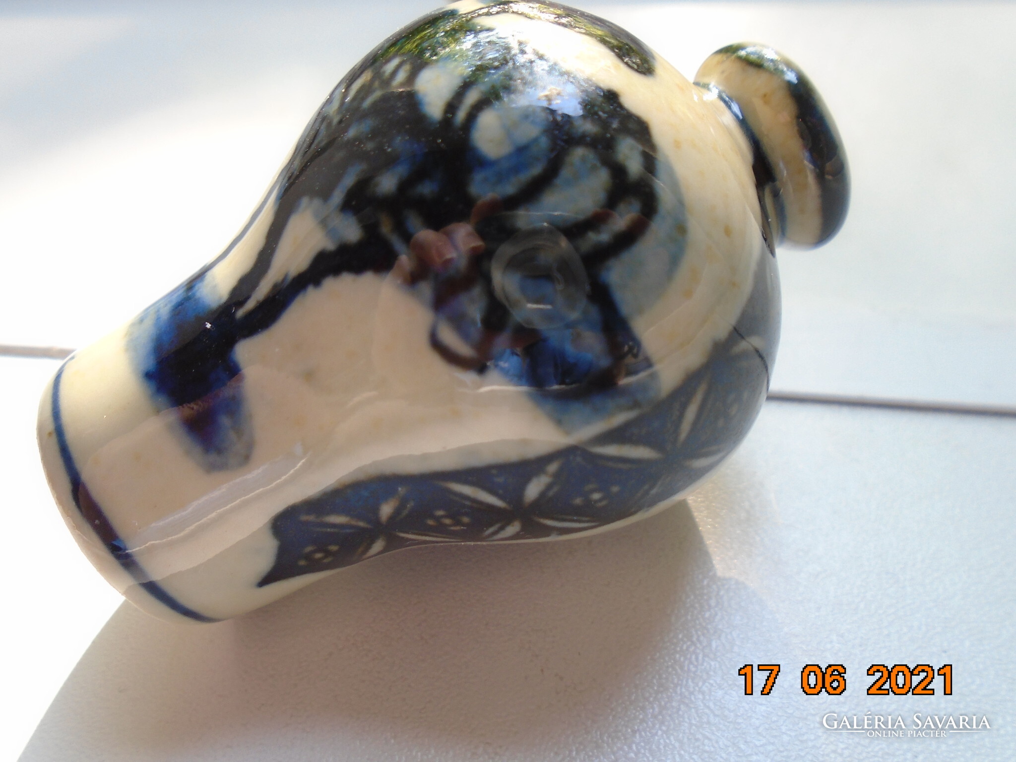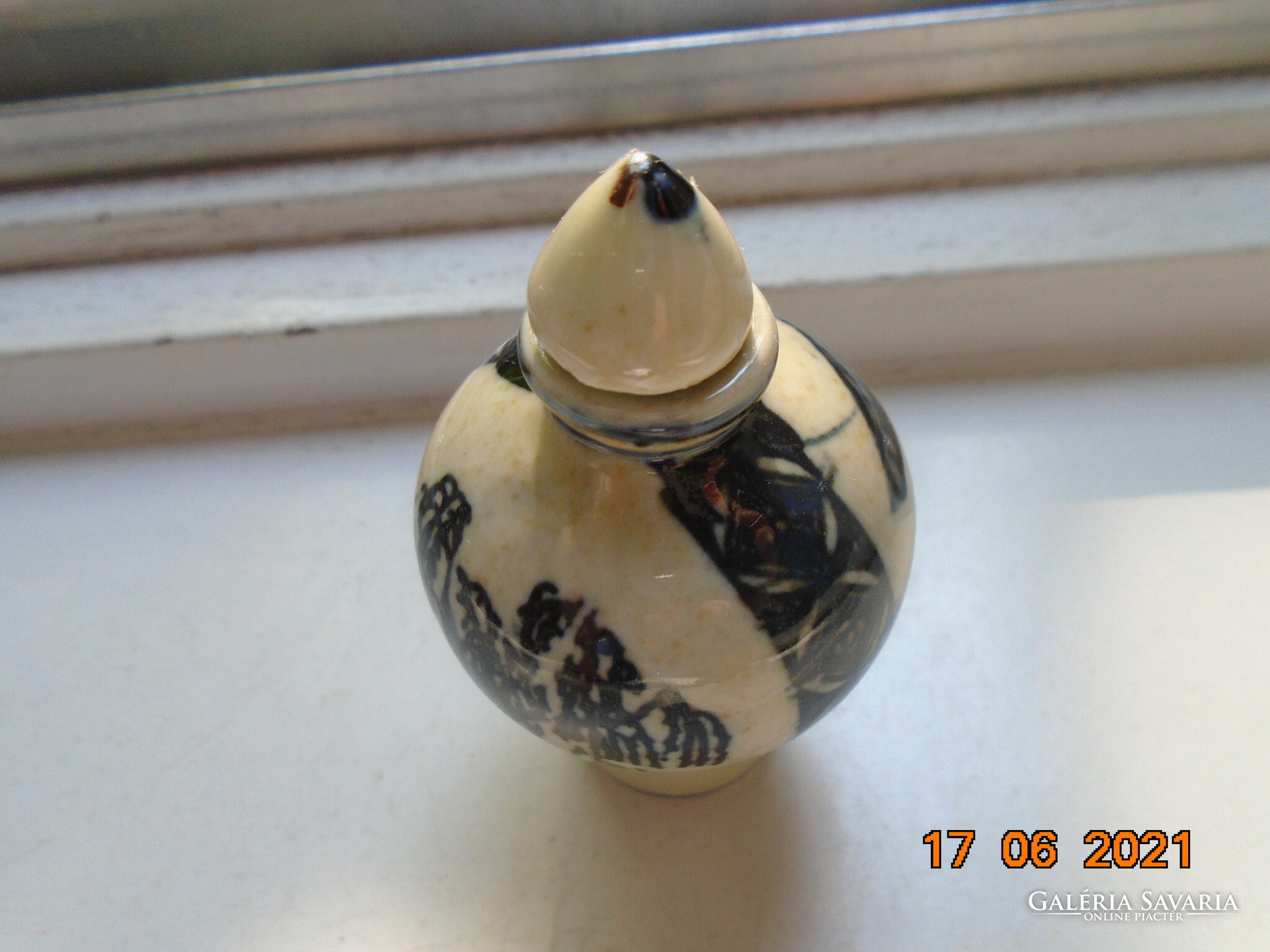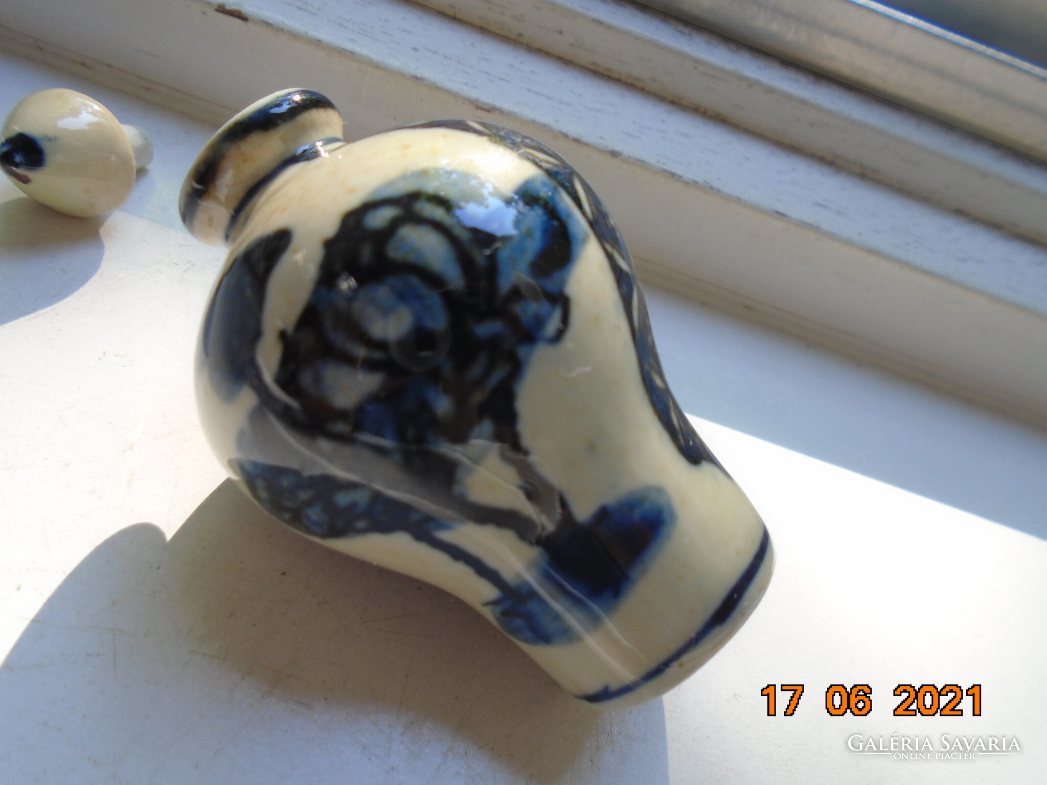 Kobaltkékkel kézzel festett kínai tubákos palack. Kétoldalán két különböző fa van festve. A fa mintákat két díszítő sáv választja el mely nyakától indul.
