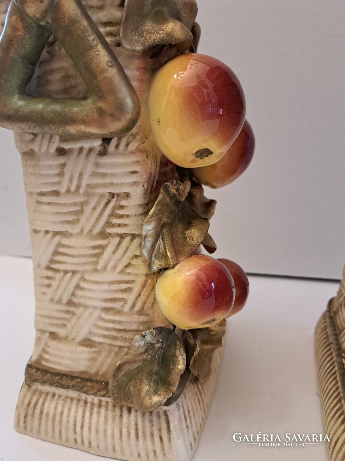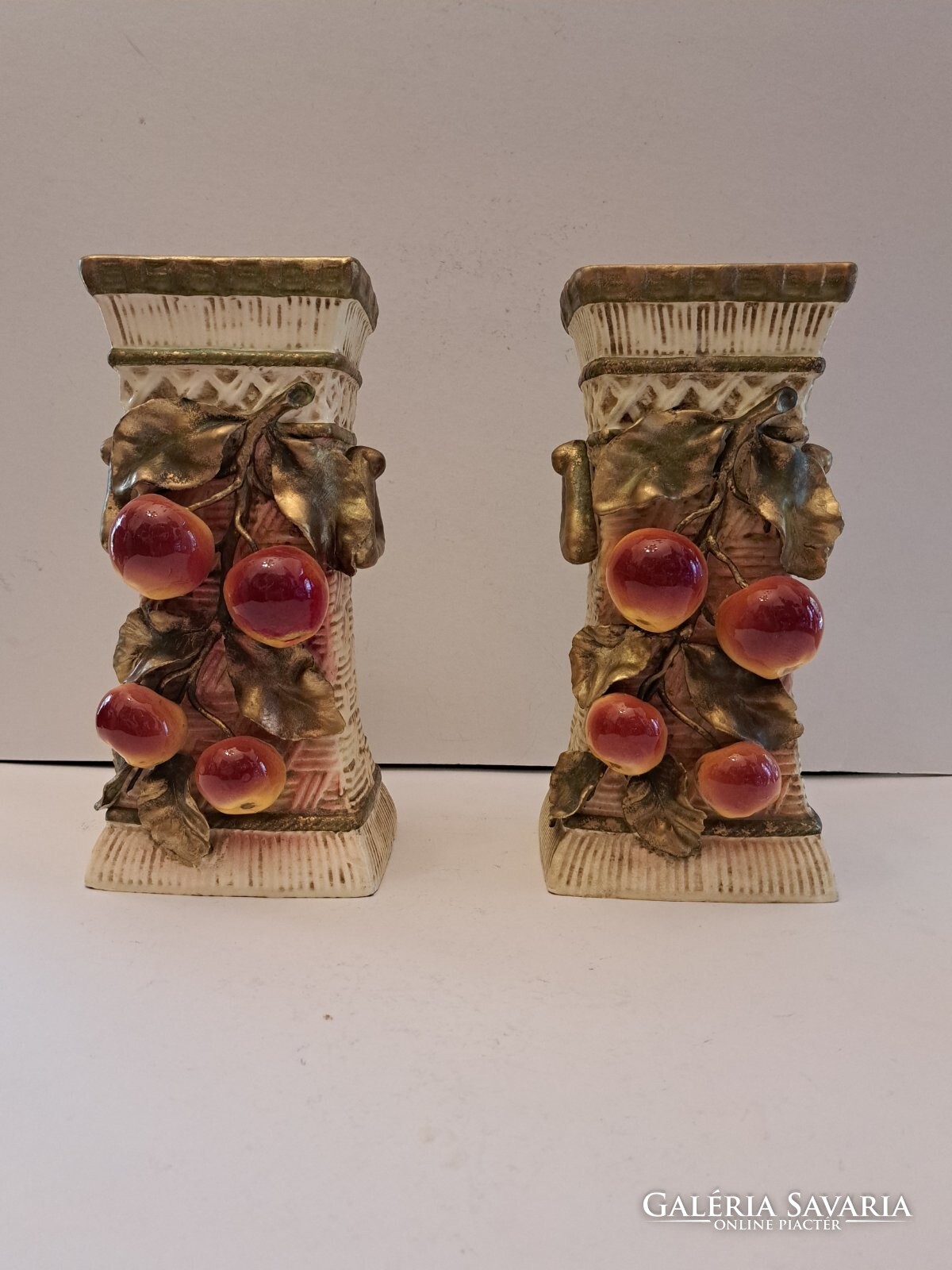 Eladó a képeken látható osztrák, jelzett, eredeti, antik Julius Strnact (1882-1914) fajansz/majolika páros díszváza. Rendkívül impozáns, plasztikus kivitelezés. A gyárra jellemző gyümölcsökkel, faágakkal, levelekkel díszítve. Bármely polgári otthon színvonalas, szemet gyönyörködtető dísze lehet.
