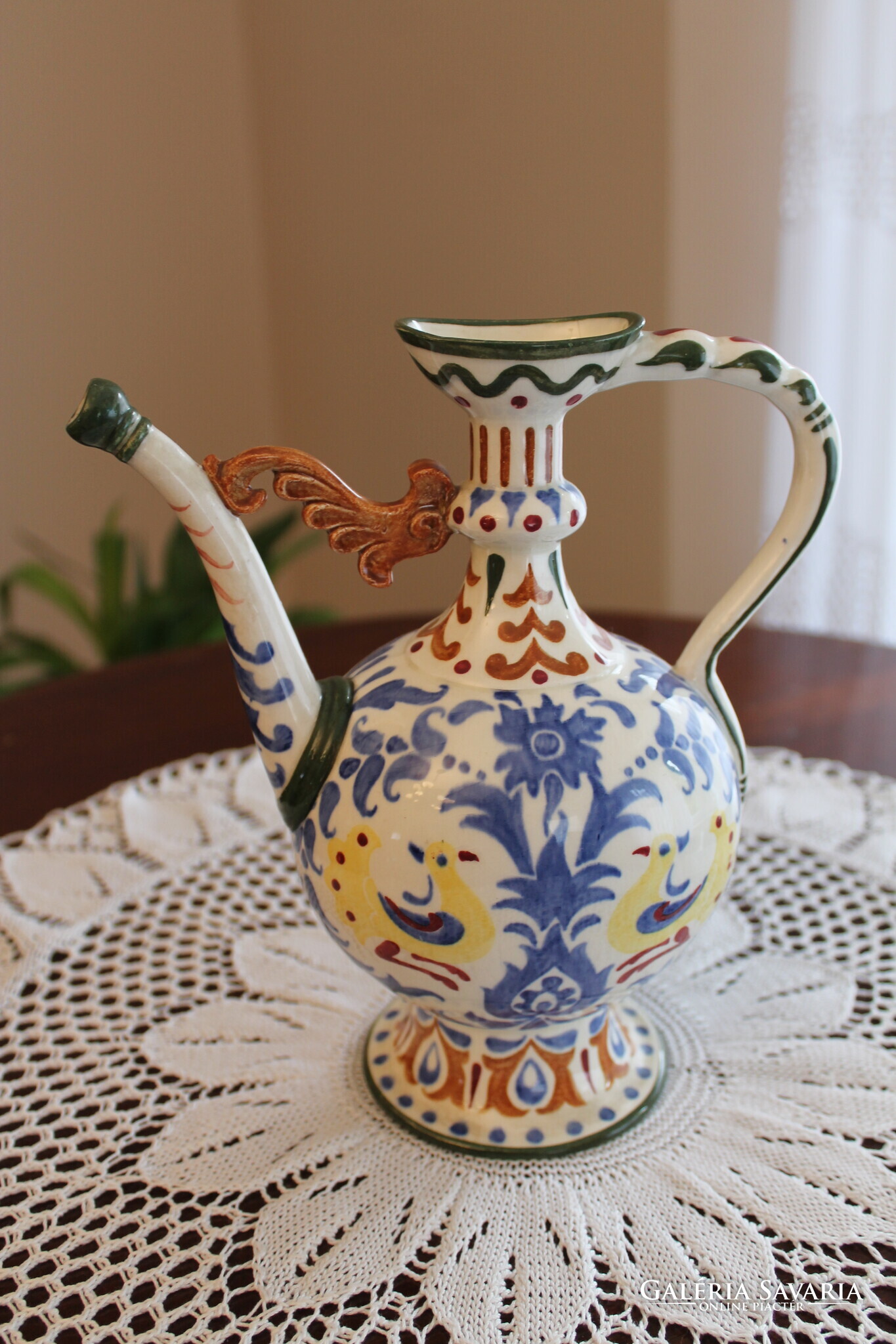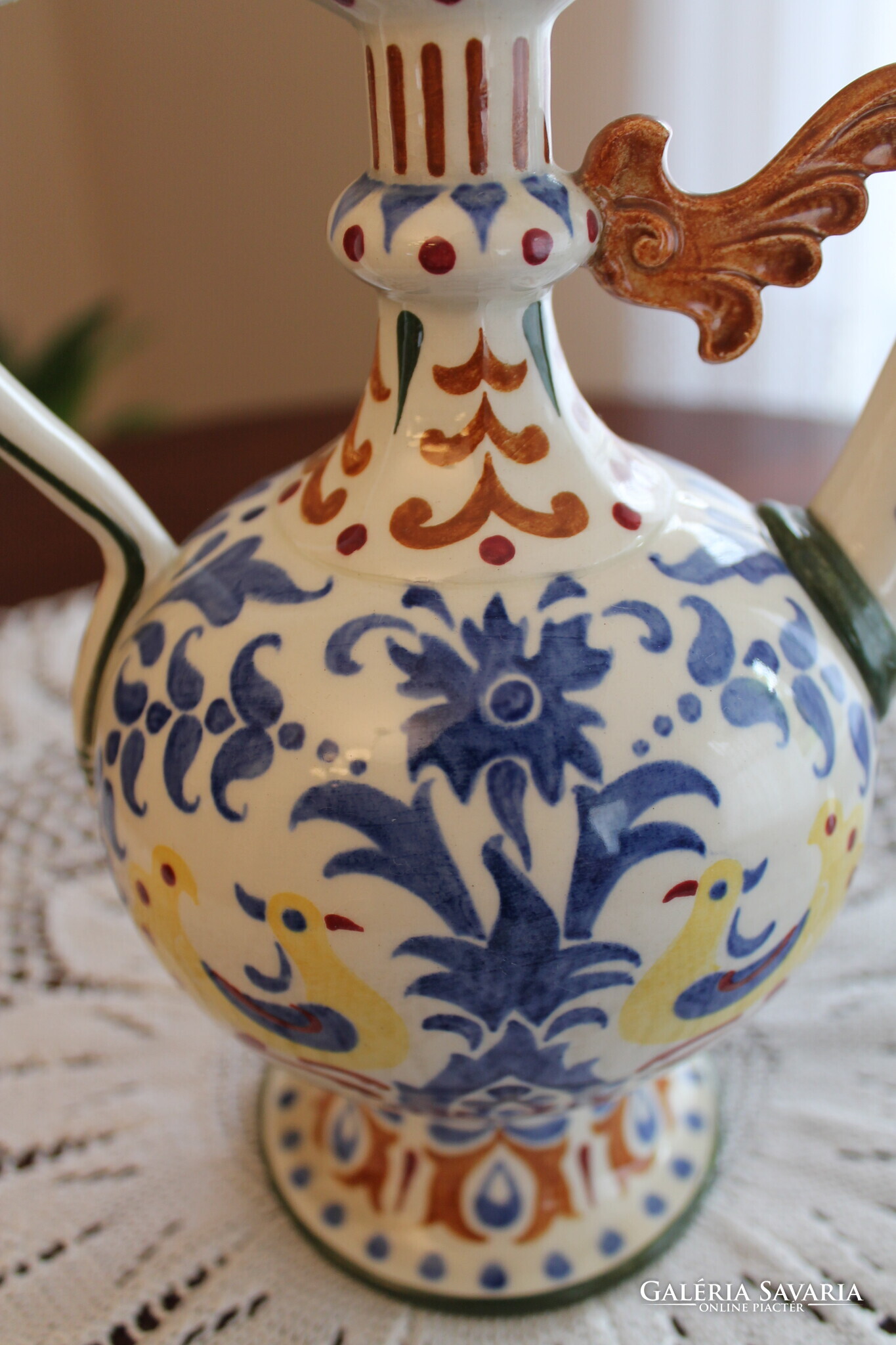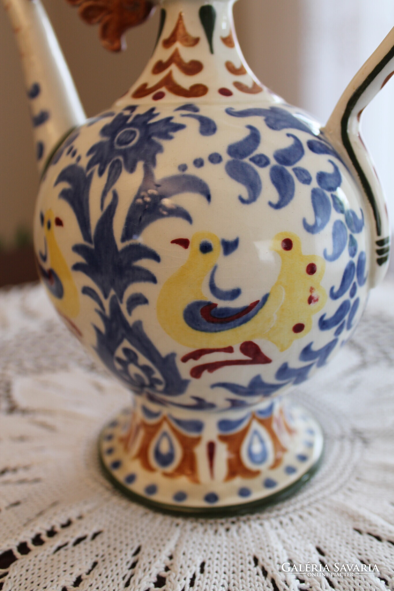 Zsolnay körbélyegzős Nikelszky Géza kiöntő, különleges és egyedi népi szecesszió kiemelkedő darabja. Jelzett az alján, mérete, magasság 21 cm, szélesség 20,5 cm, átmérő 11,5 cm.