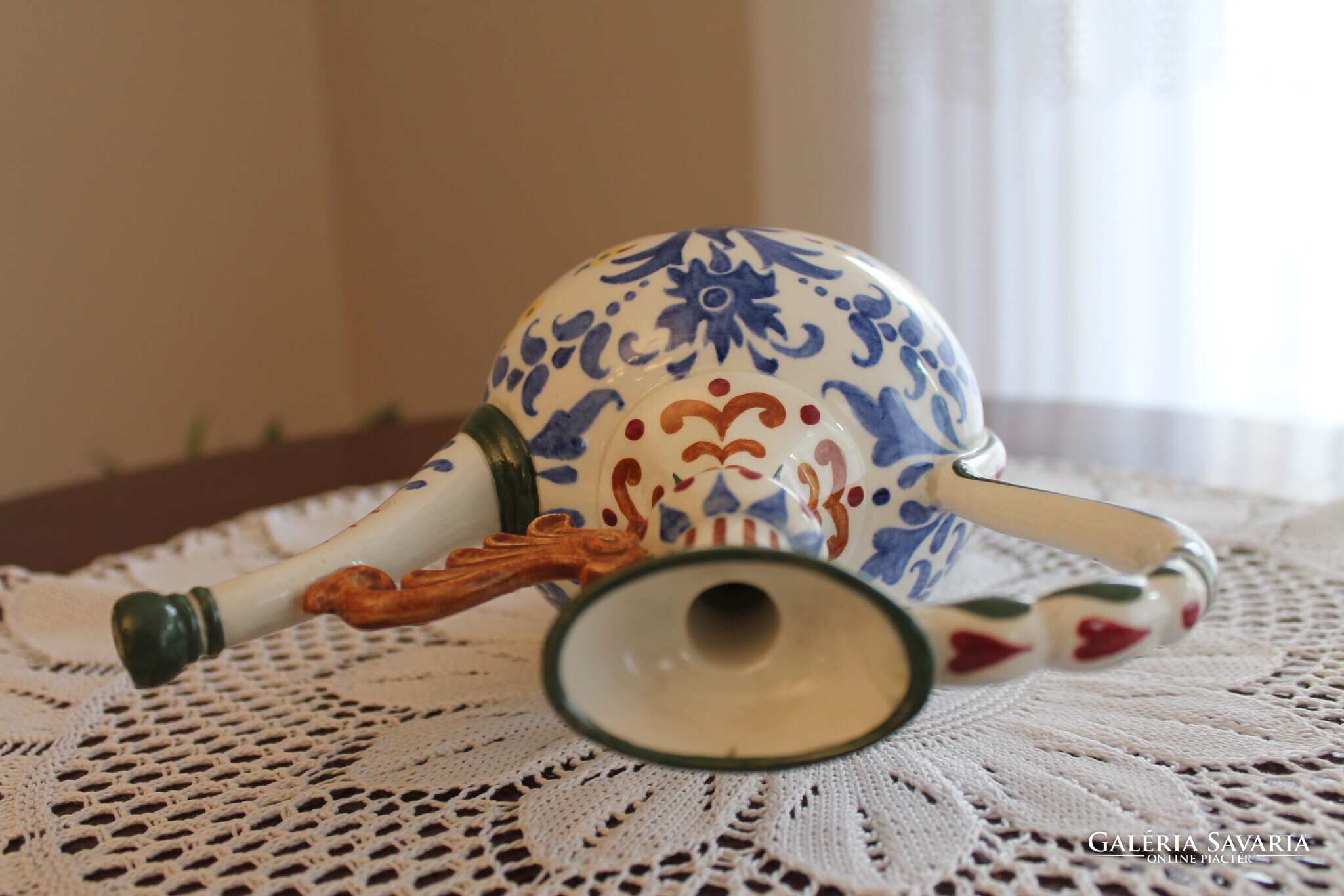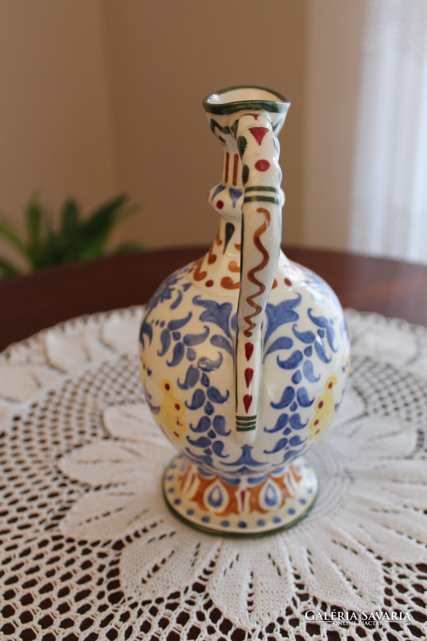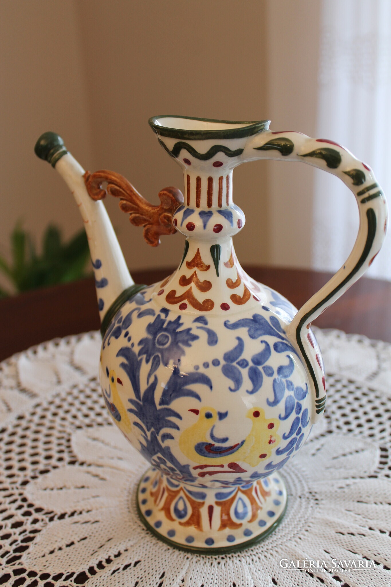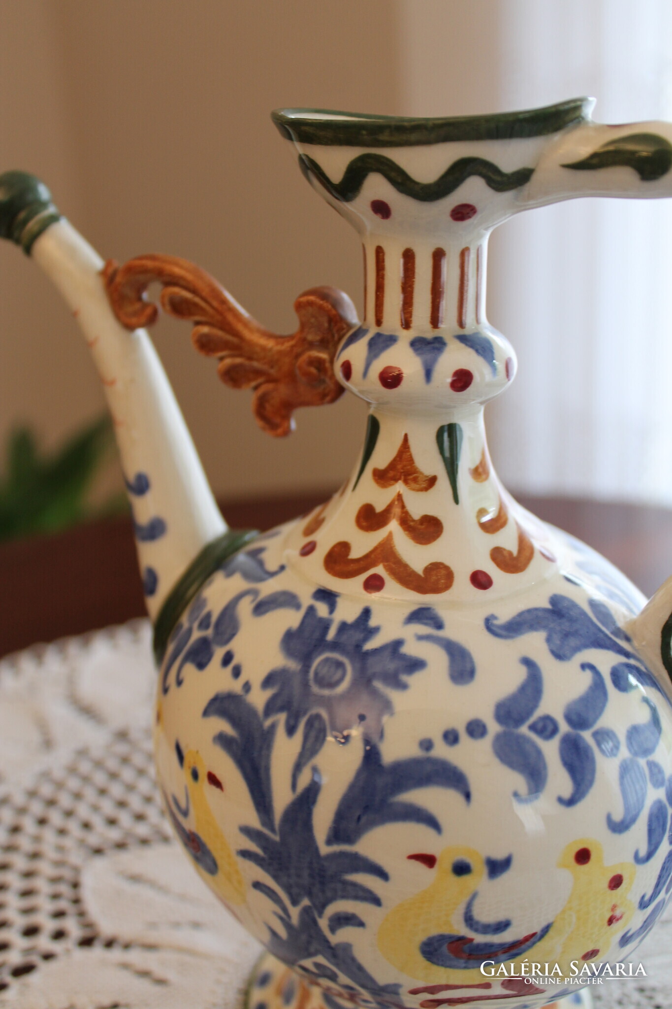 Zsolnay körbélyegzős Nikelszky Géza kiöntő, különleges és egyedi népi szecesszió kiemelkedő darabja. Jelzett az alján, mérete, magasság 21 cm, szélesség 20,5 cm, átmérő 11,5 cm.