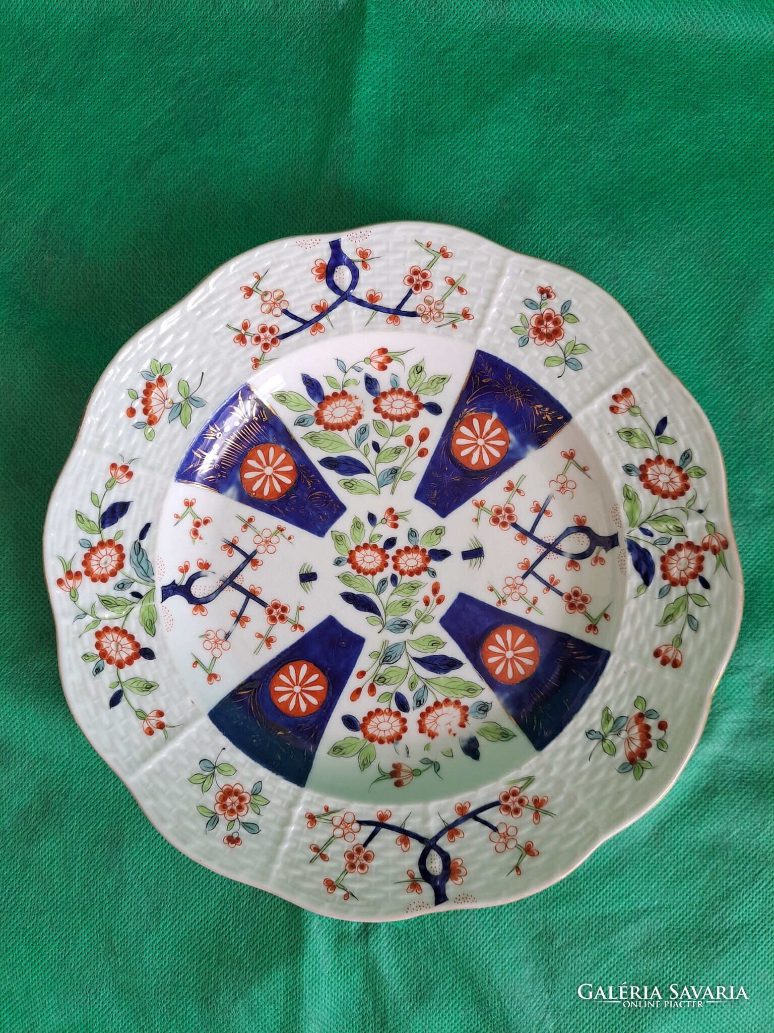 Herendi, Imari mintás tányér. Antik, 1884 és 1896 között készült. Nagyon szép, sok arannyal kézzel festett. Korából adódóan némi kopás van a festésén, fotókon ellenőrizhető, minimális. A csillogás miatti fehér, az nem kopás. Hátulján egy csak a mázra kiterjedő hajszál mázrepedés, a színén nem látható, a porcelánt nem érinti.