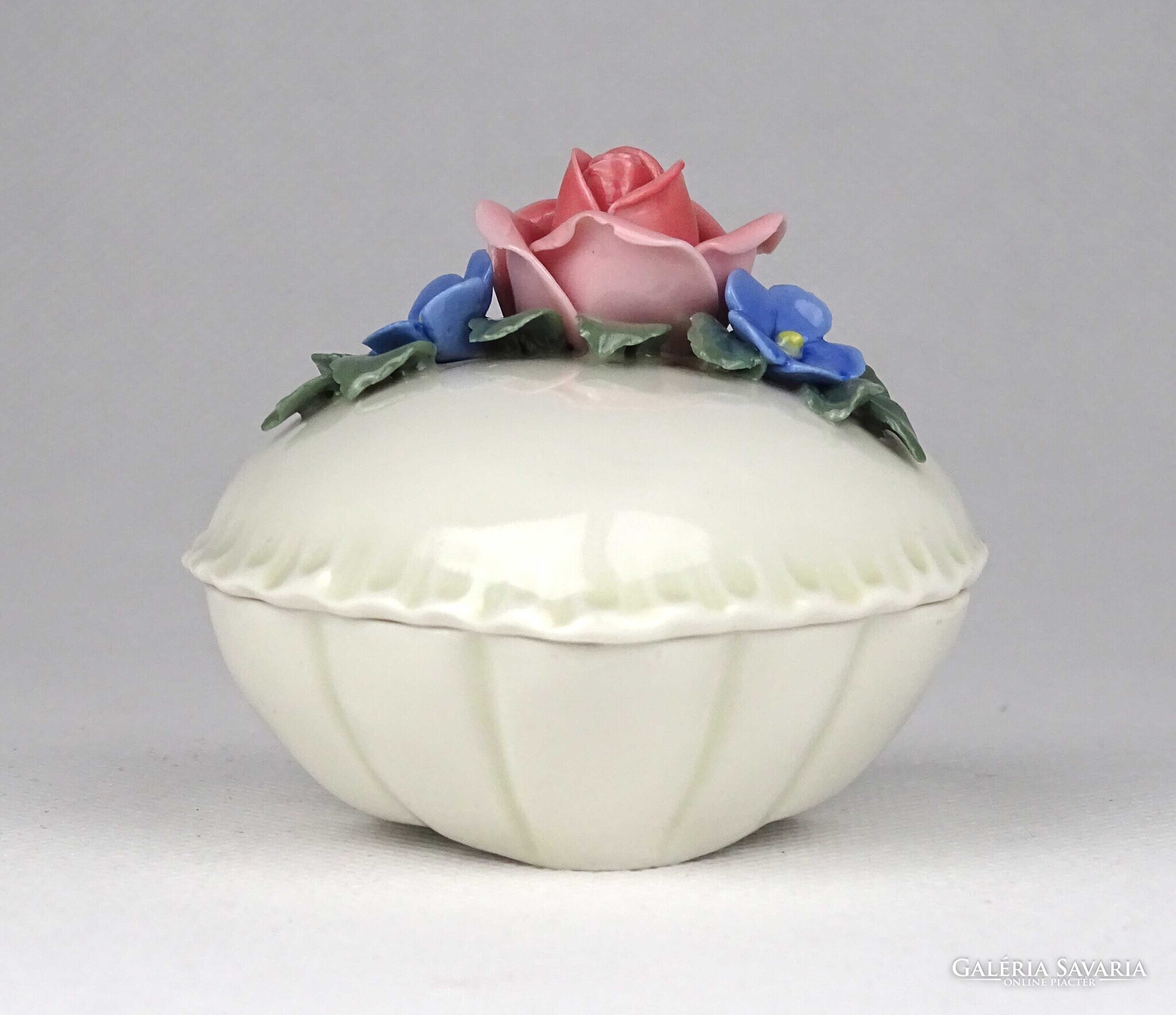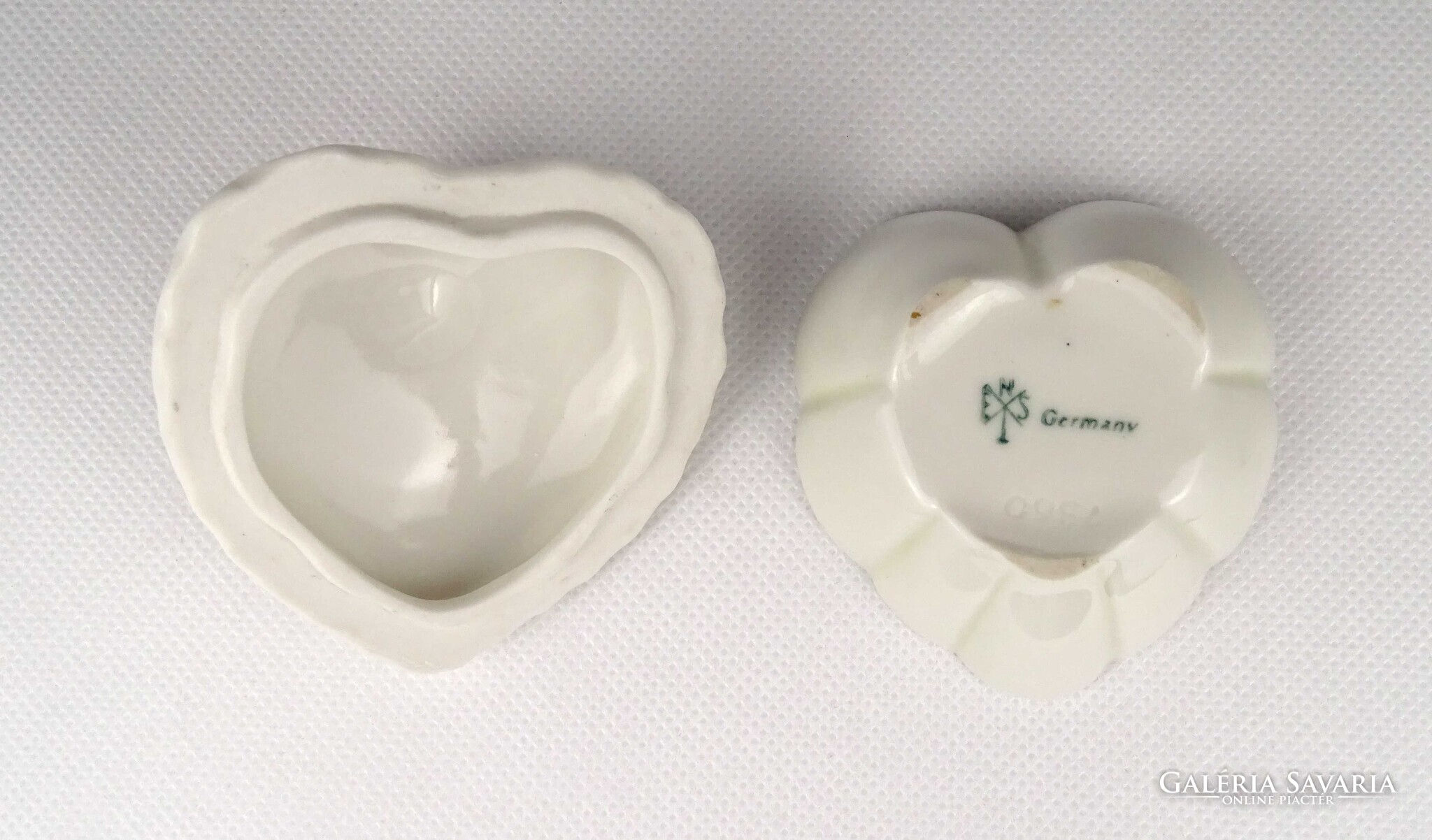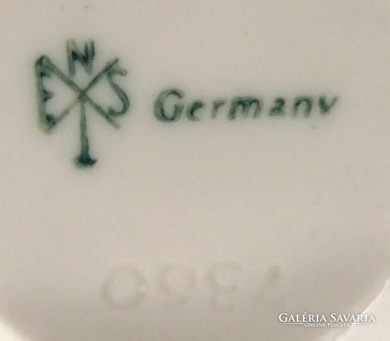 Hibátlan állapotú, barokkos formájú szív alakú, tetején rózsa fogantyús ENS porcelán bonbonier, ékszertartó. A rózsaszirmokon egy-két apró lepattanás található, alig észrevehető. Alján zöld márkajelzés: ENS GERMANY Mélynyomott formaszám: 7360