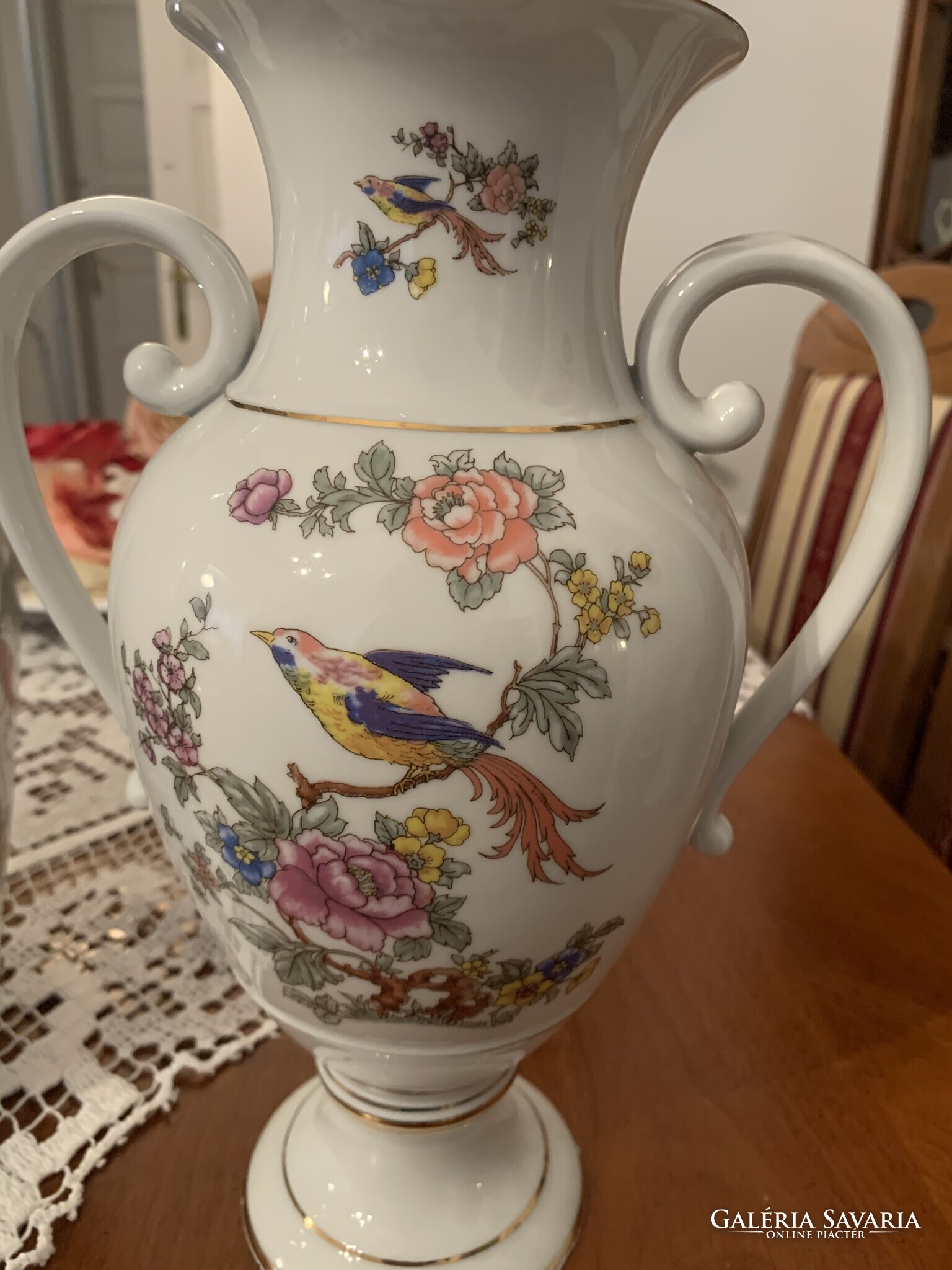 Hollóházi porcelán váza – kézzel festett, aranyozott, madár–virág minta (29 cm)