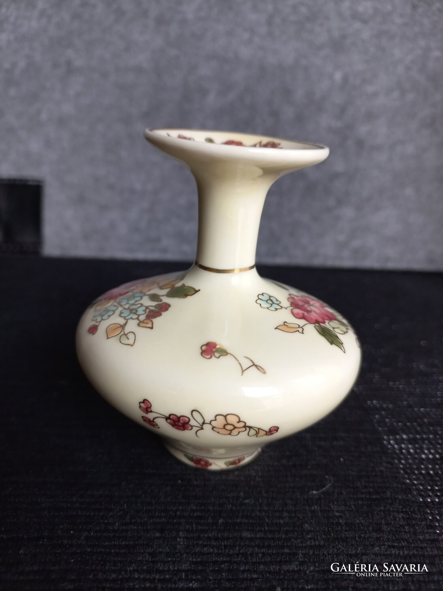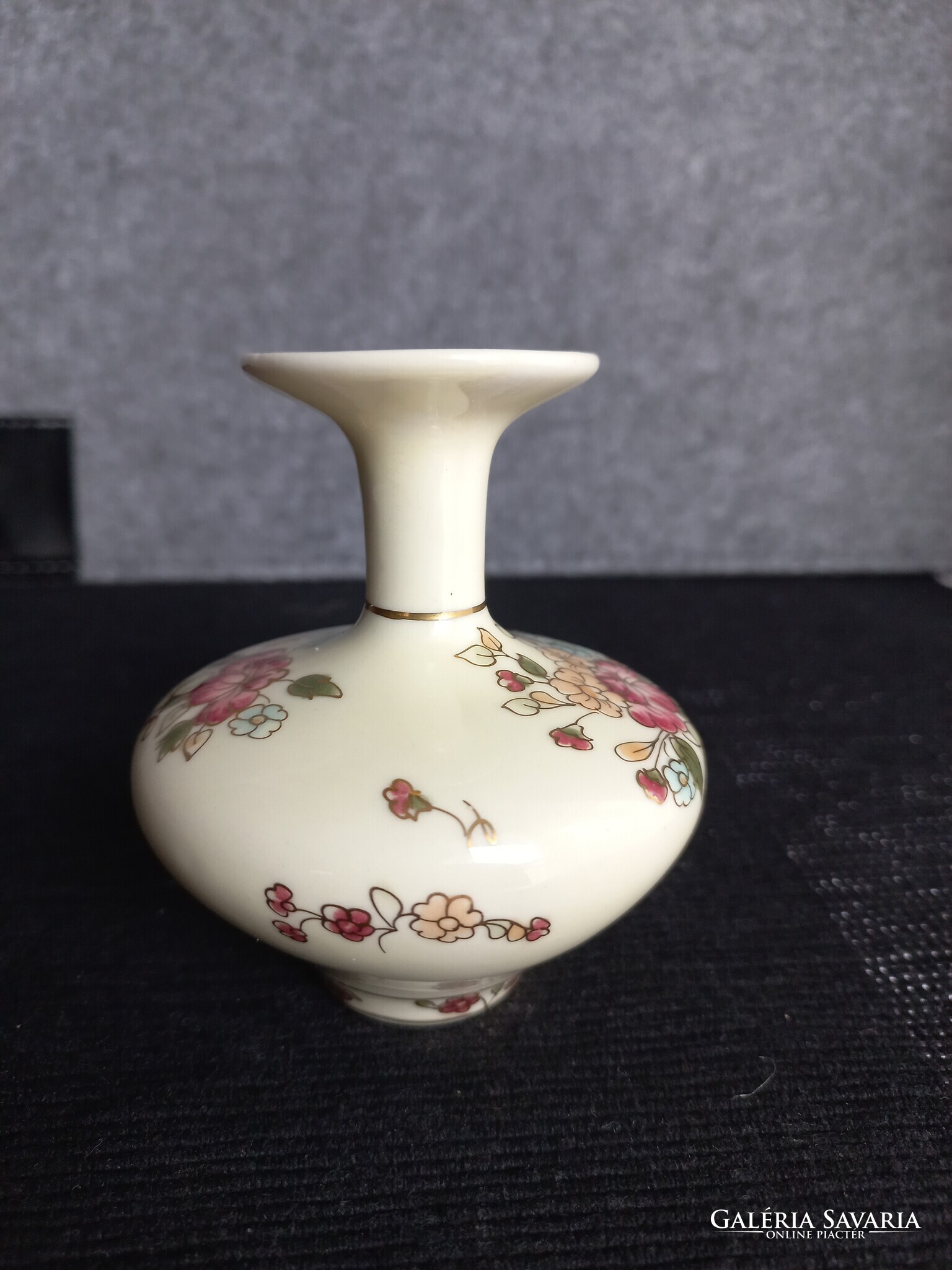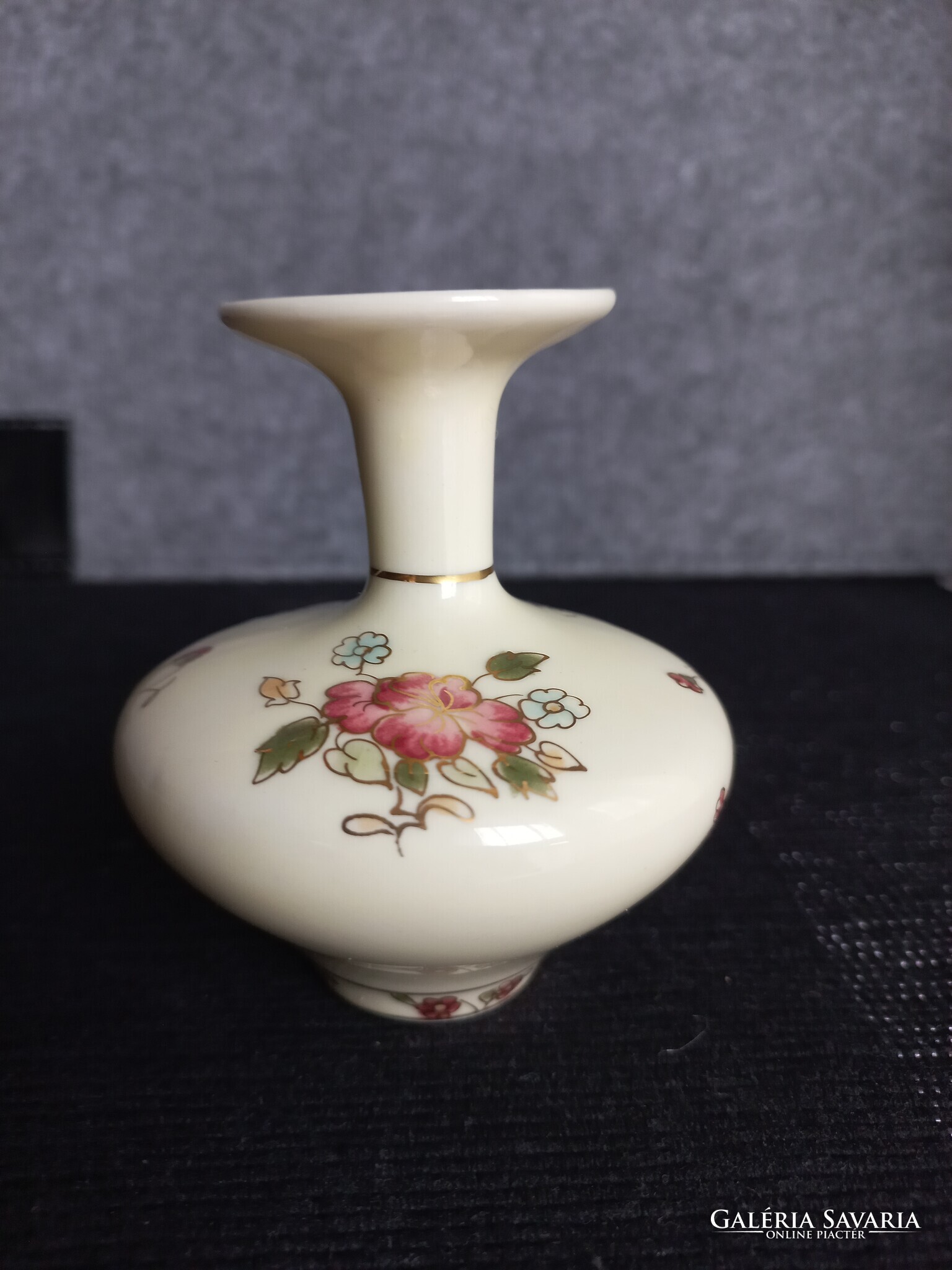 Zsolnay porcelán kis váza, vajszínű, aranyozott virágcsokros dekorációval