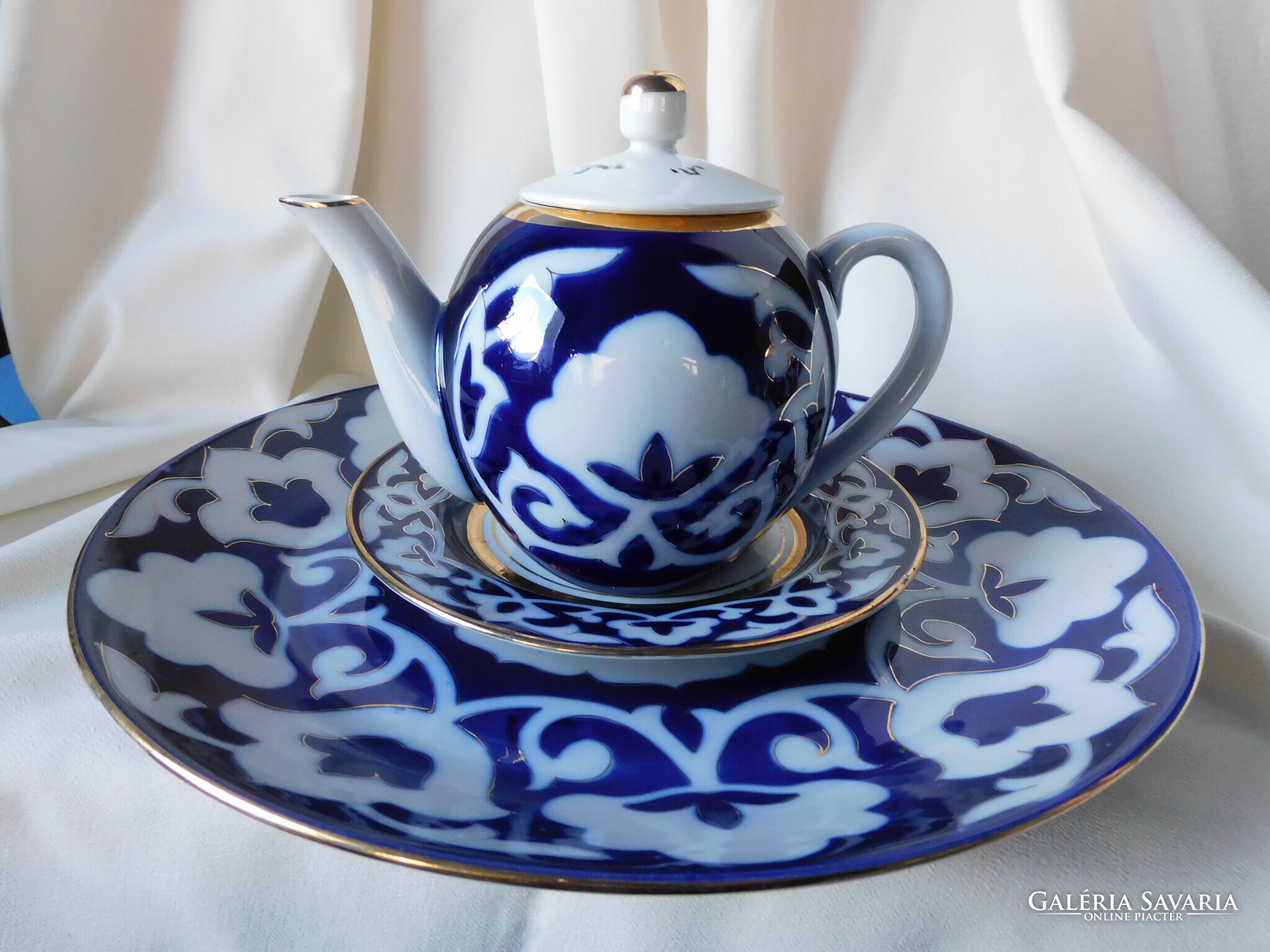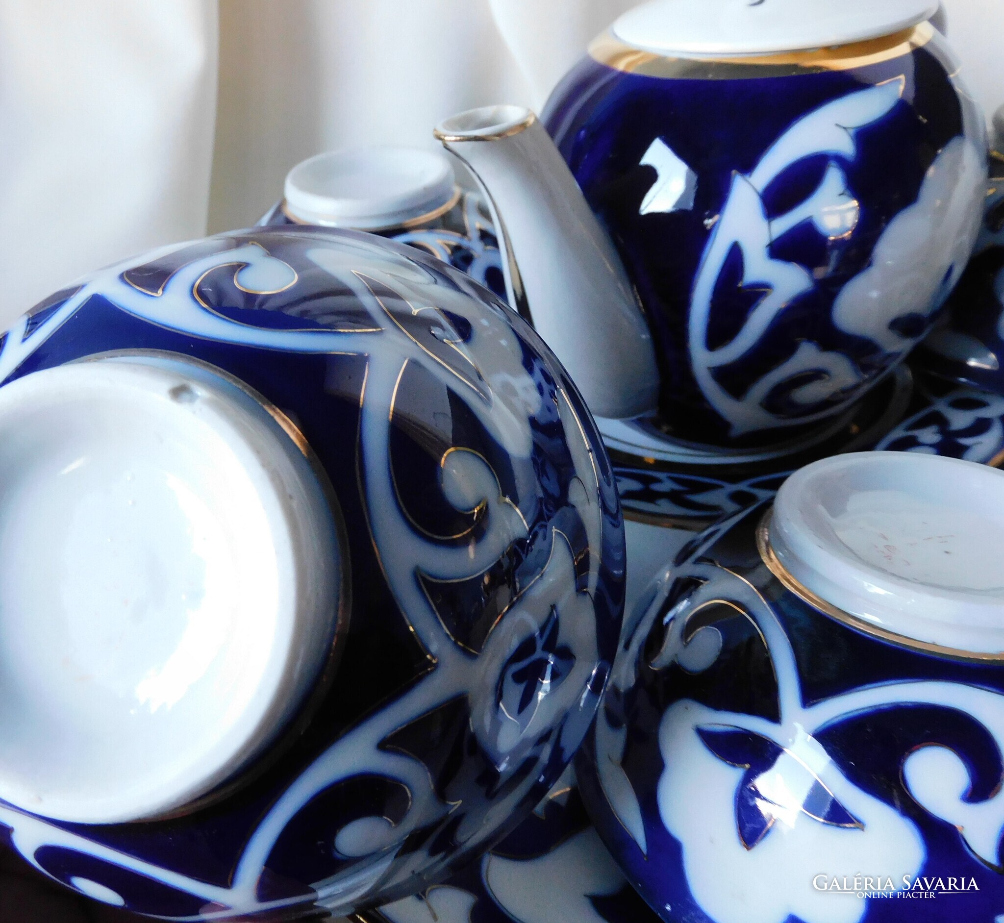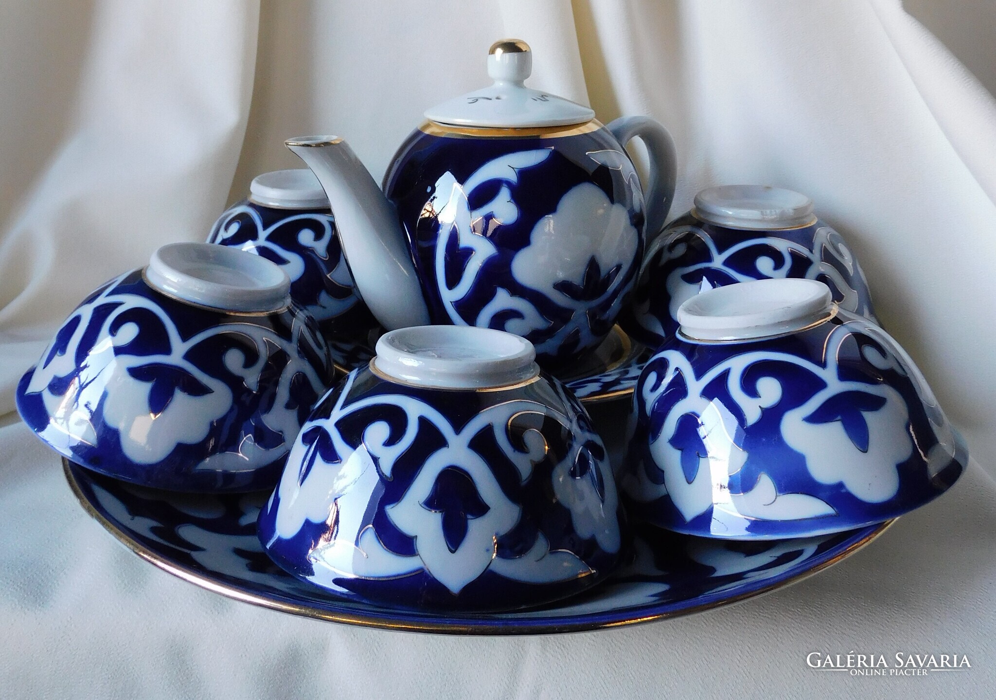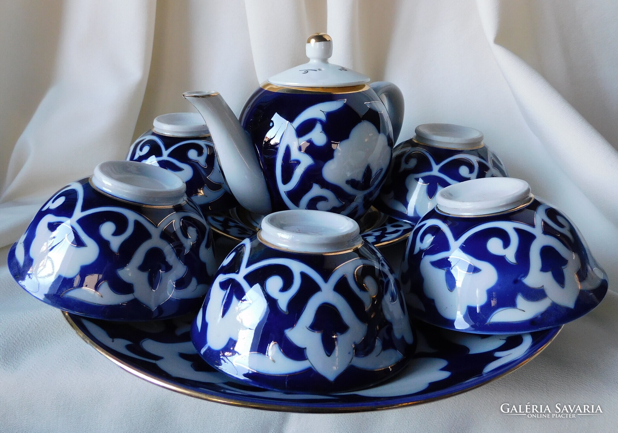 Üzbég teáskészlet a szovjet időkből. Tartalma: kanna (magassága 12.5 cm). 5 darab teás tálka (magasságuk 5.5 cm, átmérőjük 11 cm), tányér (17.8 cm) és tálca (30 cm). Nagyon szép állapotúak. Két tálka talpánál látok gyártási anyaghibát - az utolsó két fotó szerint..