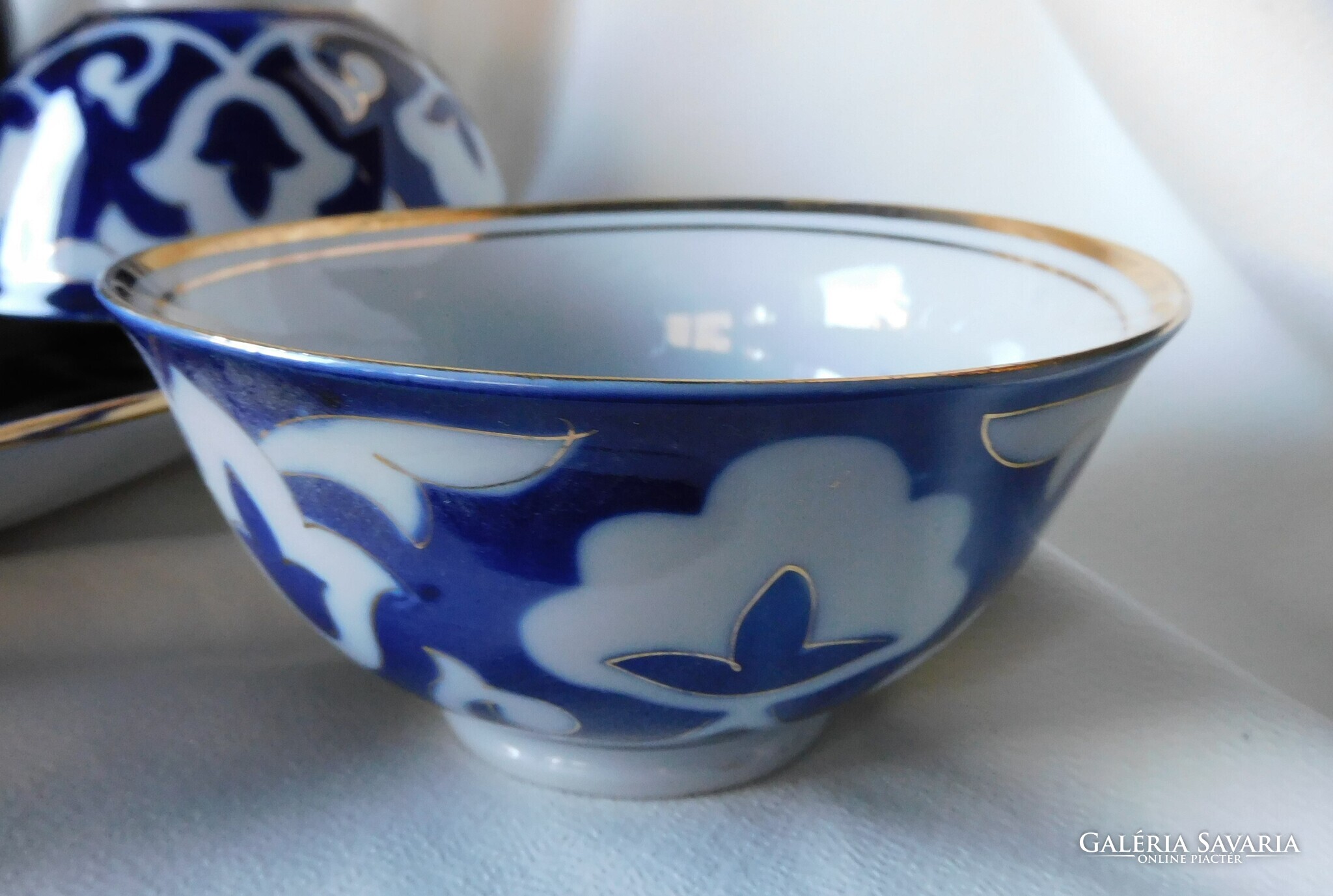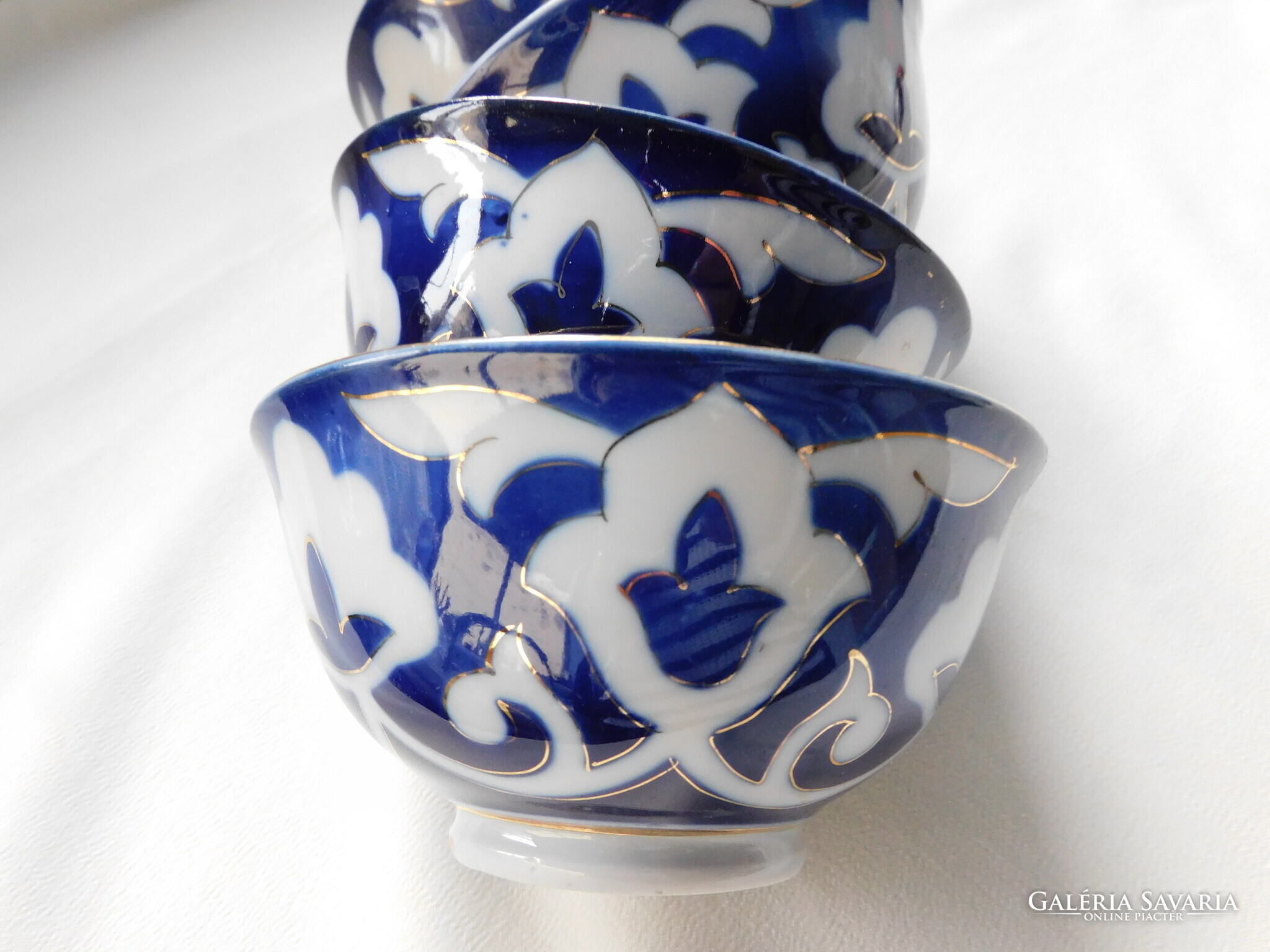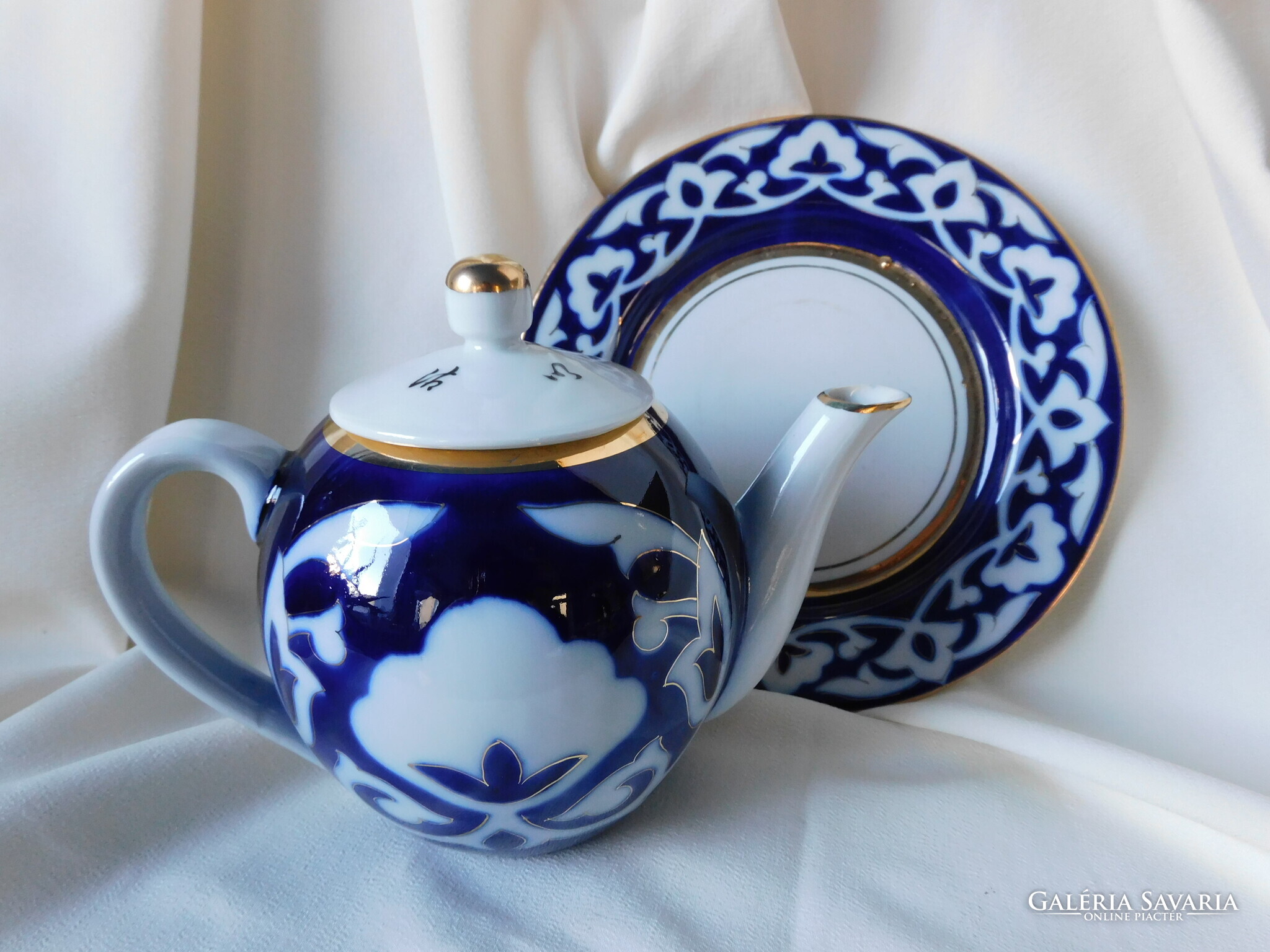 Üzbég teáskészlet a szovjet időkből. Tartalma: kanna (magassága 12.5 cm). 5 darab teás tálka (magasságuk 5.5 cm, átmérőjük 11 cm), tányér (17.8 cm) és tálca (30 cm). Nagyon szép állapotúak. Két tálka talpánál látok gyártási anyaghibát - az utolsó két fotó szerint..