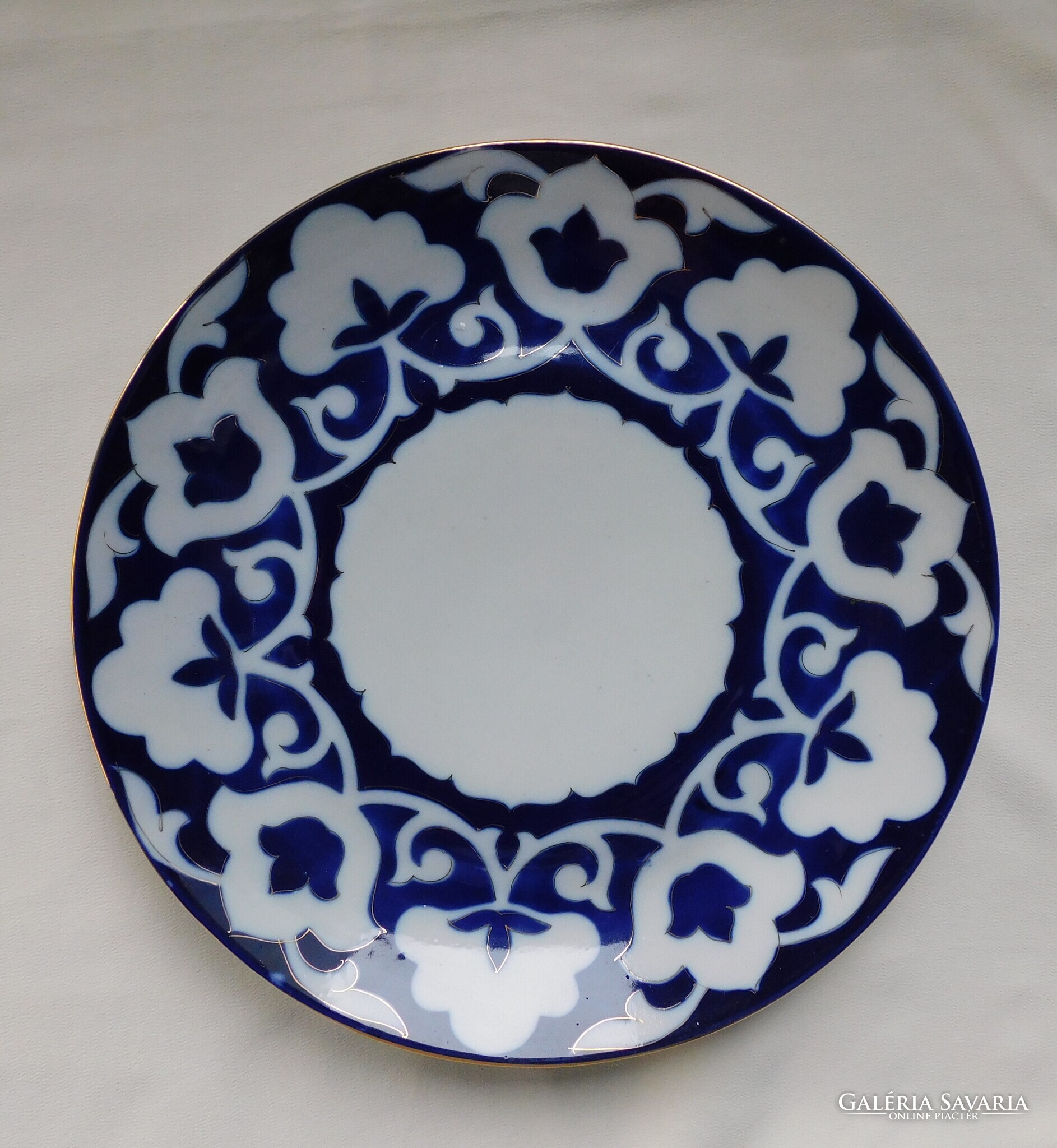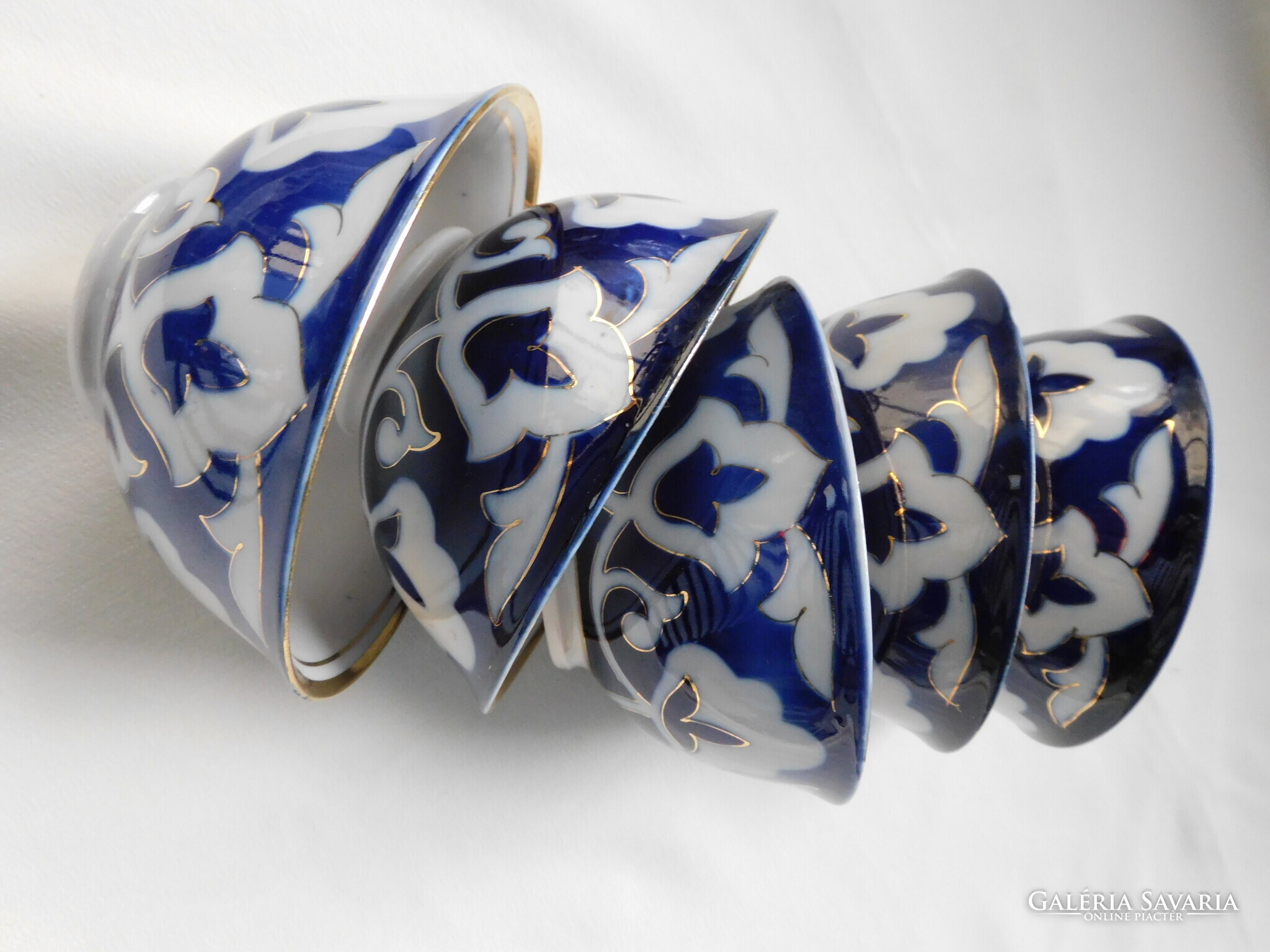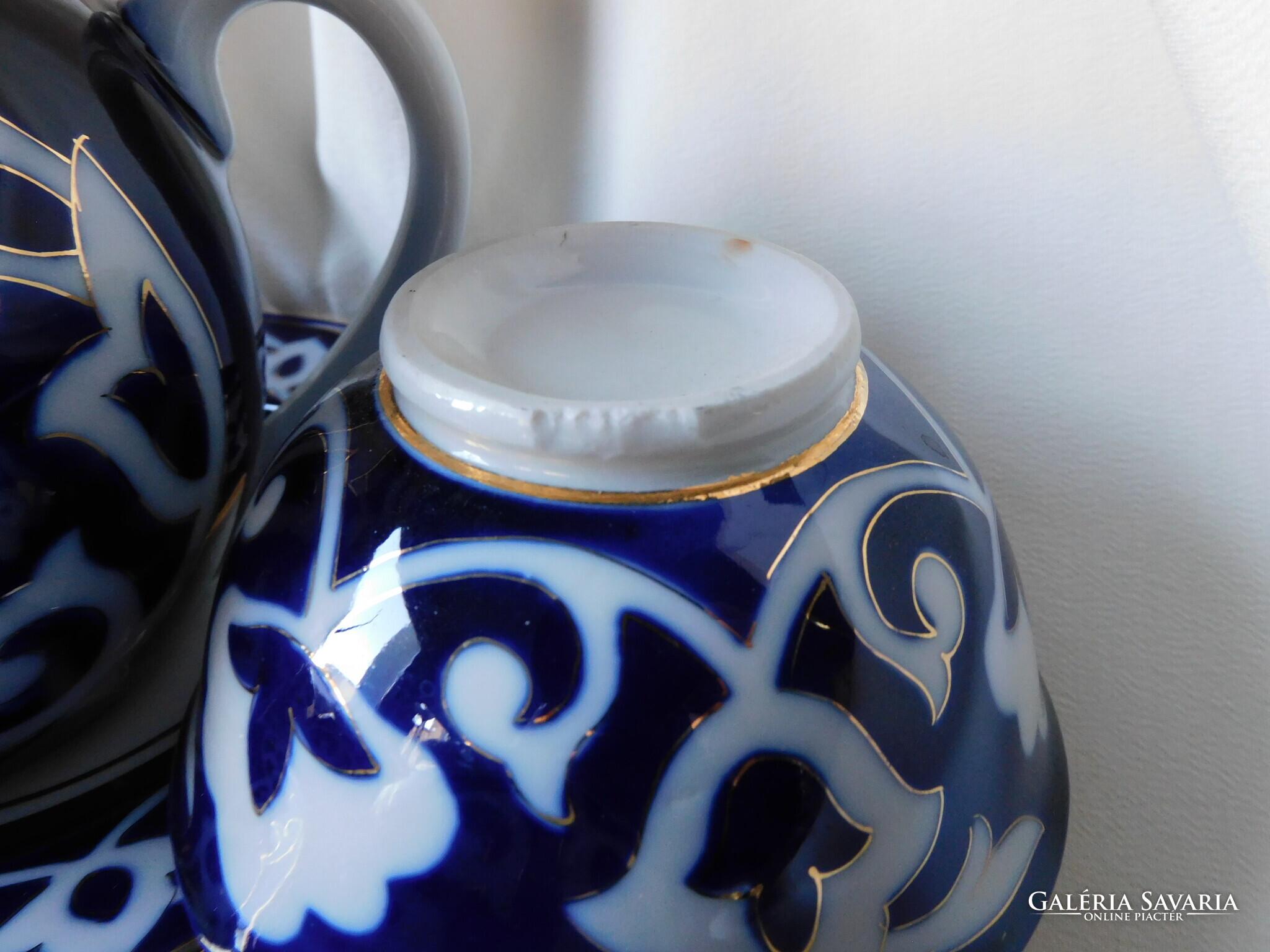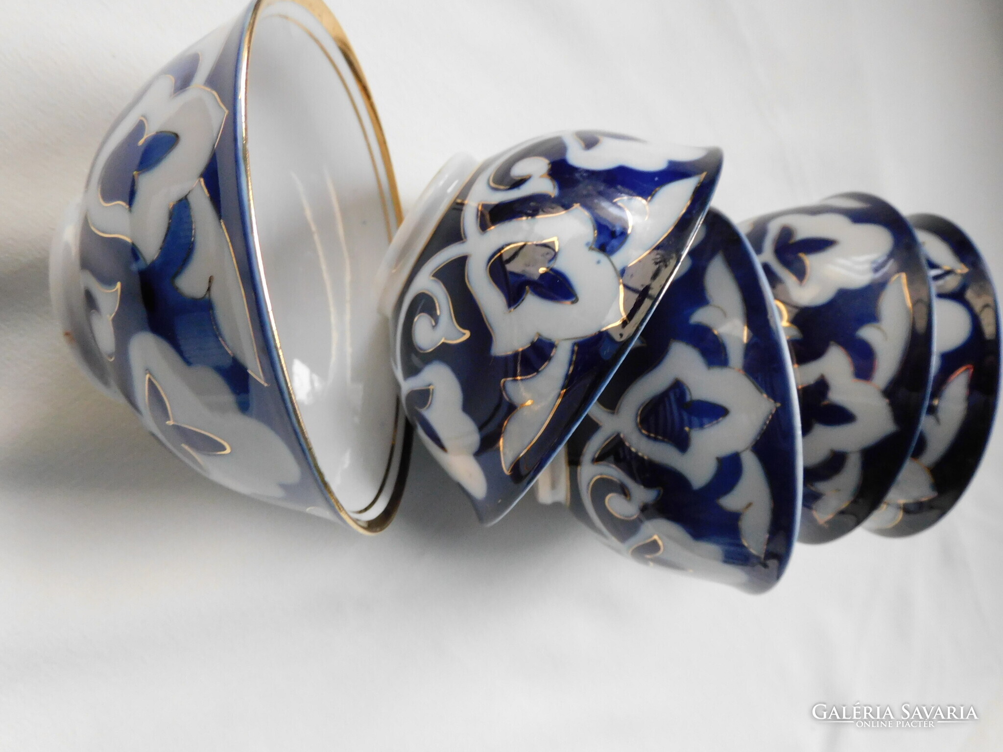 Üzbég teáskészlet a szovjet időkből. Tartalma: kanna (magassága 12.5 cm). 5 darab teás tálka (magasságuk 5.5 cm, átmérőjük 11 cm), tányér (17.8 cm) és tálca (30 cm). Nagyon szép állapotúak. Két tálka talpánál látok gyártási anyaghibát - az utolsó két fotó szerint..