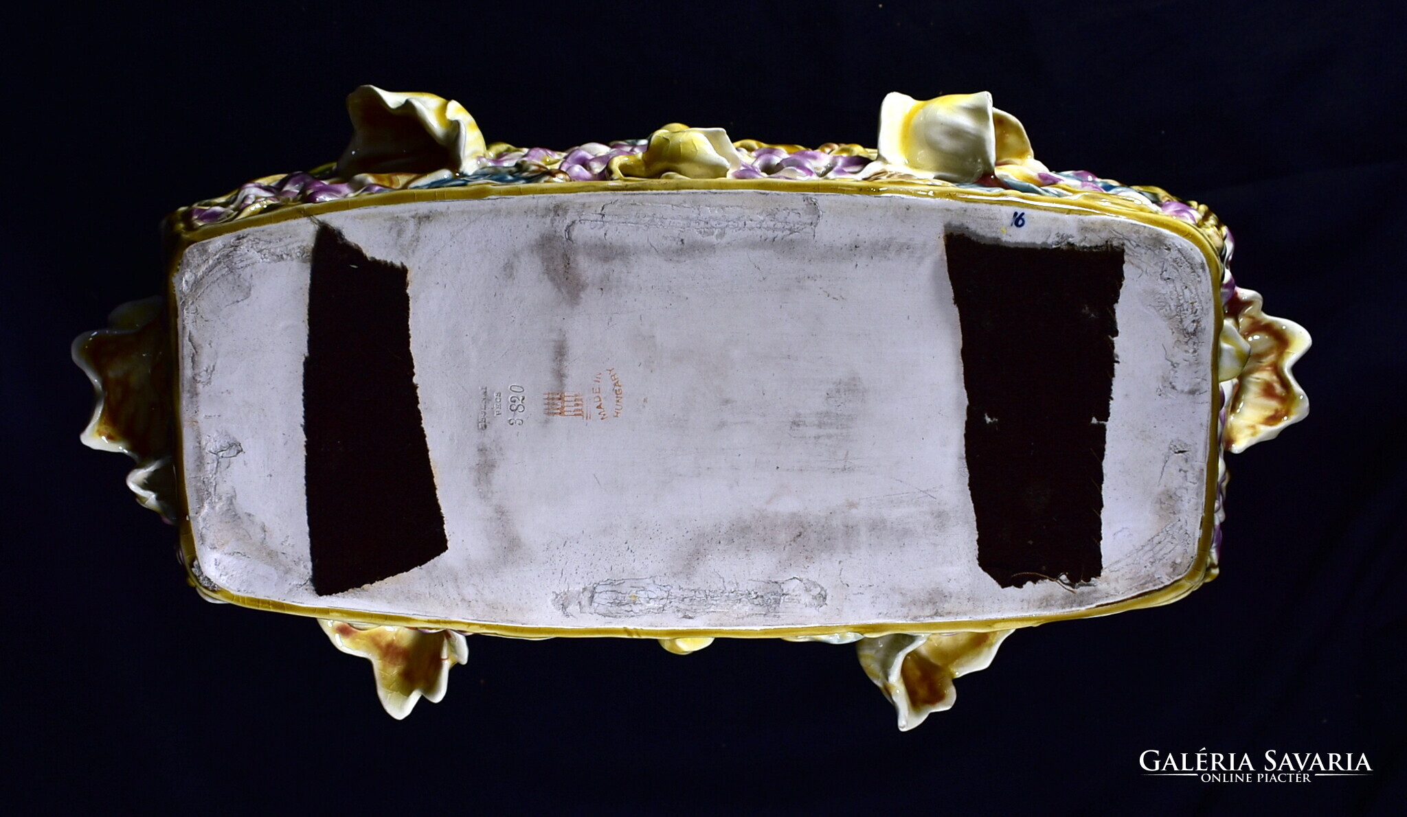 Festett mázas Zsolnay áttört mintás jardiniere - dísz kaspó . masszába nyomott Zsolnay Pécs és 3820 formaszámmal , valamint máz felett pirossal bélyegzett öttorony ! Ritka nagy méretű darab . Belül némi mázkopás , enyhe felületi kopás , de töréstől és rpedéstől mentes darab , korából adódó mázmozaikosodások előfordulnak ! M.: 19 x 39 x 17 cm