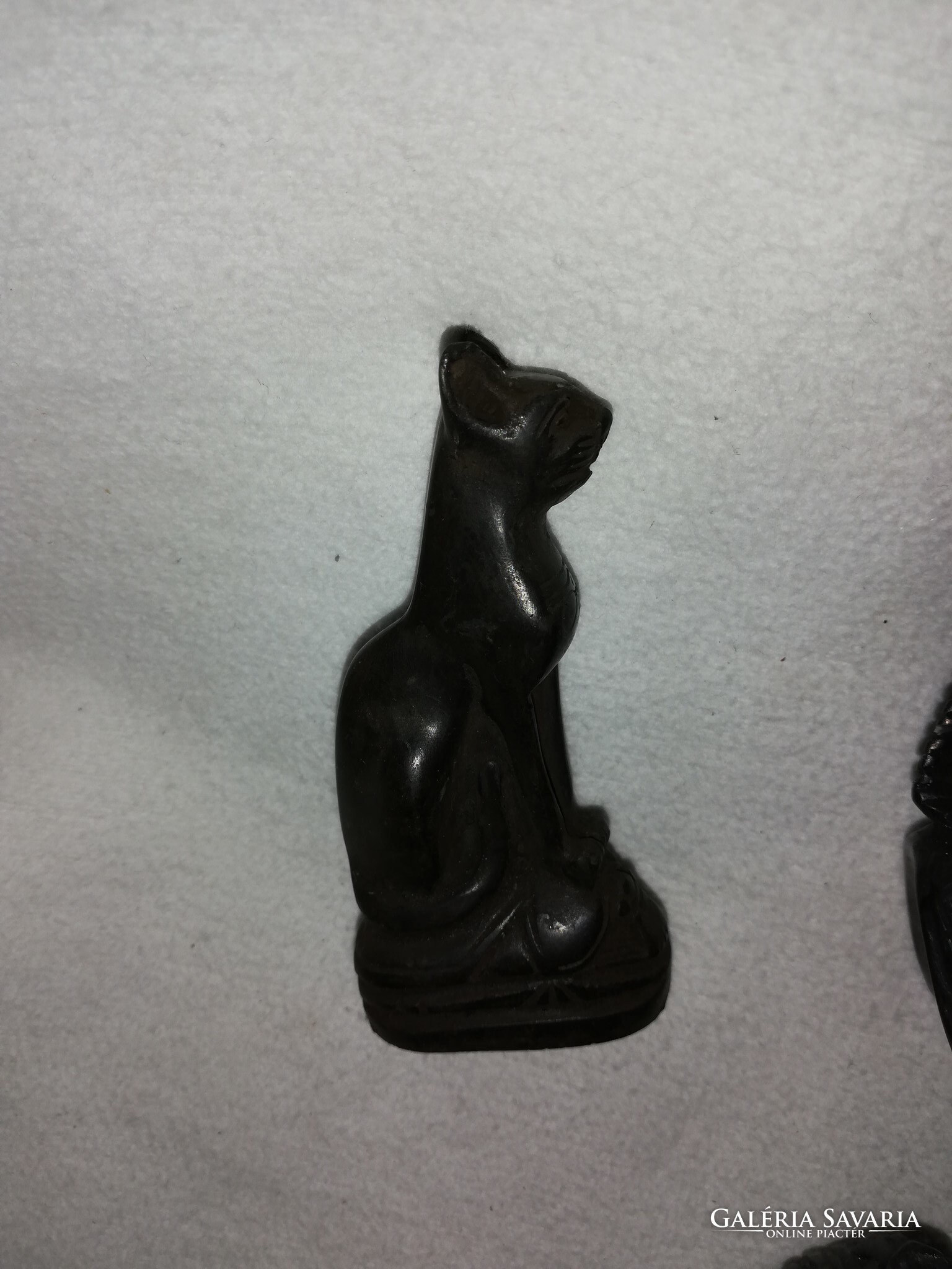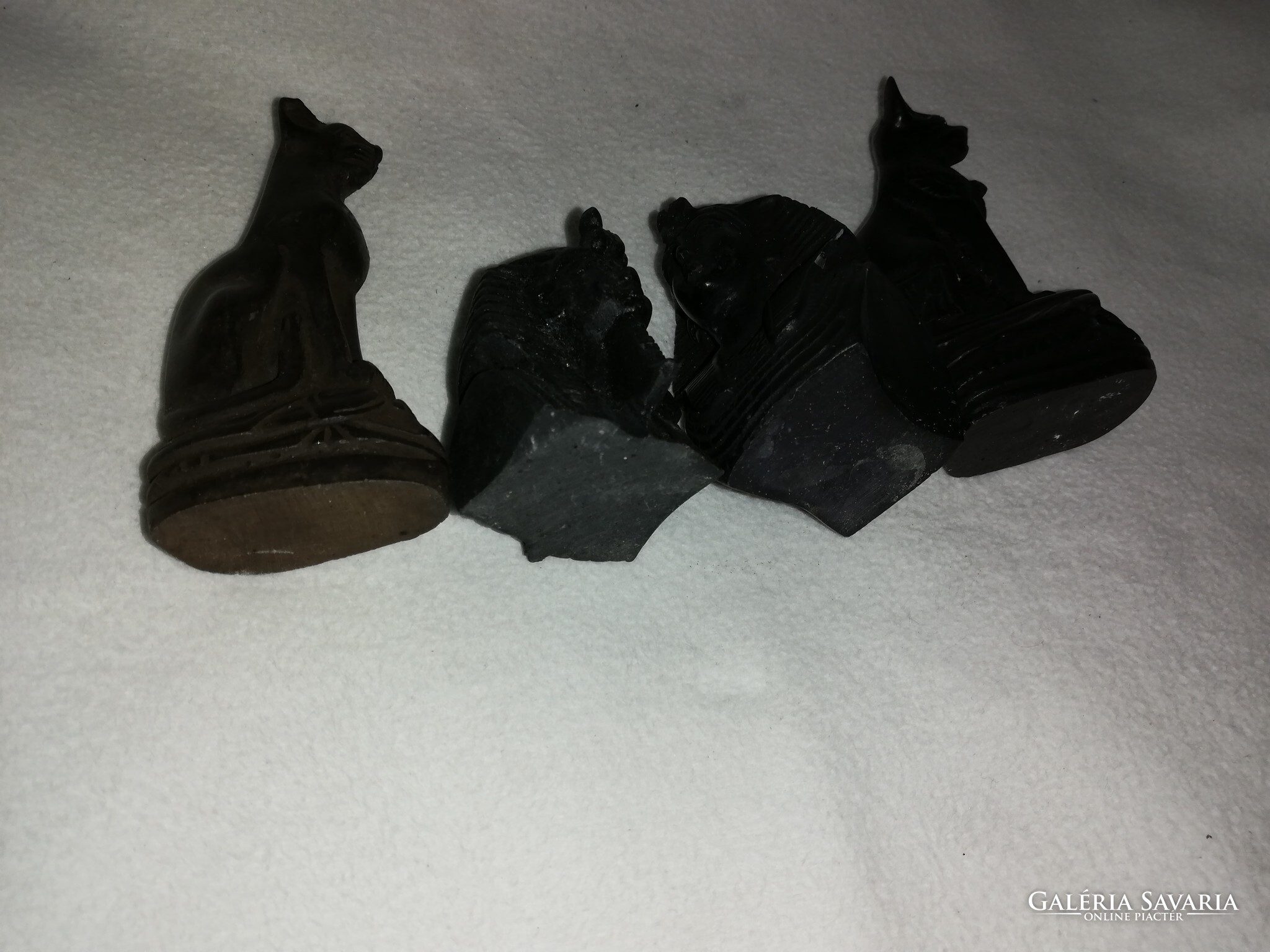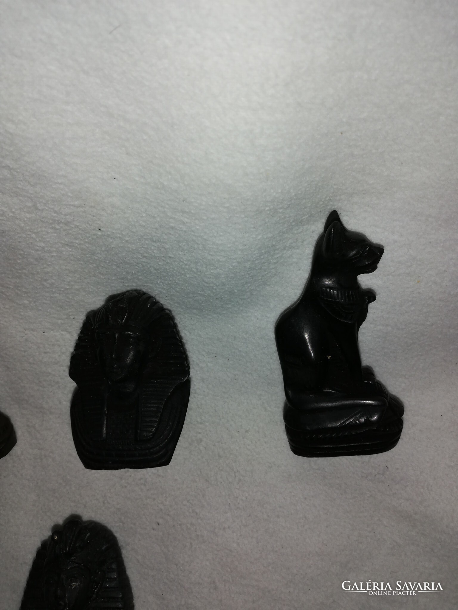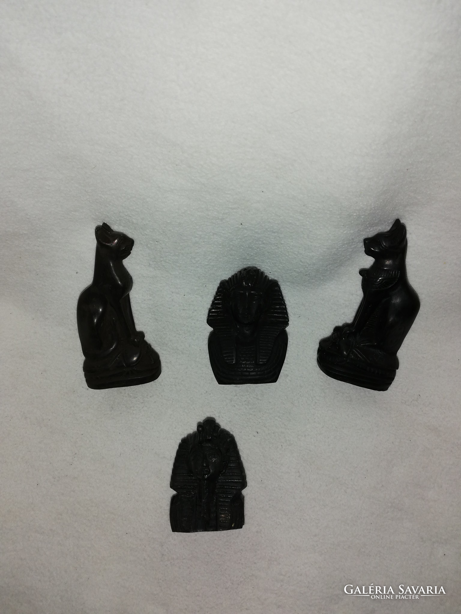 Egyiptomi dísztárgyak. Tutanhamom fáraó, és egyiptomi macskák poliakrilból. Magasságuk: 6 cm, a macskáké 10 cm. Az ár a 4 db-a vonatkozik.