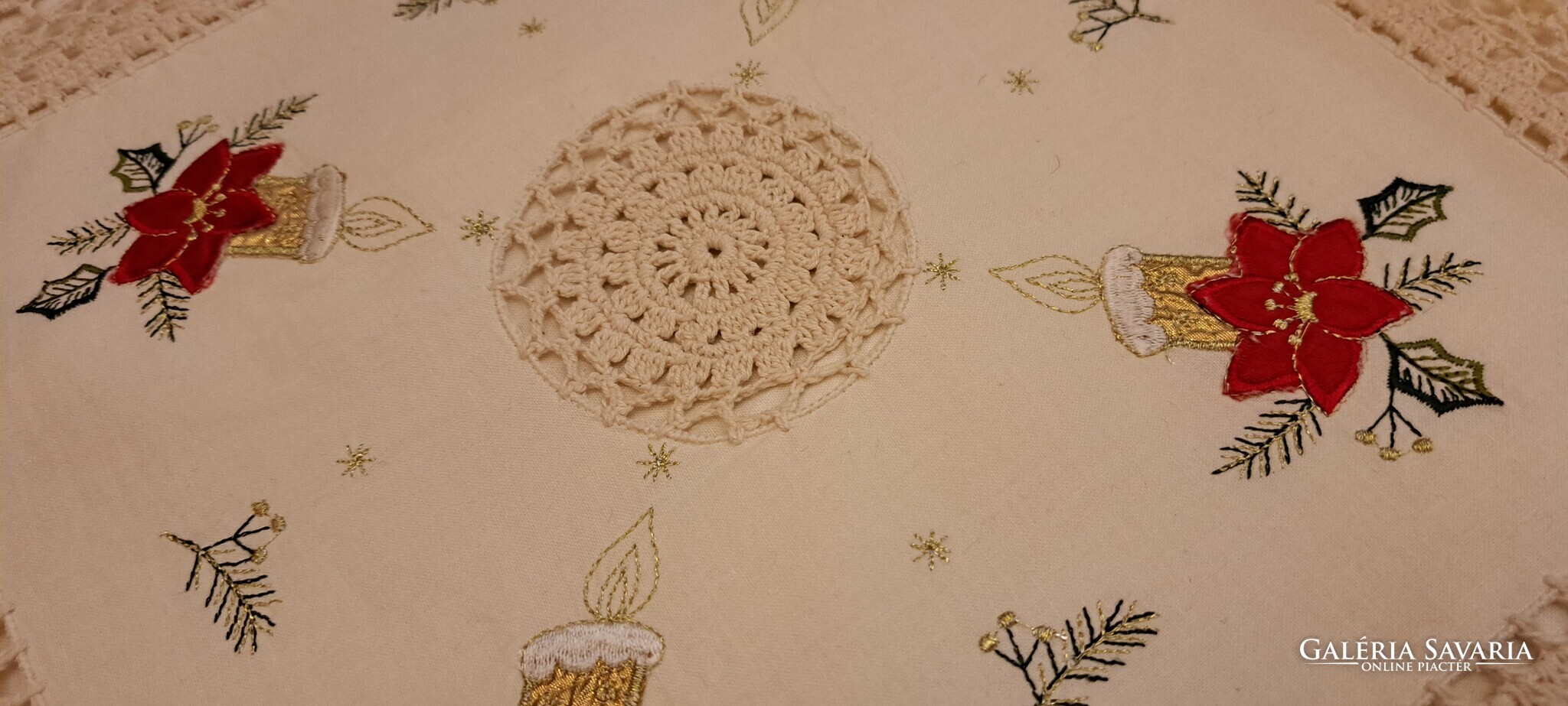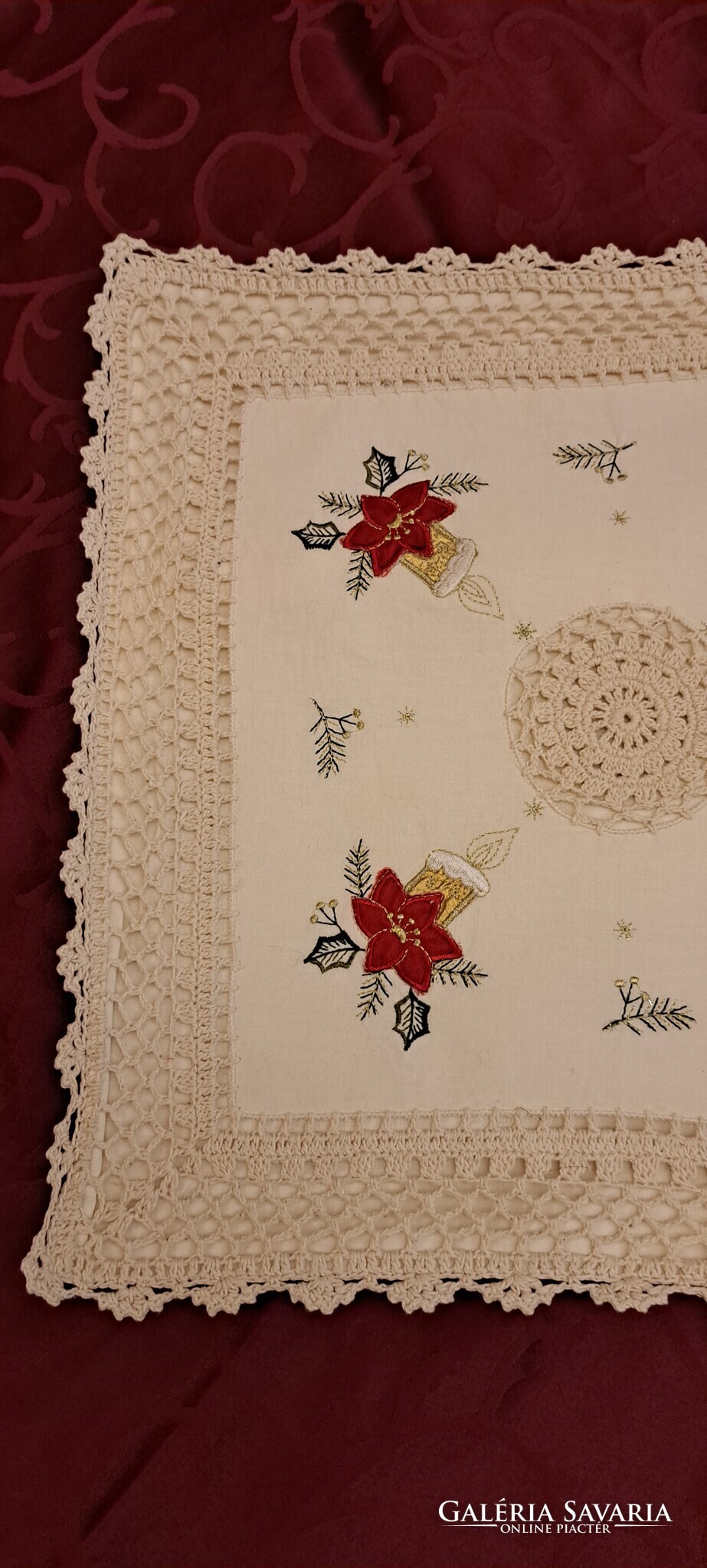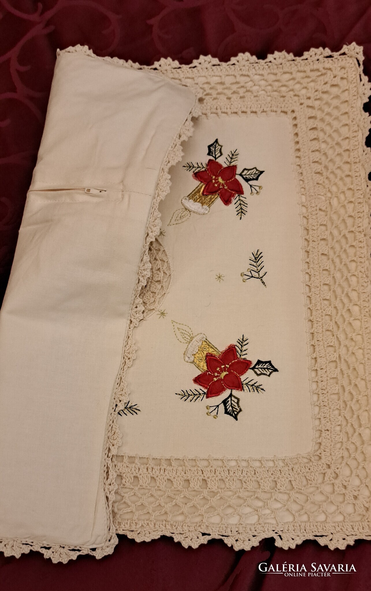 Ekrü színű négy sarkában Mikulásvirágos-gyertyás hímzésű, közepén horgolt mintás párnahuzat. A szélén széles horgolr sáv fut körbe. Cipzárja jó. Szép, megkímélt állapotú párnahuzat.