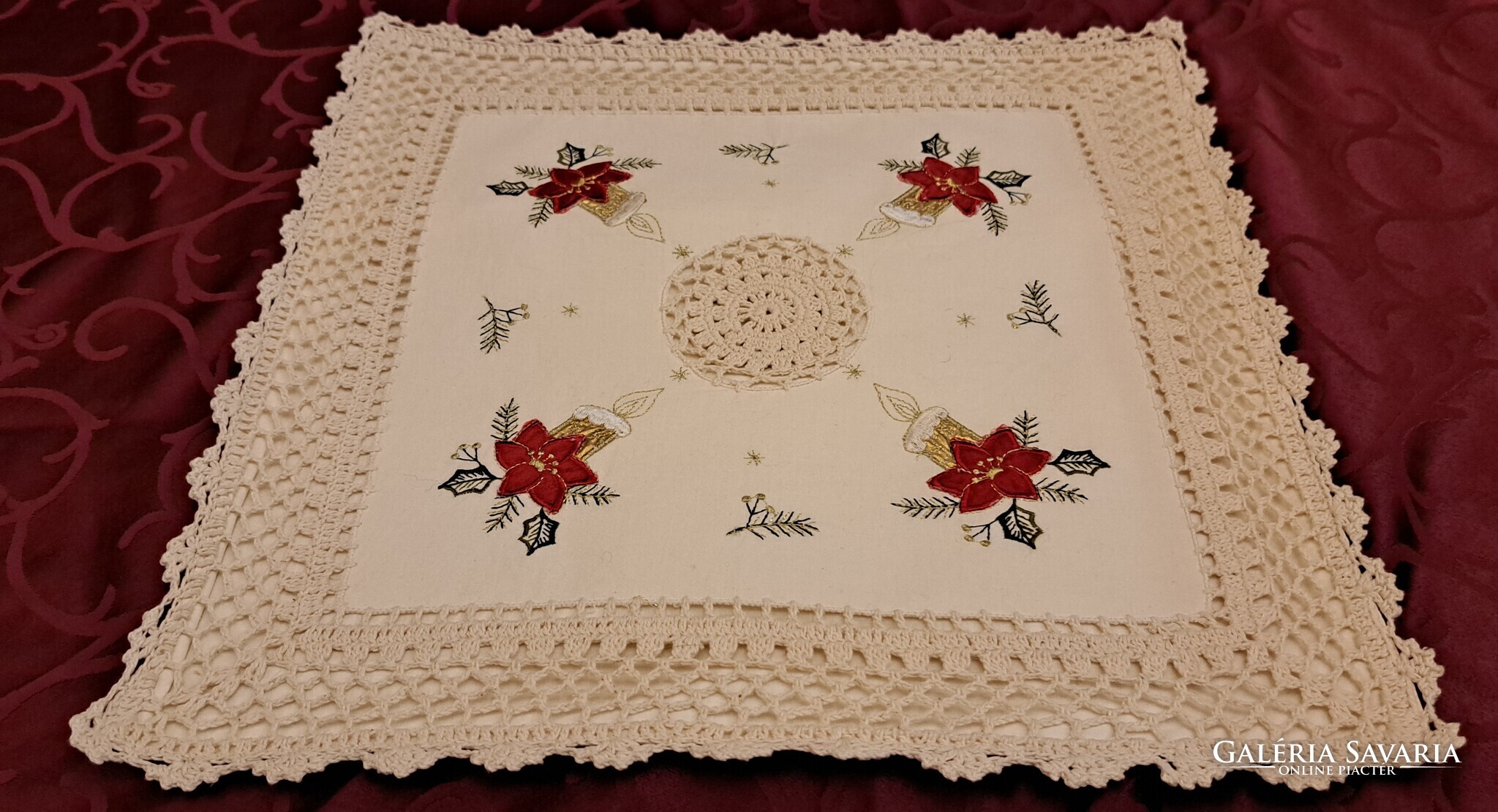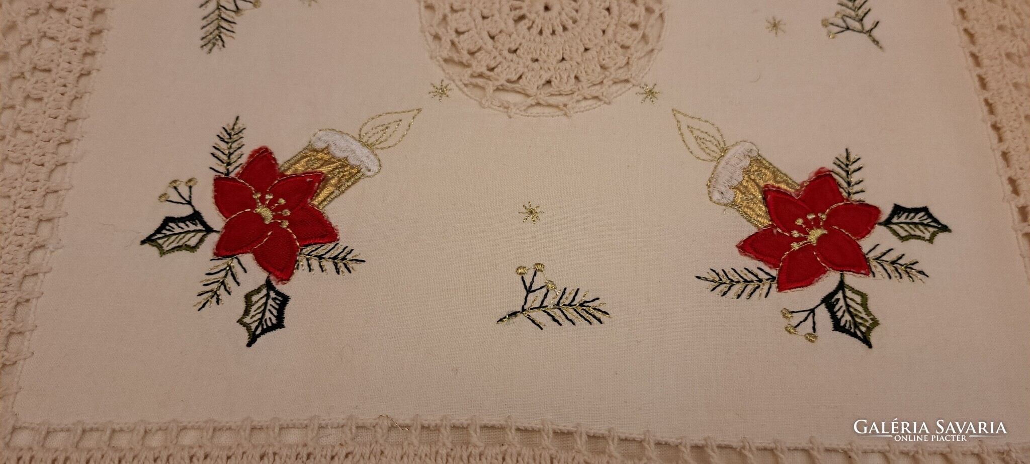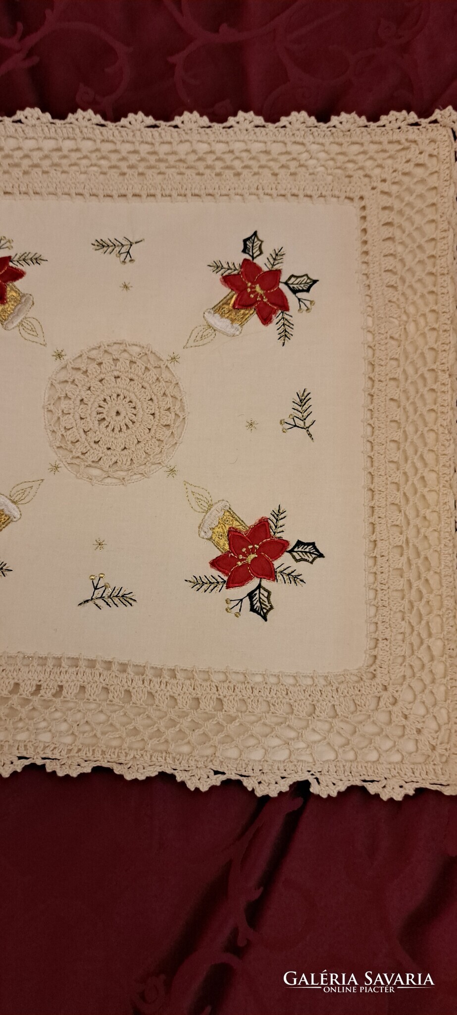 Ekrü színű négy sarkában Mikulásvirágos-gyertyás hímzésű, közepén horgolt mintás párnahuzat. A szélén széles horgolr sáv fut körbe. Cipzárja jó. Szép, megkímélt állapotú párnahuzat.