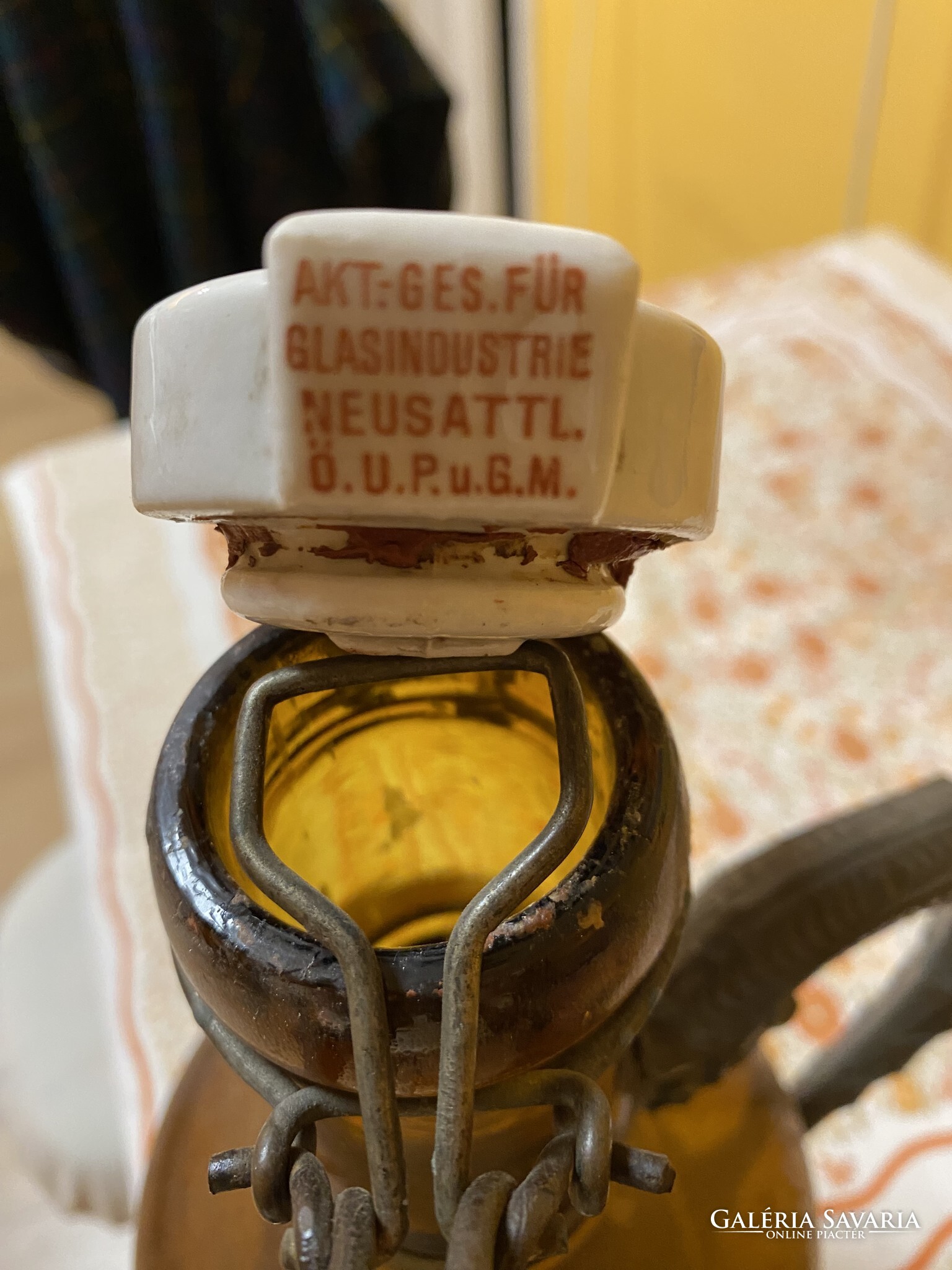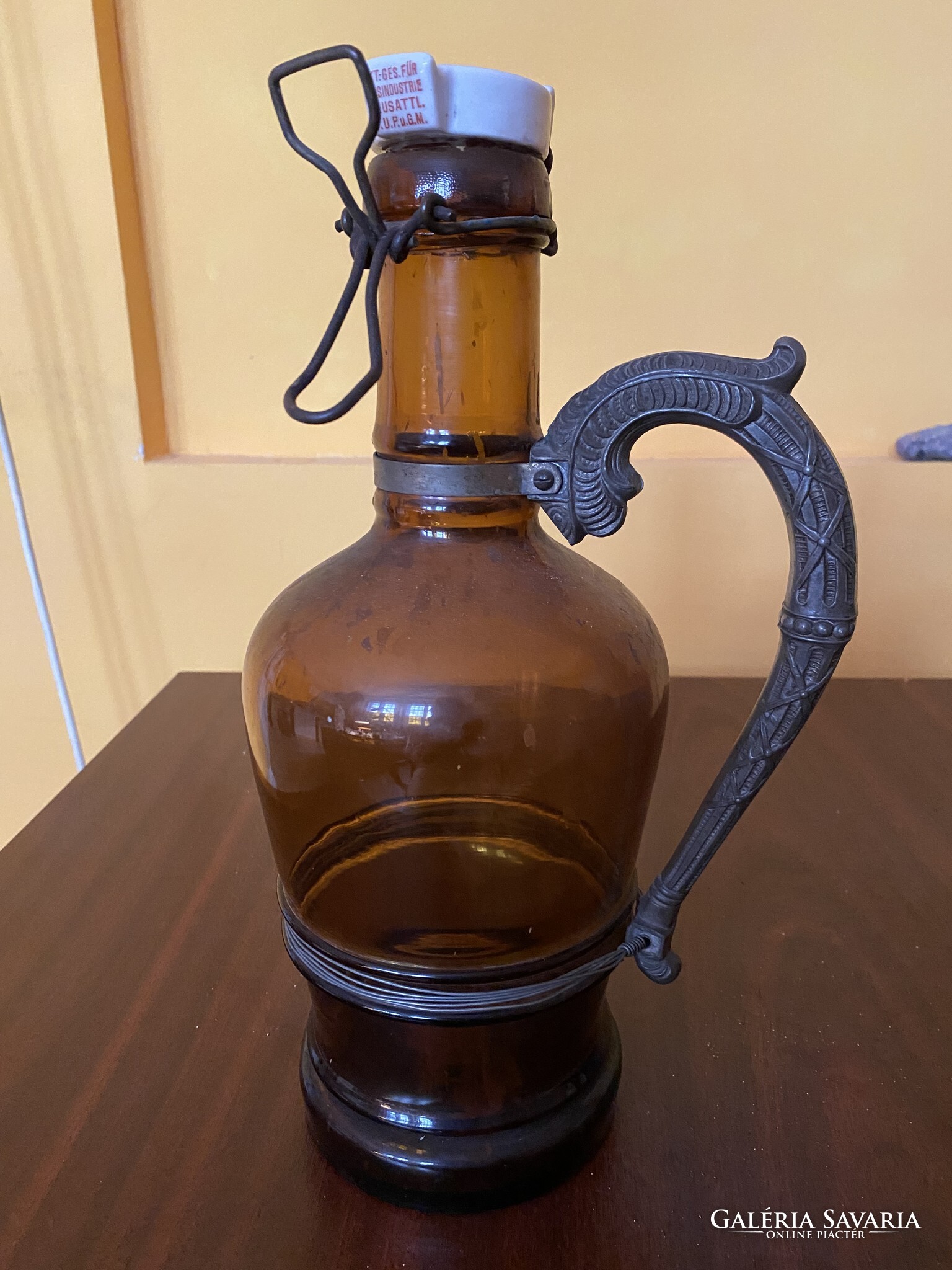 Monarchia területéről való ónfülű söröskancsó, díszítéssel, sárga színű üvegből. A gumi elöregedett. Az alsó pánt dróttal pótolva.