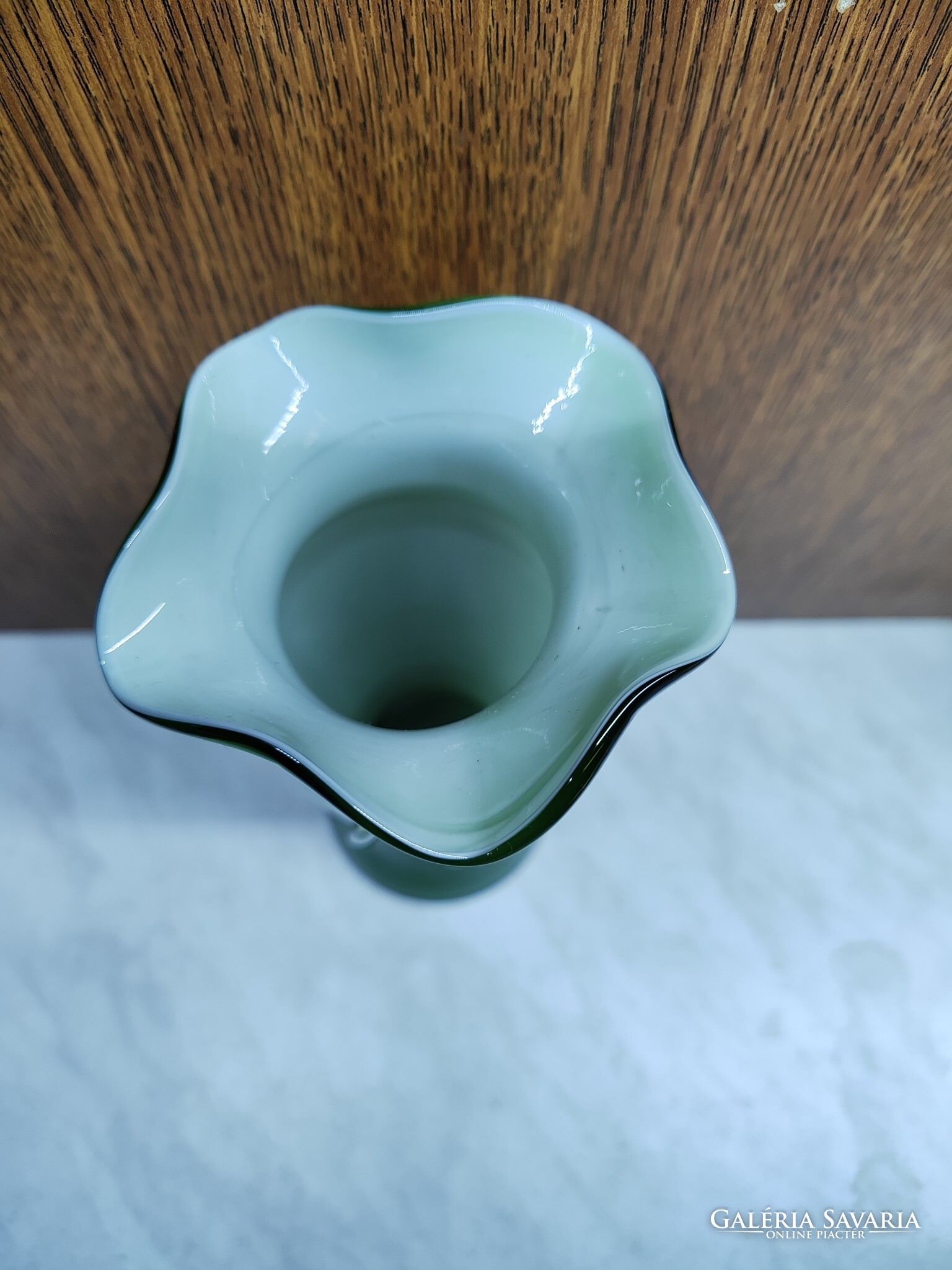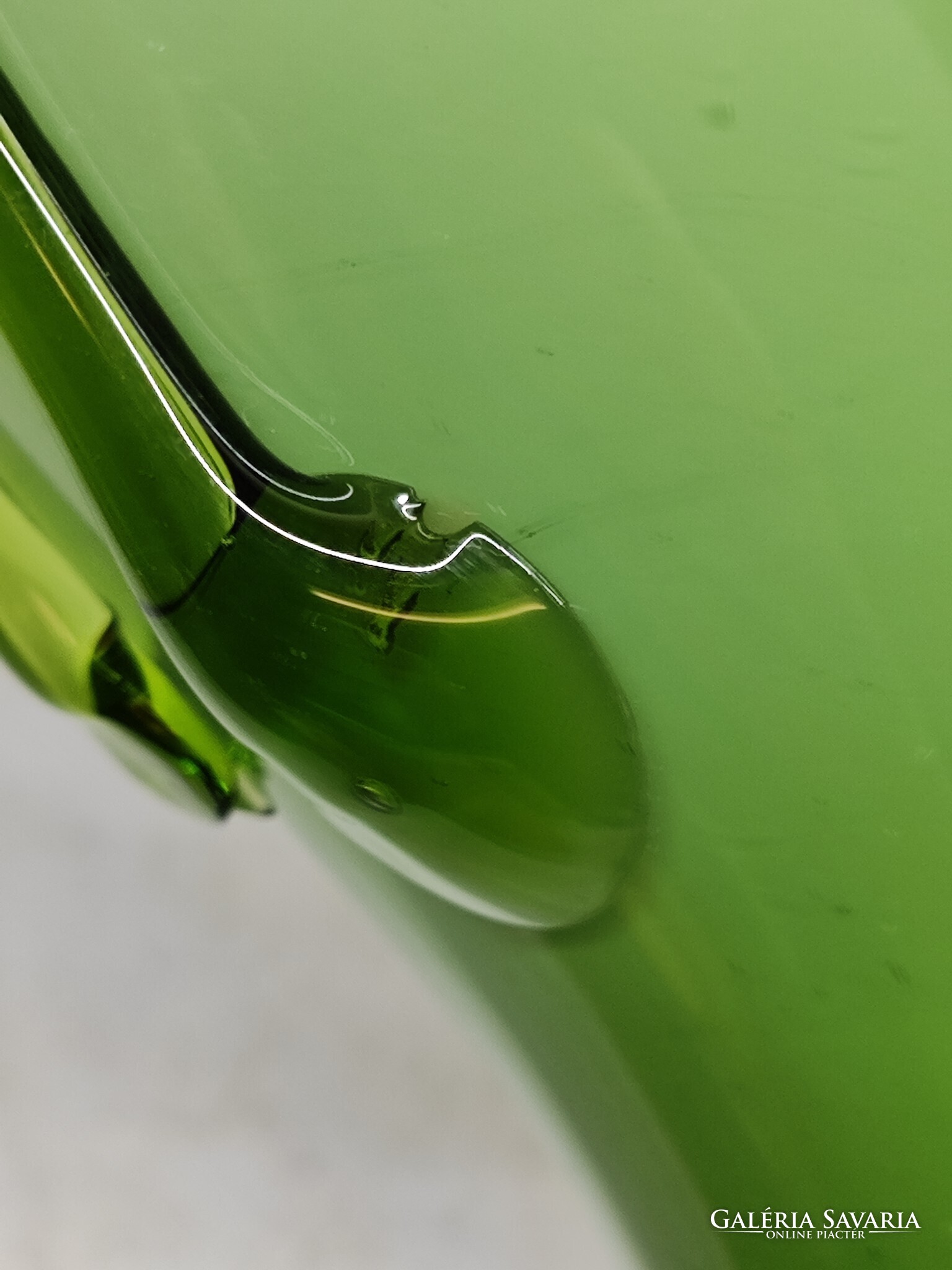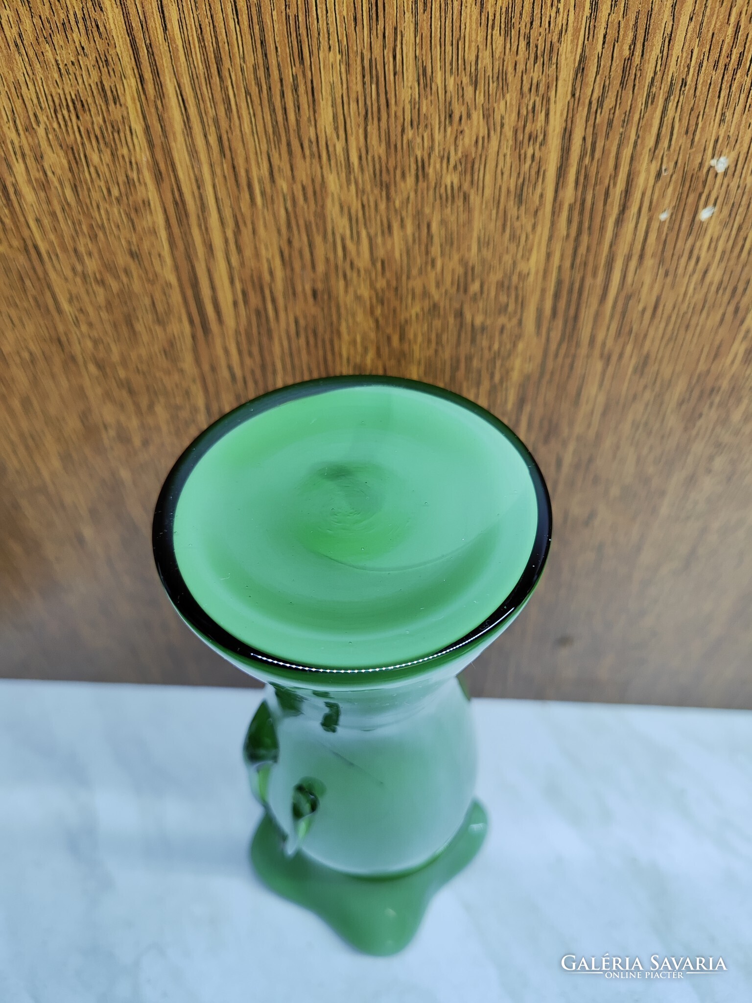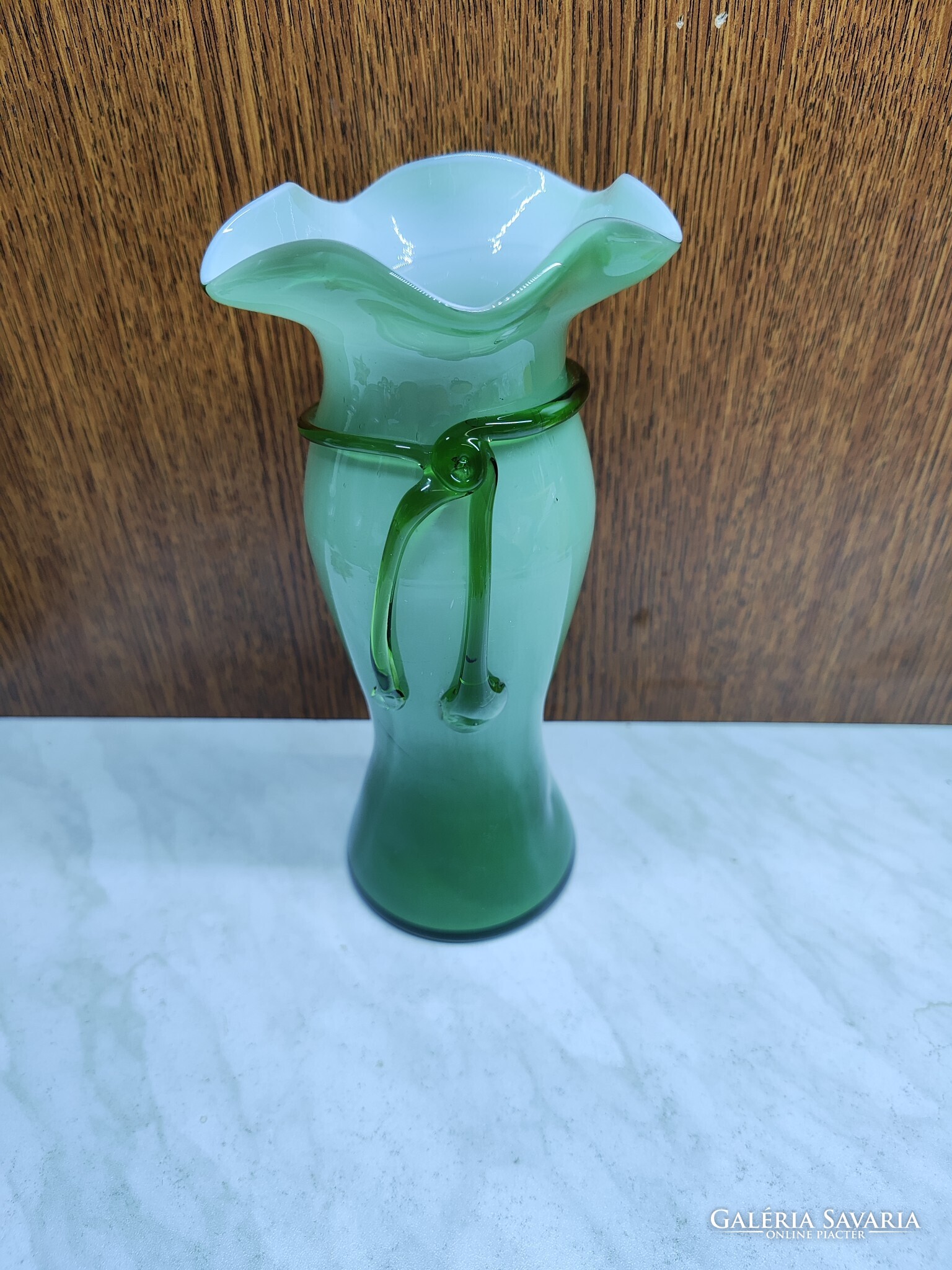 Fodros szájú üveg váza, rajta masnival. Sérülés mentes, anyagában baloldalt egy plusz szín foszlány látható, és jobb oldalt egy buborék nyomai.