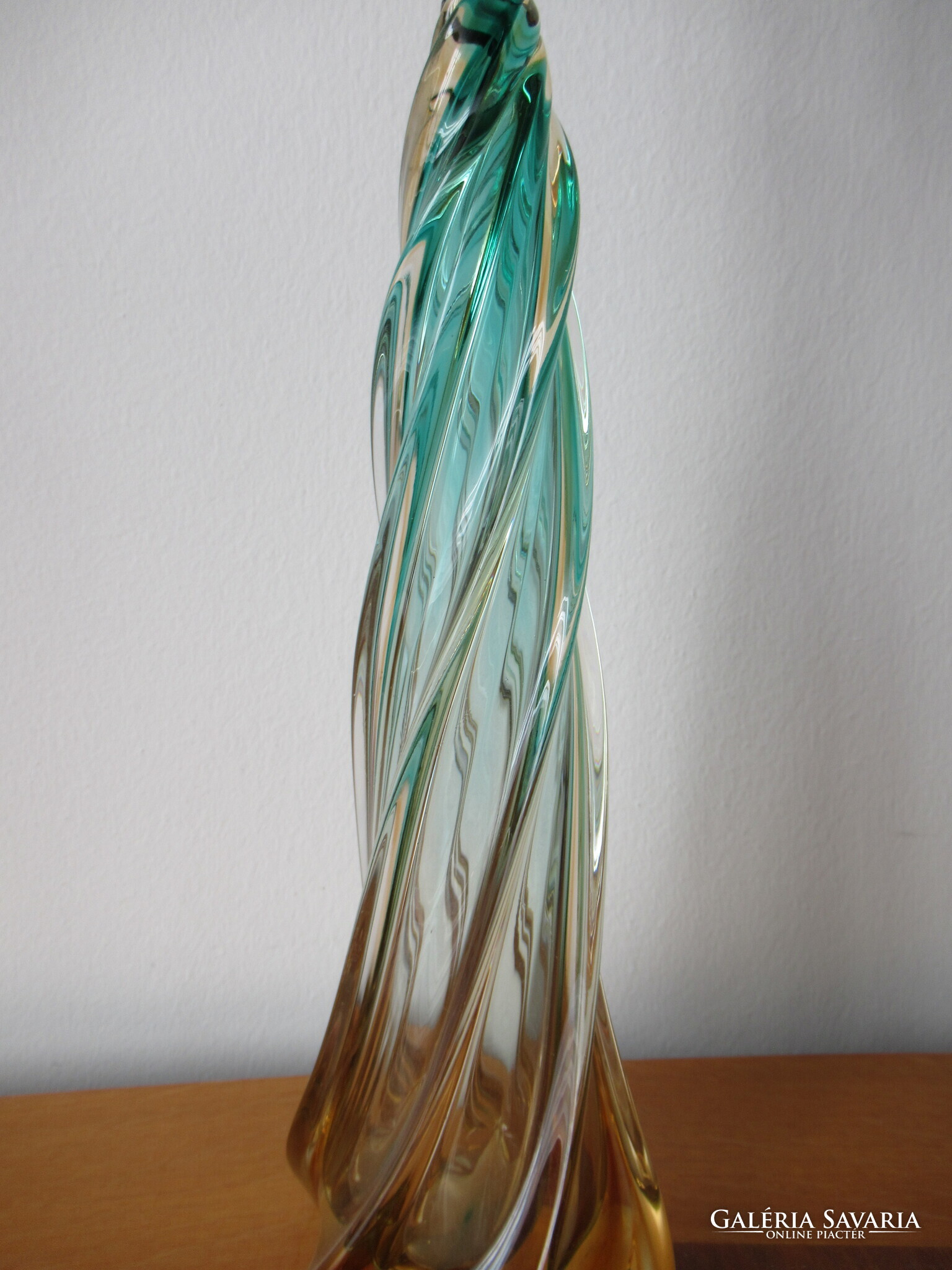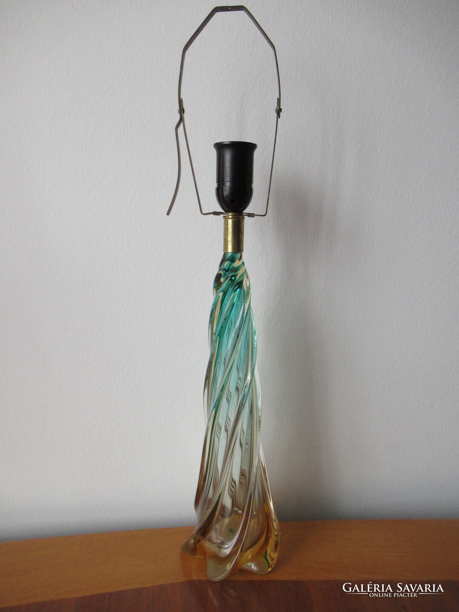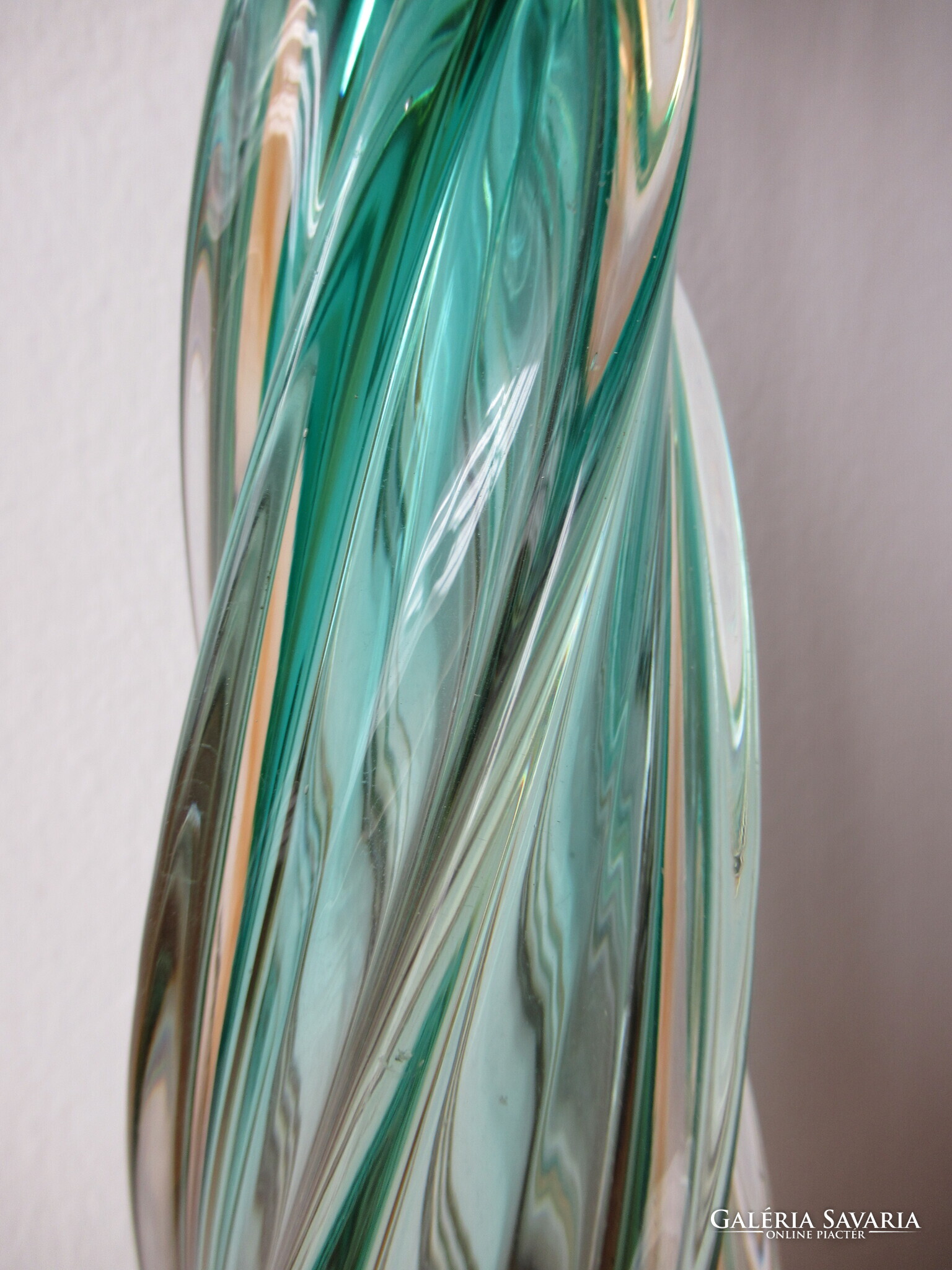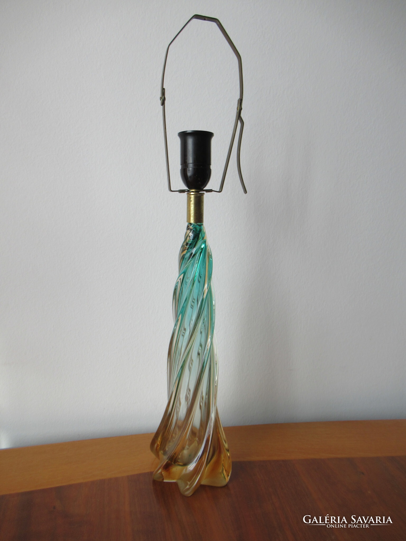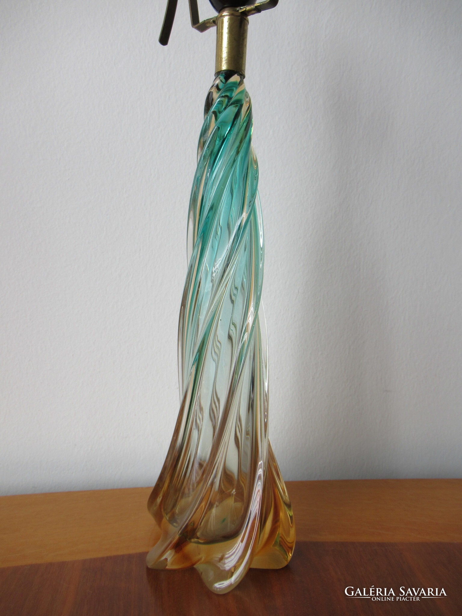 Gyönyörű állapotban levő, nagyméretű muránói üveg lámpatest, eredeti, réz tartozékaival. Kézzel készített, formába fújt, majd csavart, narancsos-zöldes színre színezett gyönyörű darab. Feltehetően Archimede Seguso (1909-1999) mester műhelyéből a 40-50-es évekből. A család nagyon régi, középkori eredetű üvegművész dinasztia. Csak az üveg magassága kb. 38 cm! Alja lapra csiszolt. A teljes üvegtest sérülés és lepattanásmentes. Oldalán a belső falon, vagy az üveganyagban nagyon finom, hálószerű valószínűen gyártási nyomokkal. A réz foglalattartón körben használati kopások vannak. A foglalat korának megfelelő, de működőképes állapotban van. Új vezetékezést, átvizsgálást igényel. Postázás egyeztetést igényel, díja a mindenkori díjszabás szerint. MPL csomagautomatába nem postázok!