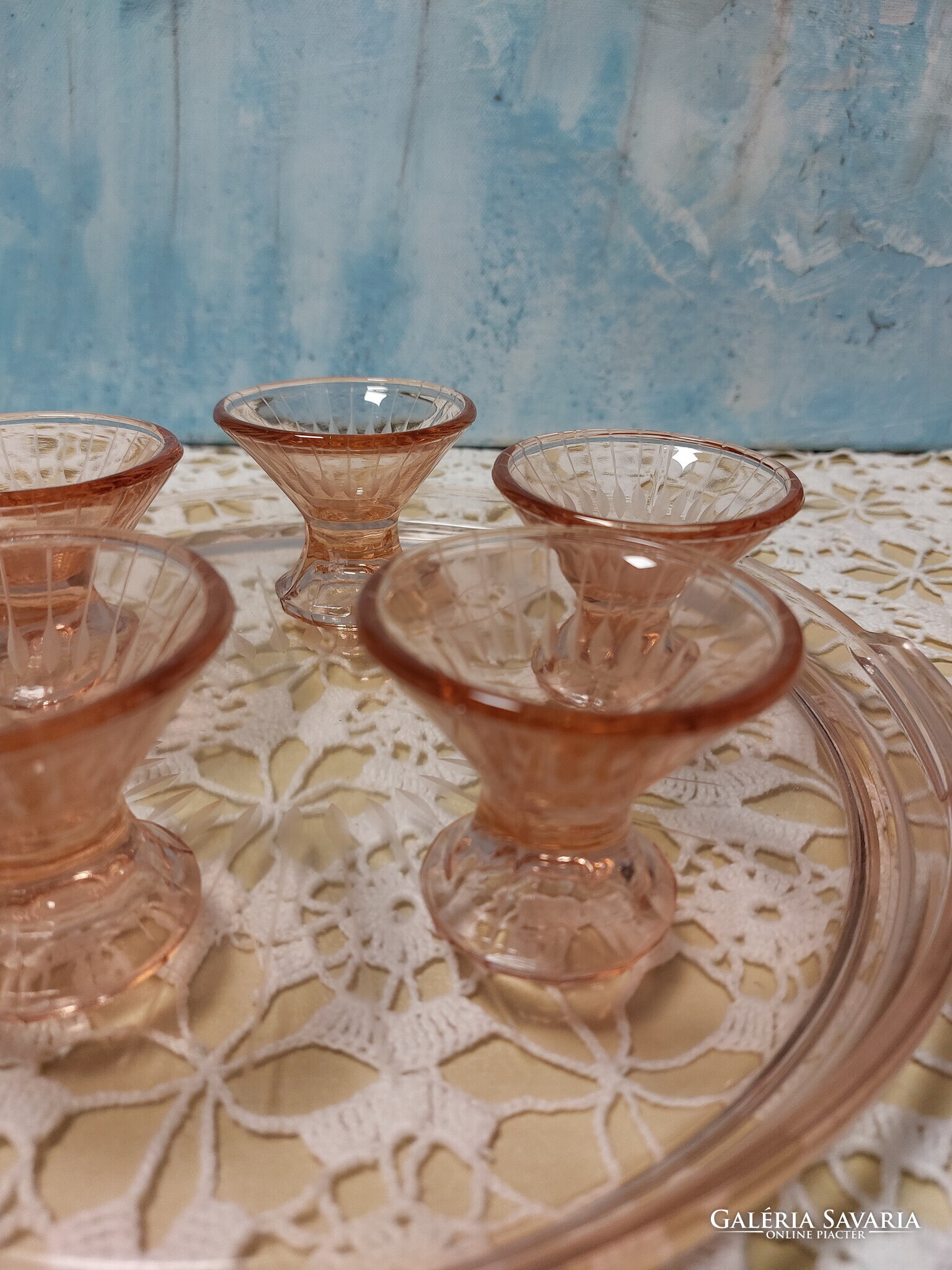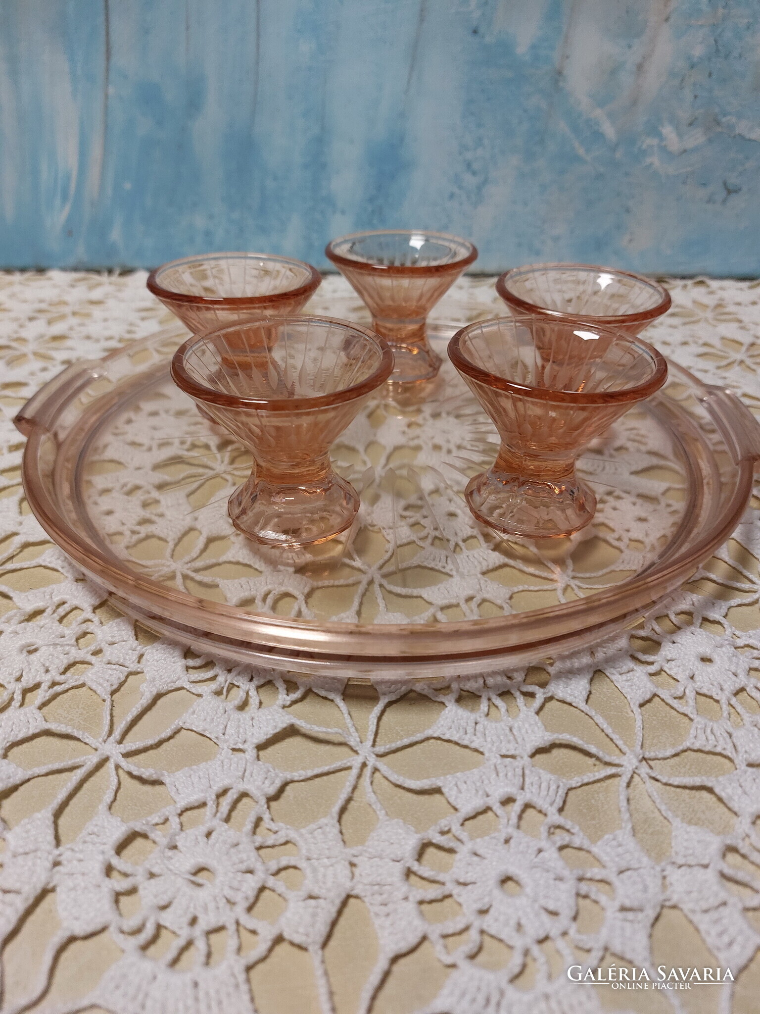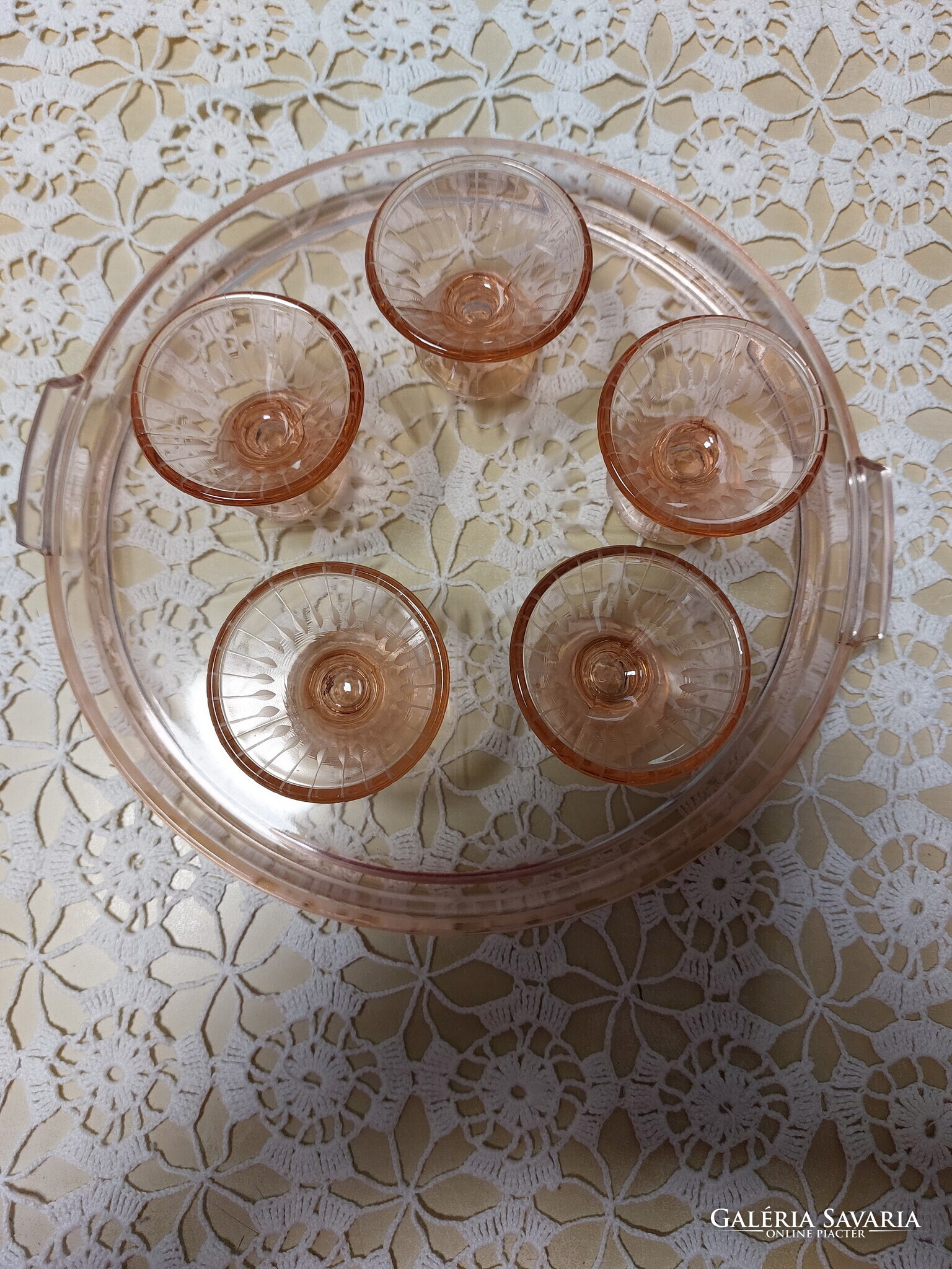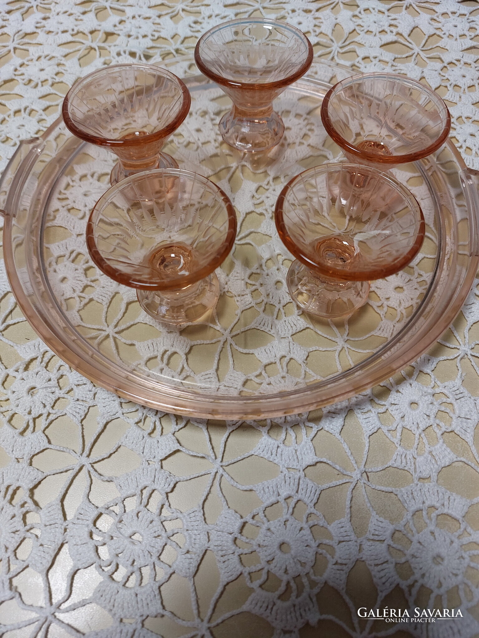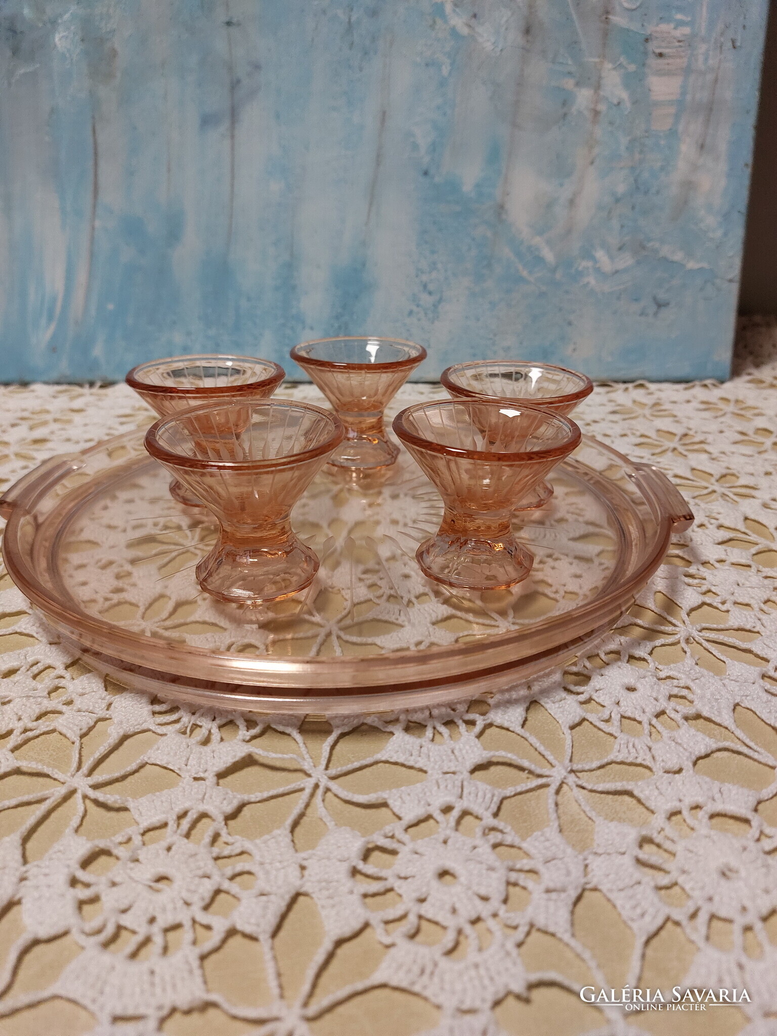 Lazac színű üveg tálca füllel, 5 db likőrös pohárral
